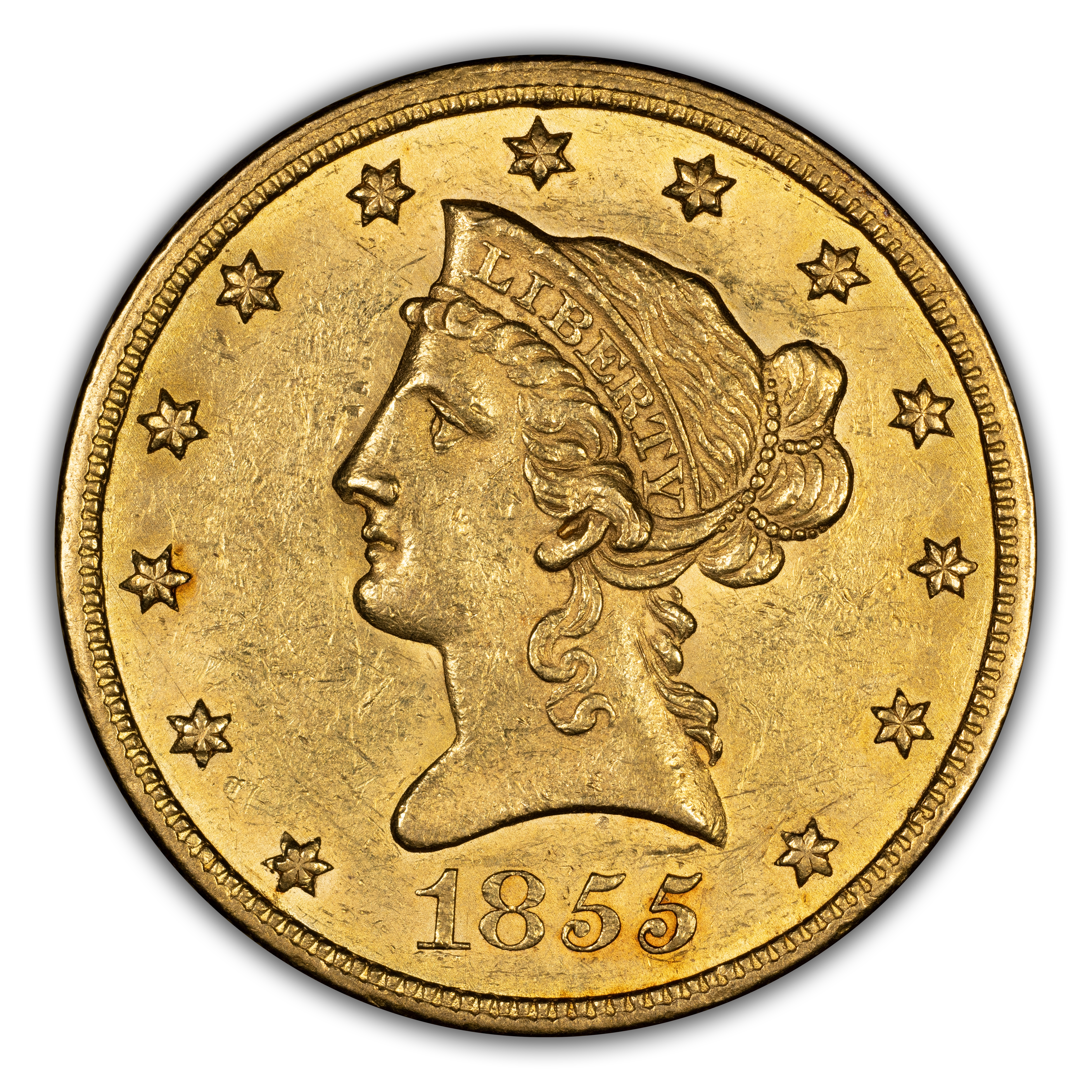 1855 $10 NGC AU55 - Desirable No Motto Eagle