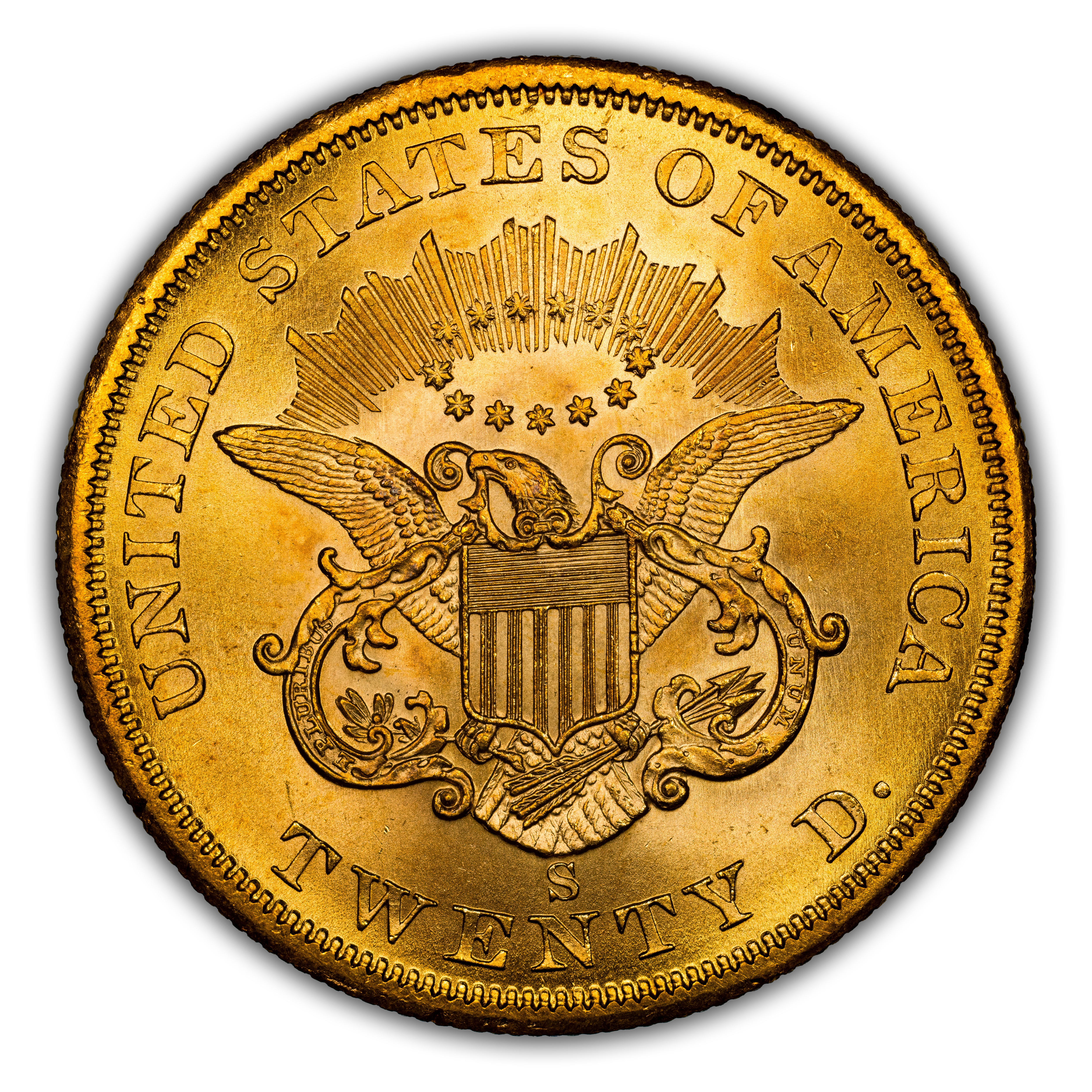 Reverse: Shielded eagle with wings outstretched holding arrows and olive branches. The words UNITED STATES OF AMERICA * TWENTY D. appear around the periphery. Mint mark, if any, appears below the eagle's tail, above the N in TWENTY.