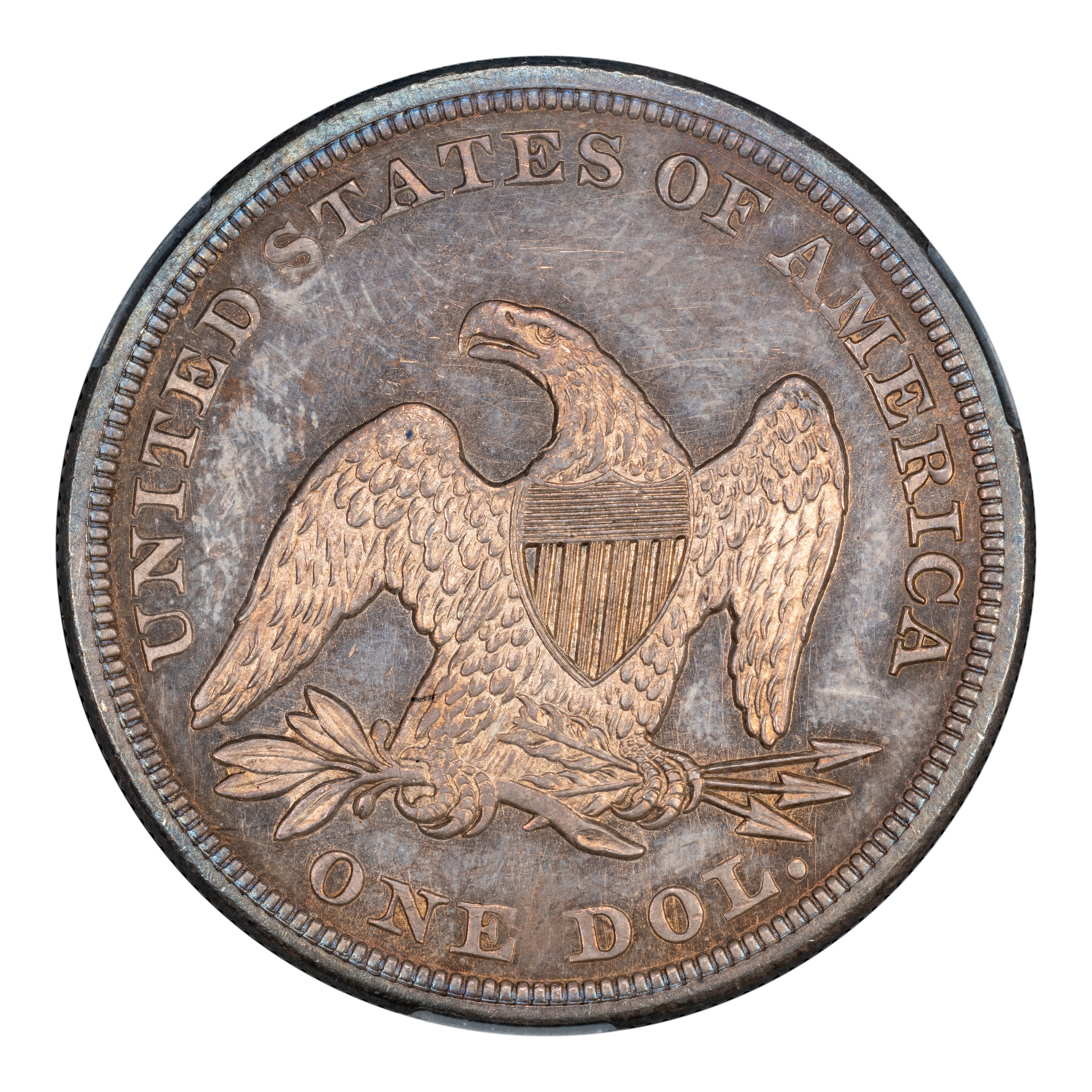 Reverse: The heraldic eagle is centered in the design with the words UNITED STATES OF AMERICA and ONE DOL. around the periphery.