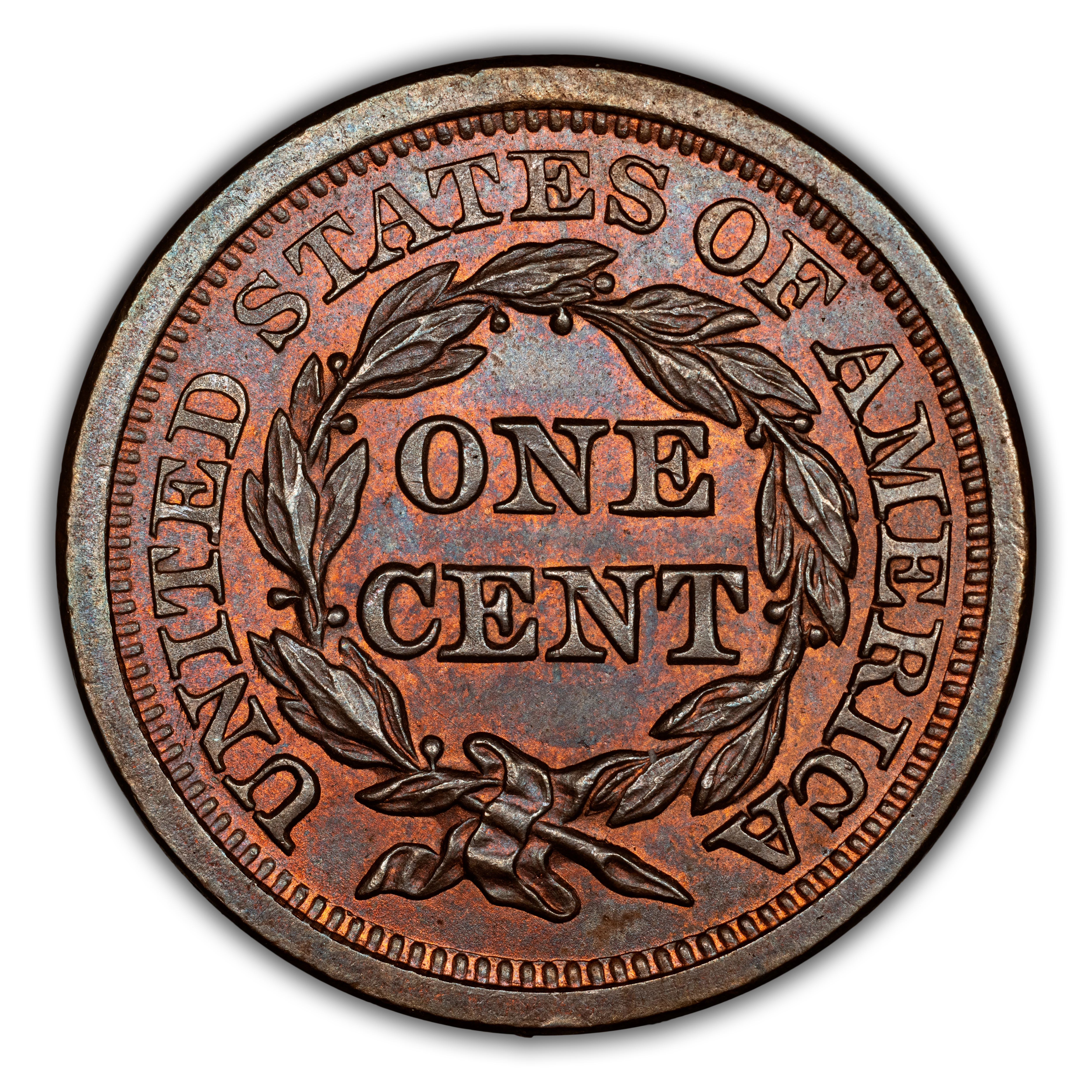 Reverse: The words UNITED STATES OF AMERICA around the periphery surround a wreath framing the words ONE CENT. The wreath is tied by a bow at the bottom.