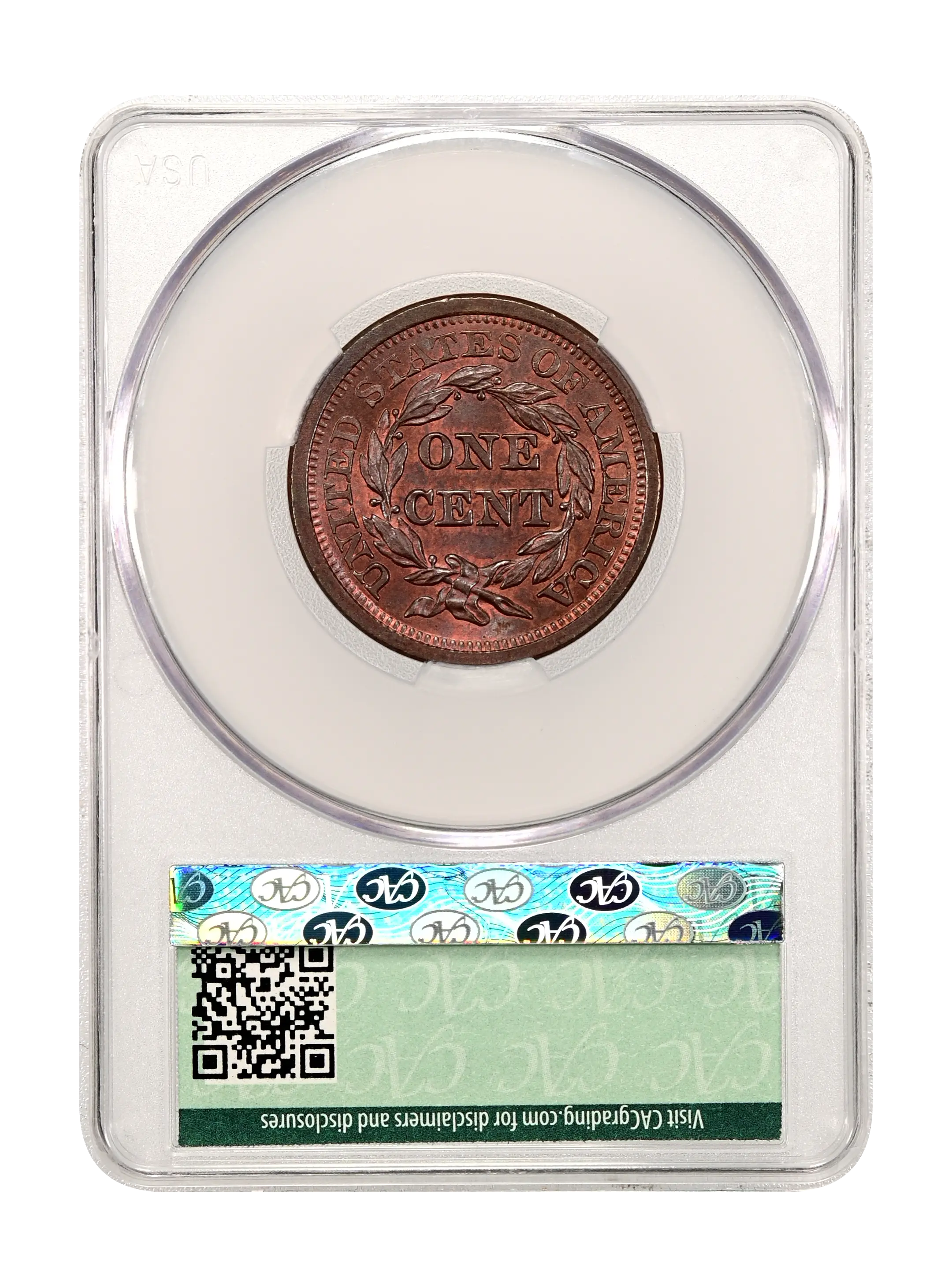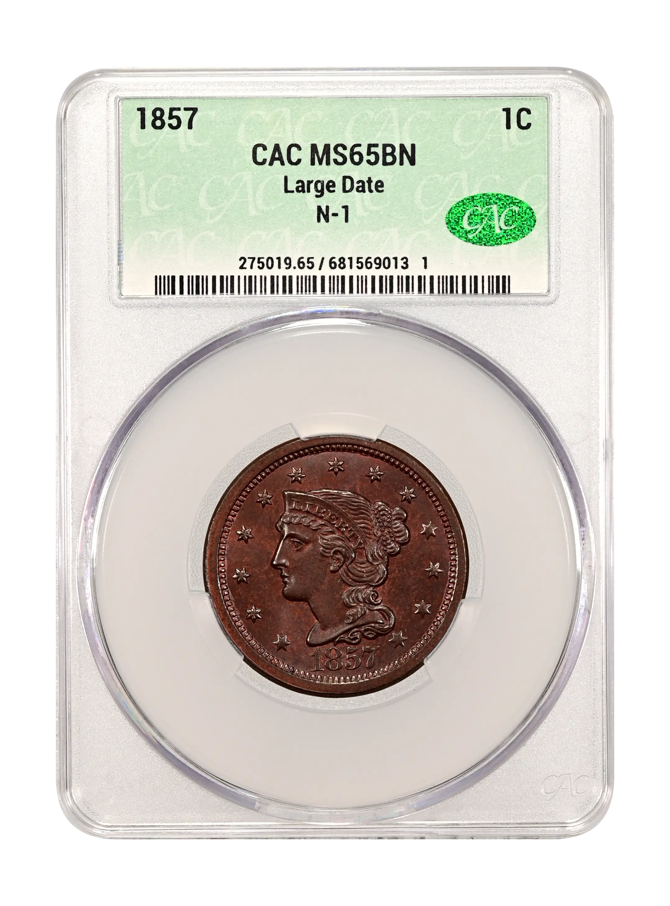1857 Large Date 1c N-1 BN CAC MS65BN