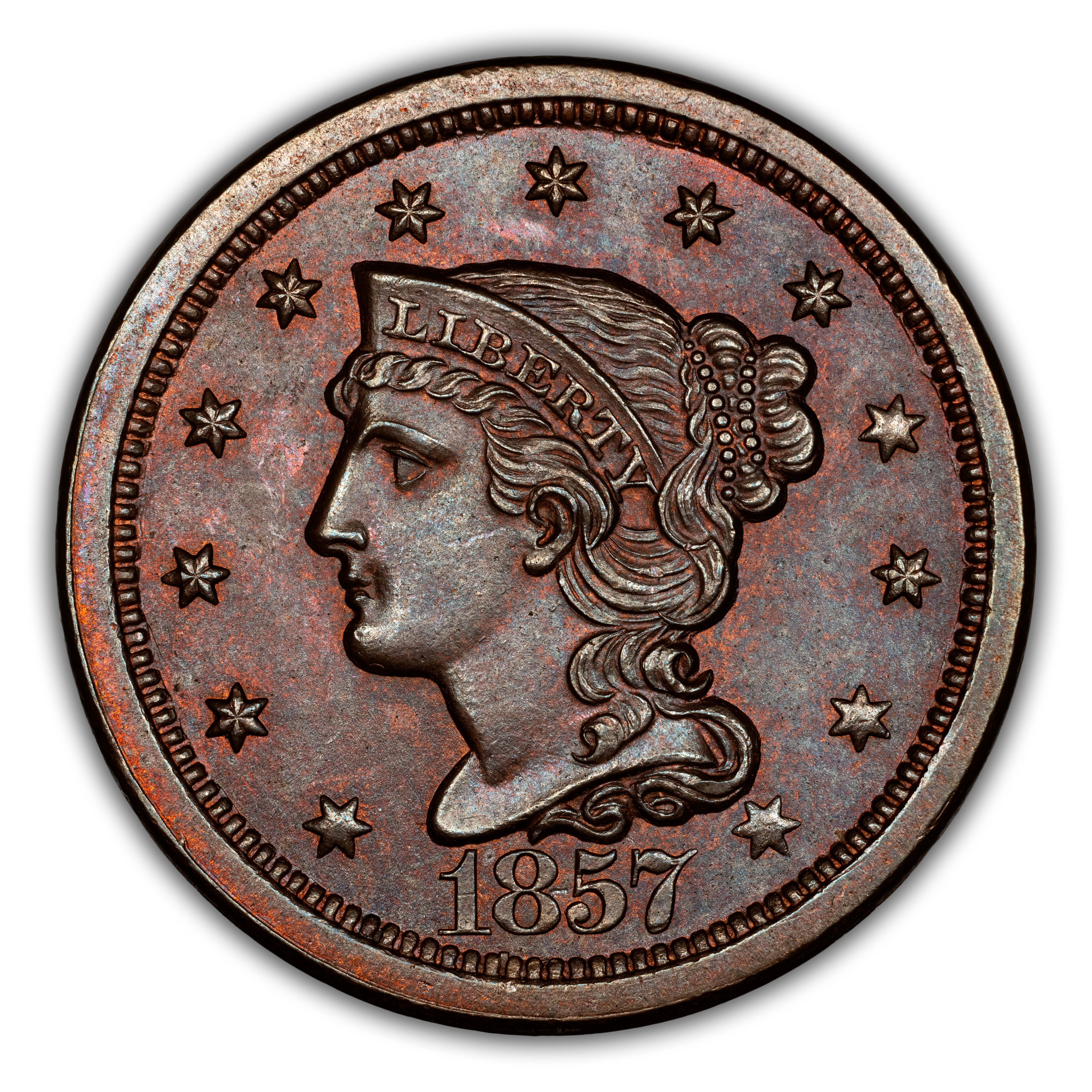 Large date variety. The last year of issue for the large cent type and a relatively low-mintage date owing to the fact that the U.S. Mint had widely been circulating the new, smaller flying eagle cents. Over 17 million flying eagles were struck in 1857 compared to just 333 thousand large cents.