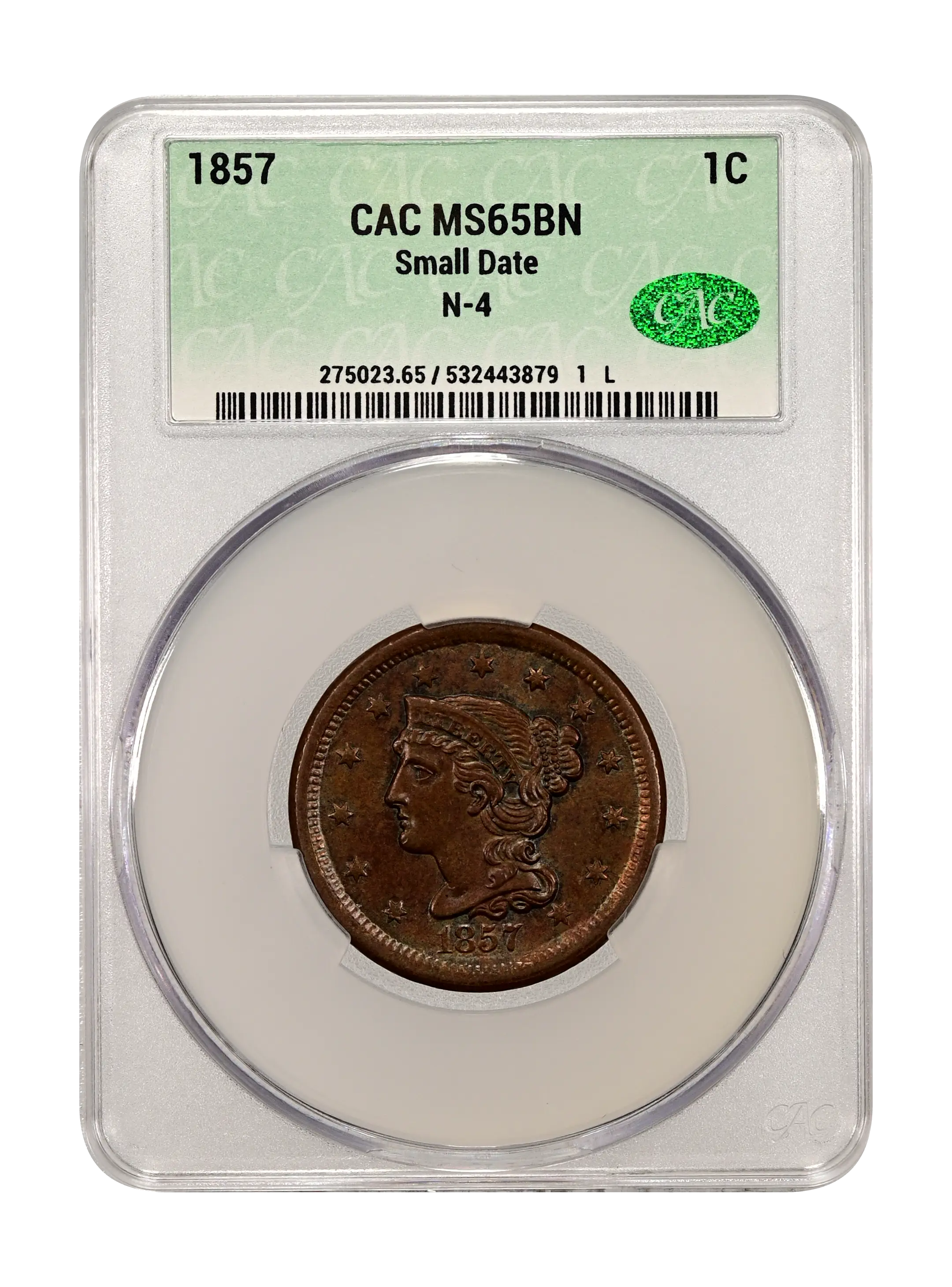 1857 1C Small Date, N-4, R.1, MS65 Brown NGC. CAC. CAC Population: (1/0). ...