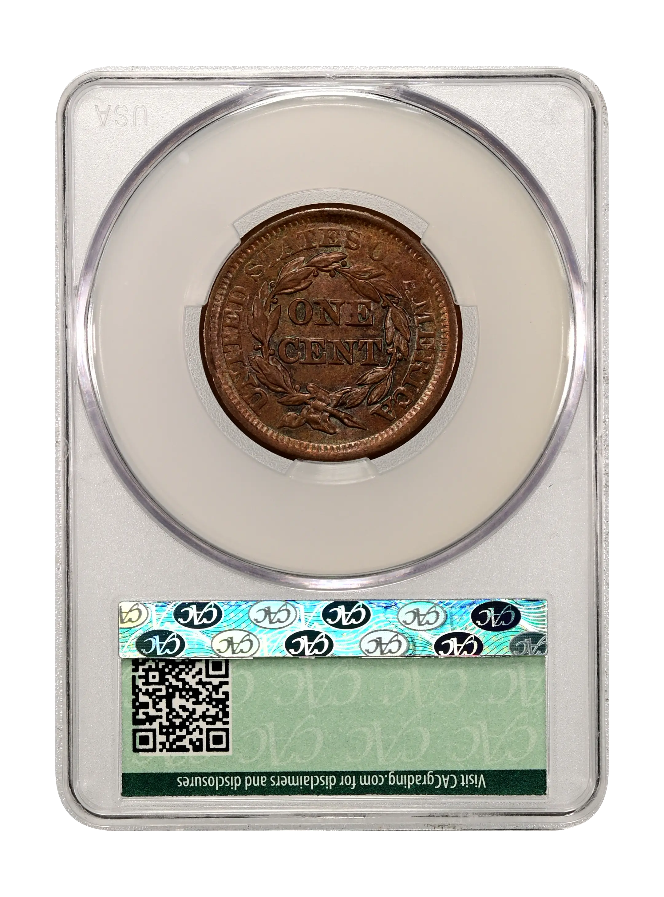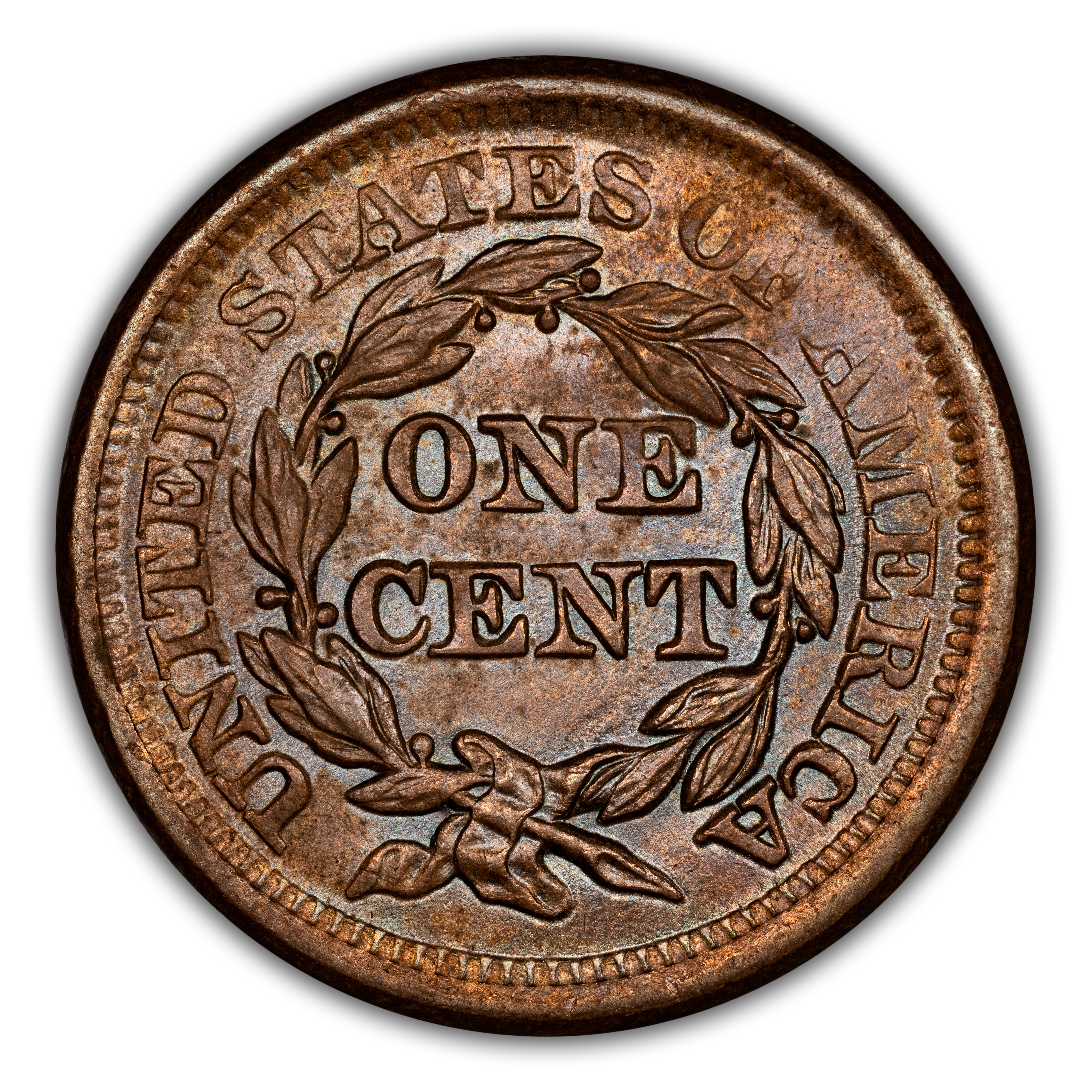 Reverse: The words UNITED STATES OF AMERICA around the periphery surround a wreath framing the words ONE CENT. The wreath is tied by a bow at the bottom.