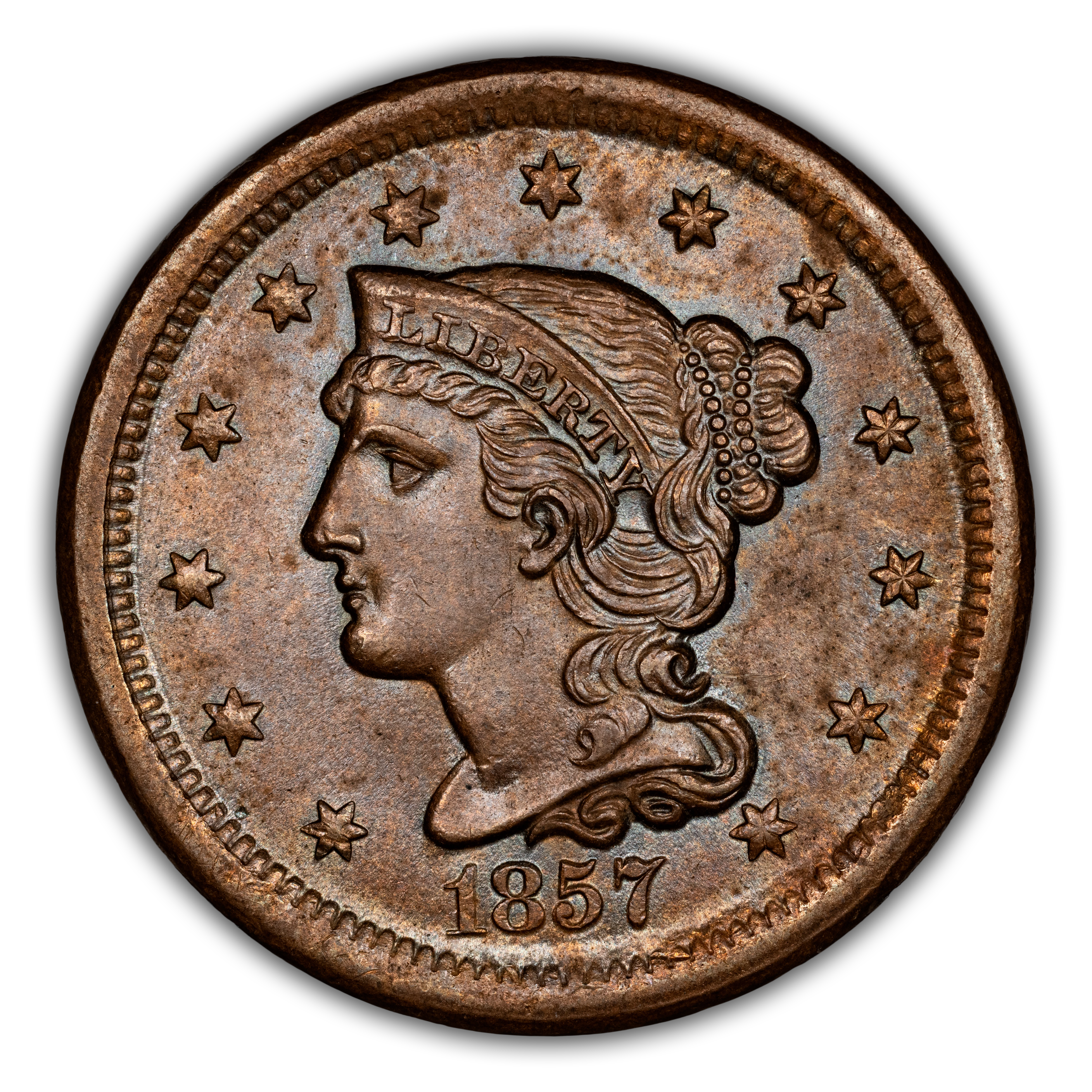 Small date variety. The last year of issue for the large cent type and a relatively low-mintage date owing to the fact that the U.S. Mint had widely been circulating the new, smaller flying eagle cents. Over 17 million flying eagles were struck in 1857 compared to just 333 thousand large cents.