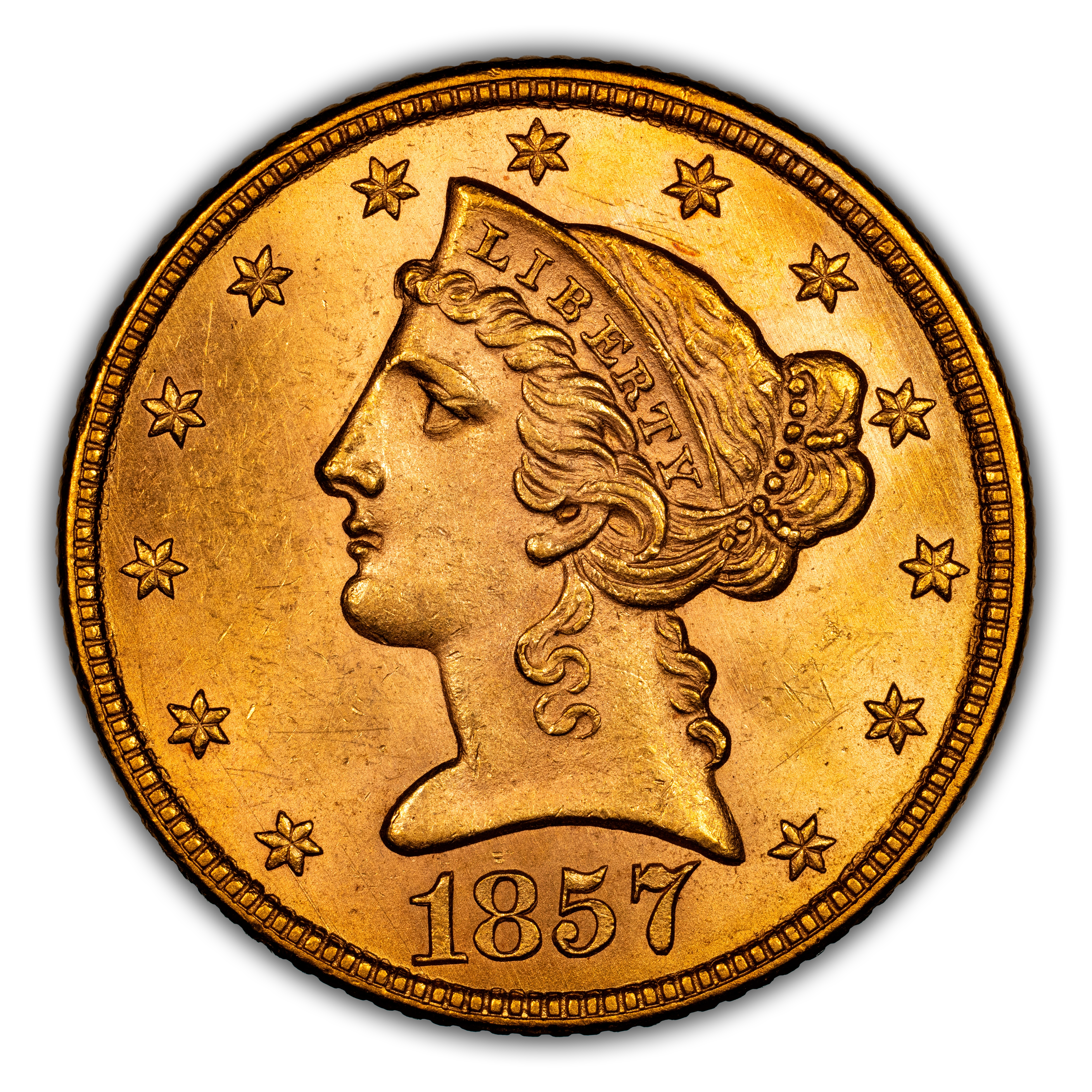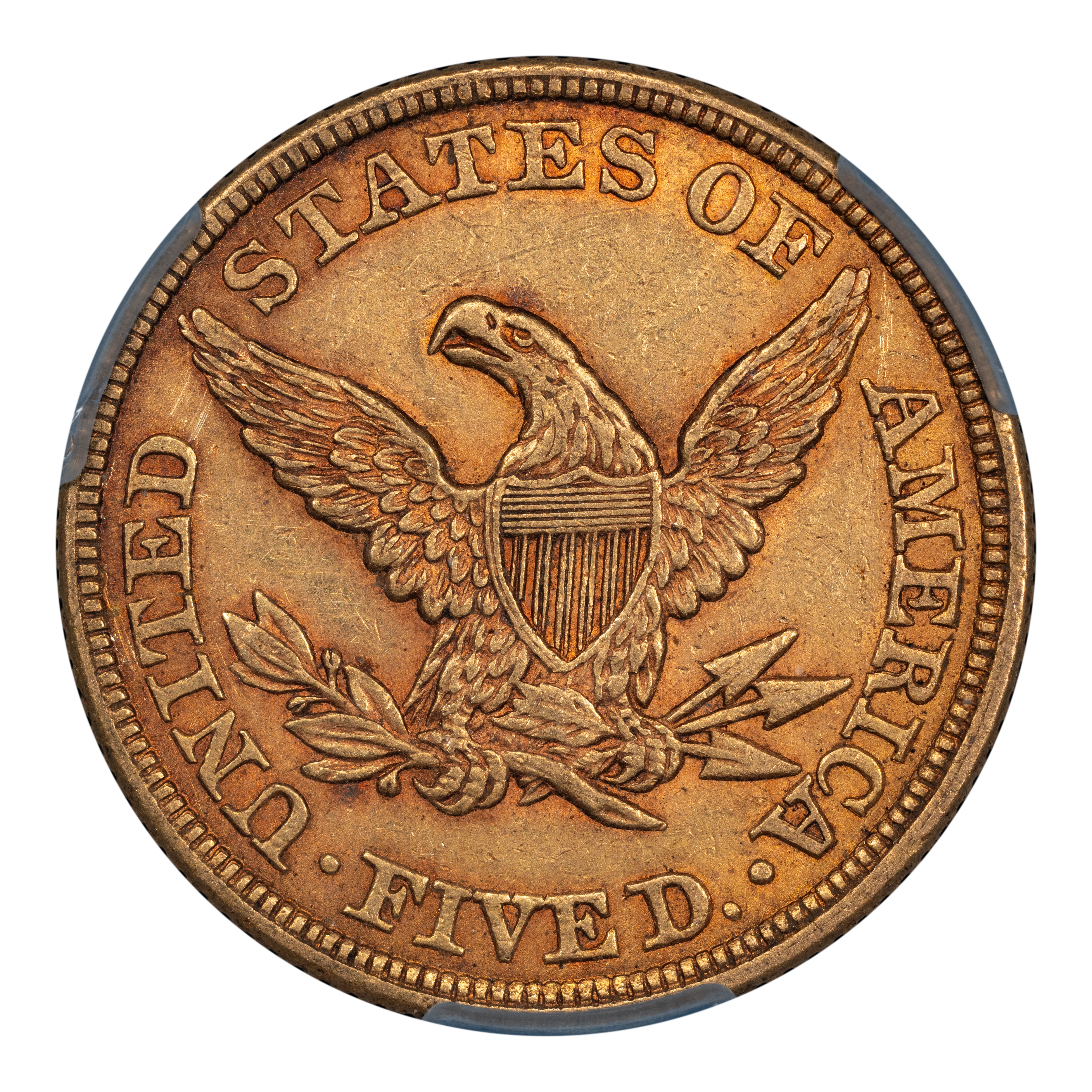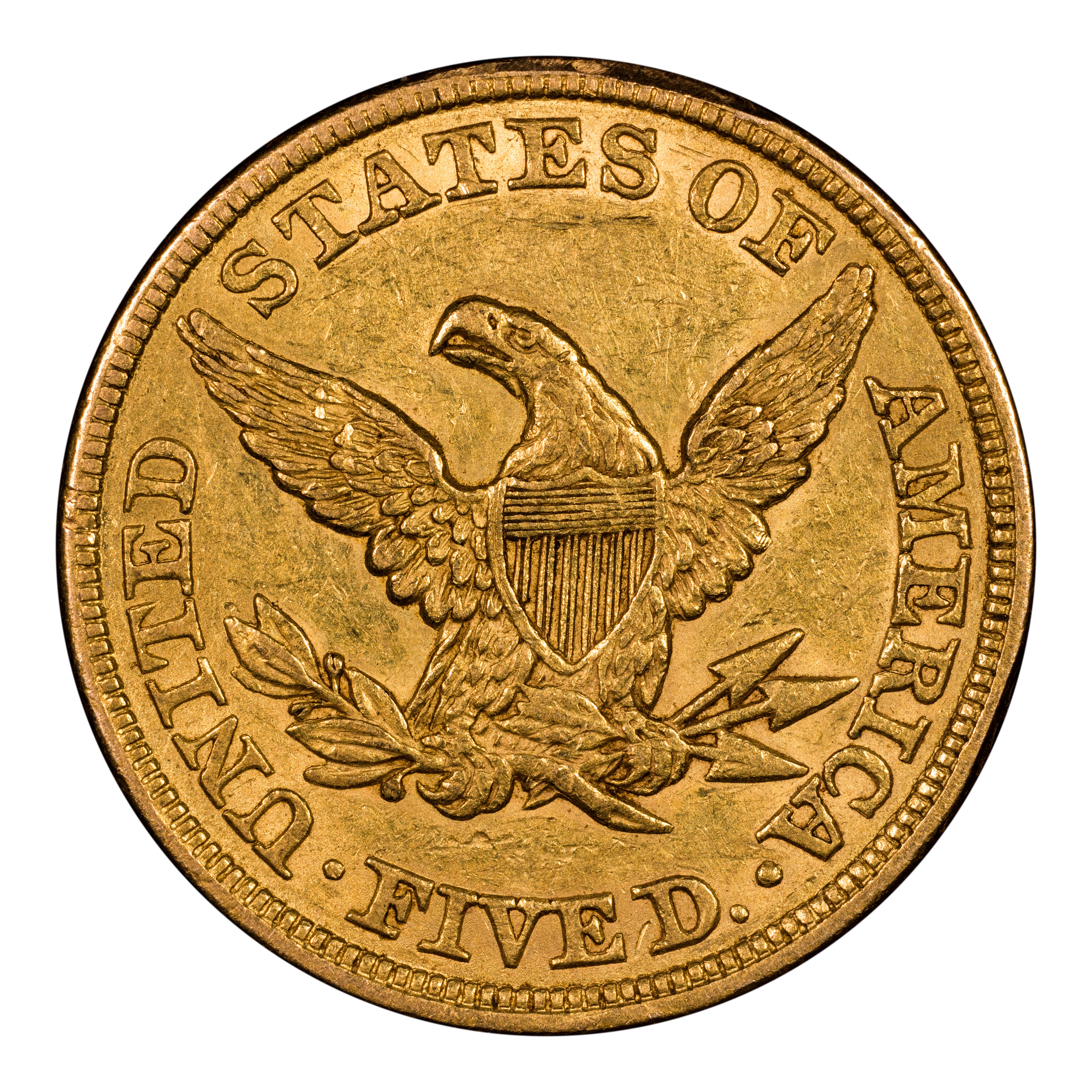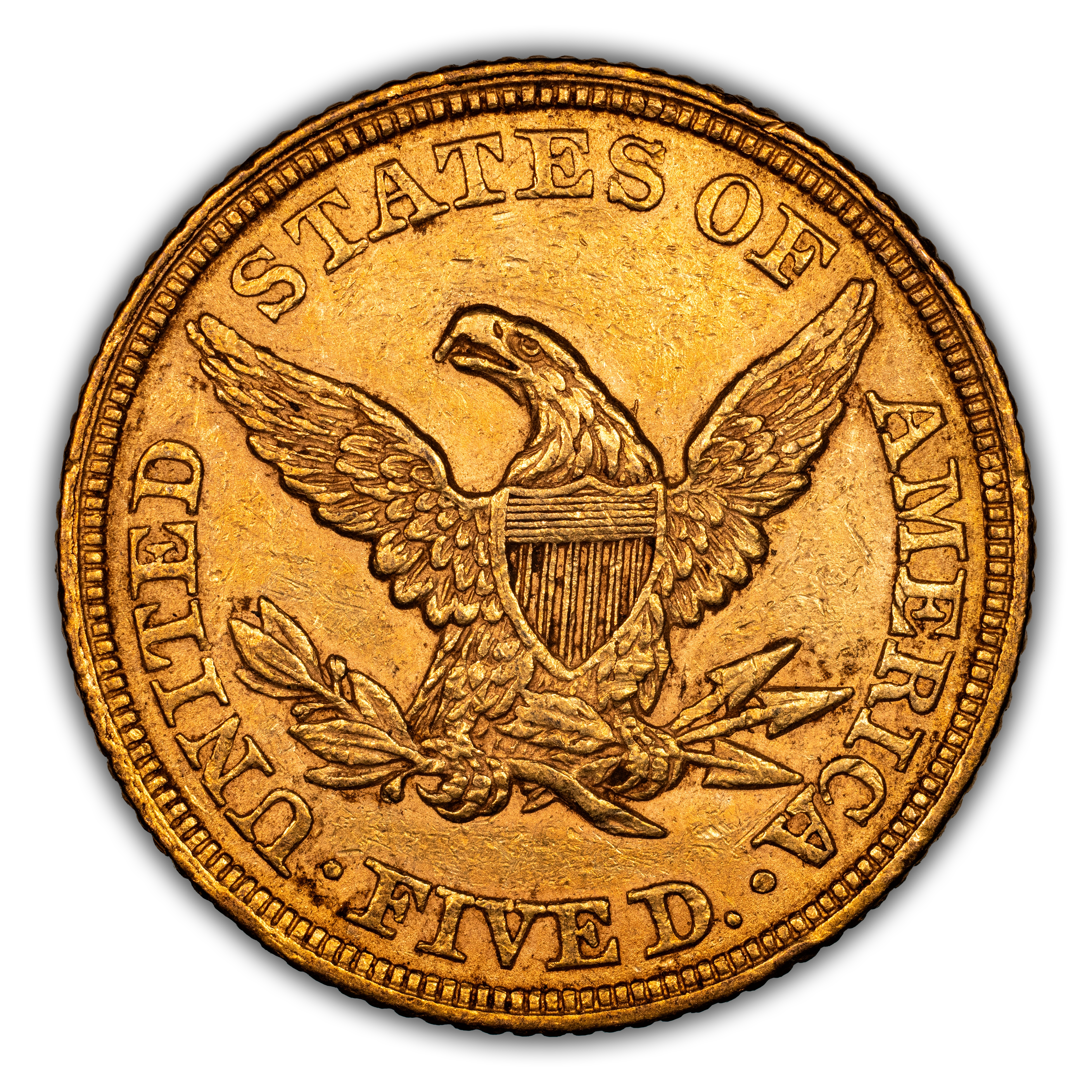 Reverse: Heraldic eagle holding arrows and branch in its claws is centered in the design with the words UNITED STATES OF AMERICA * FIVE D. around the periphery. Mintmark (if any) is located under the eagle's claws.