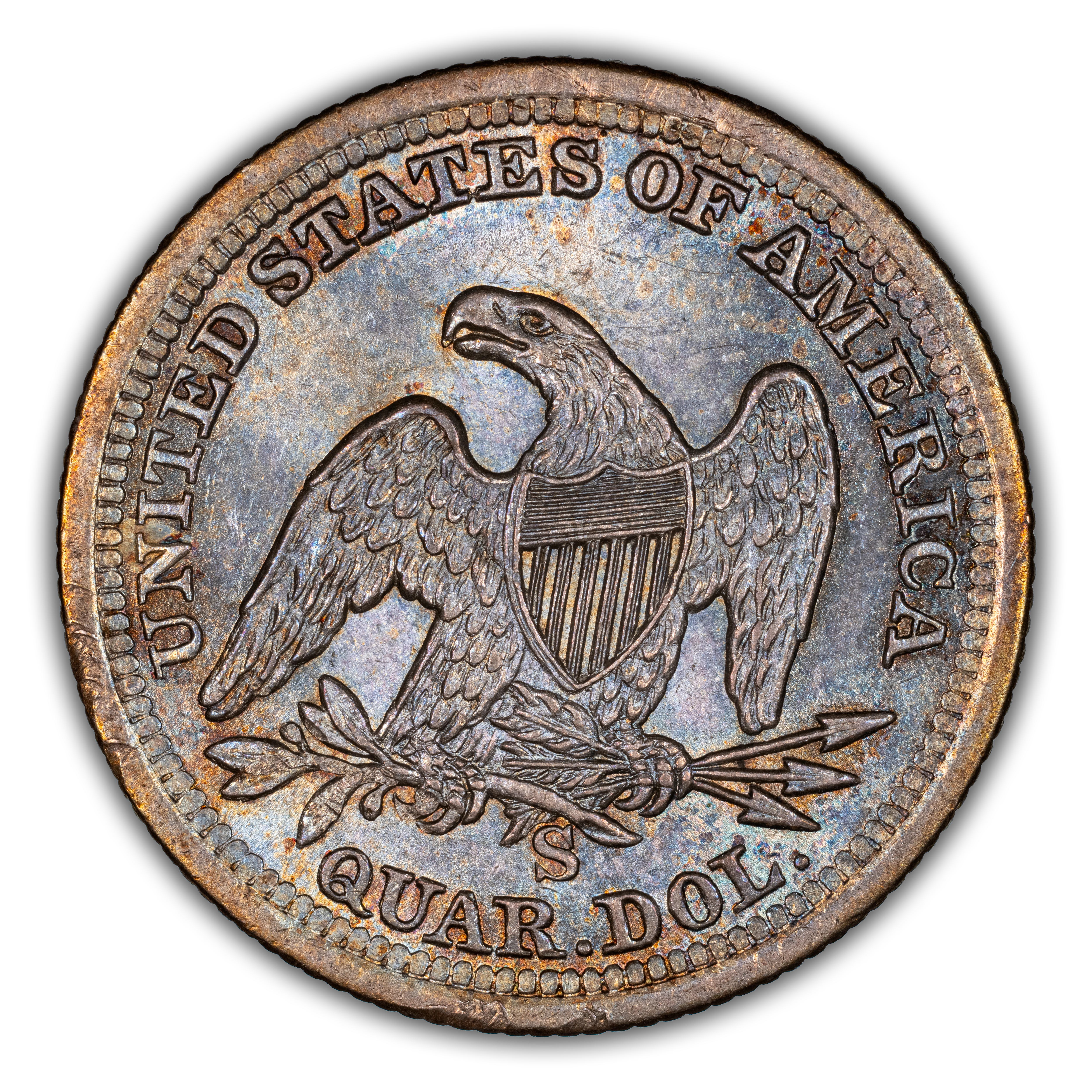 Reverse: The heraldic eagle is centered in the design with the words UNITED STATES OF AMERICA and QUAR. DOL. around the periphery.