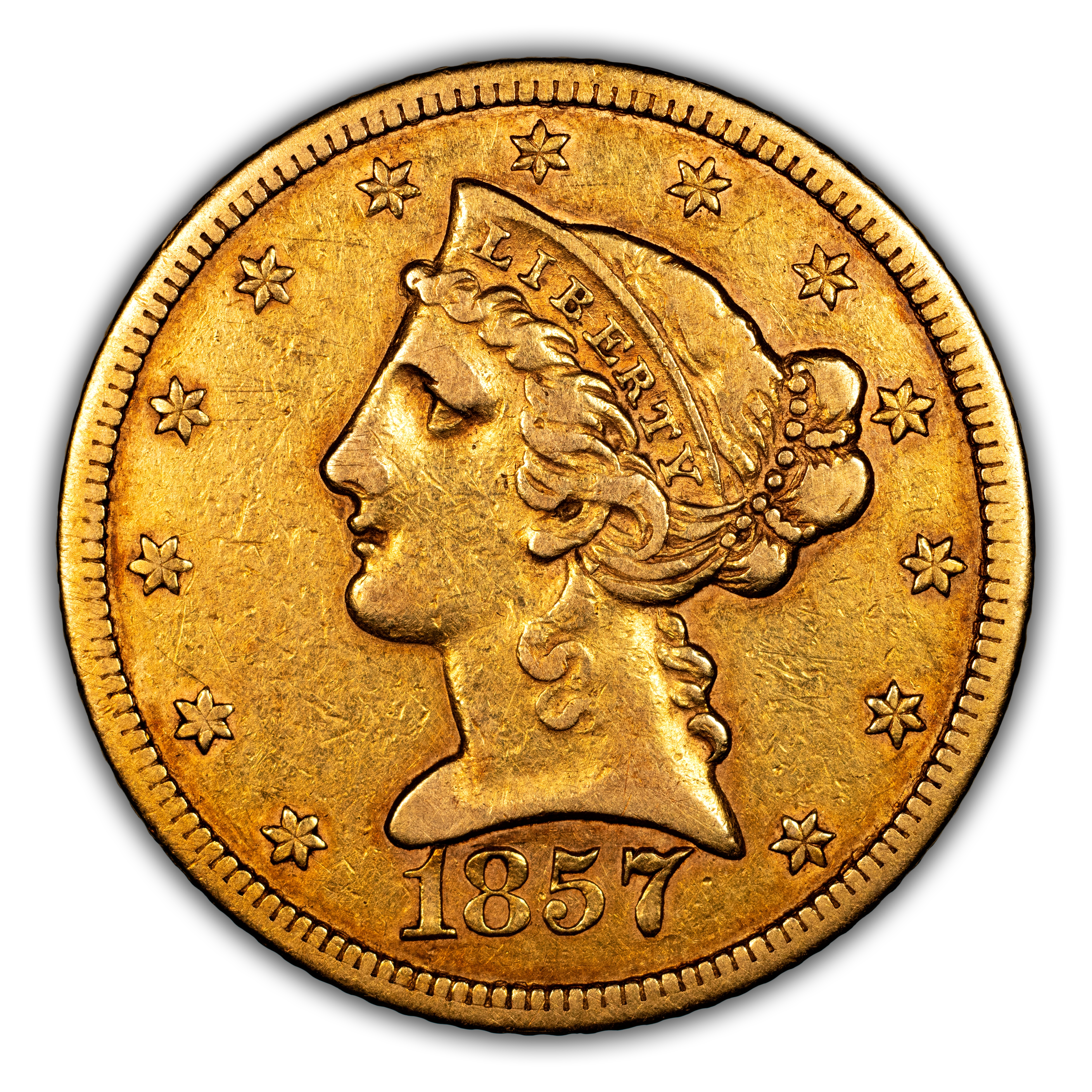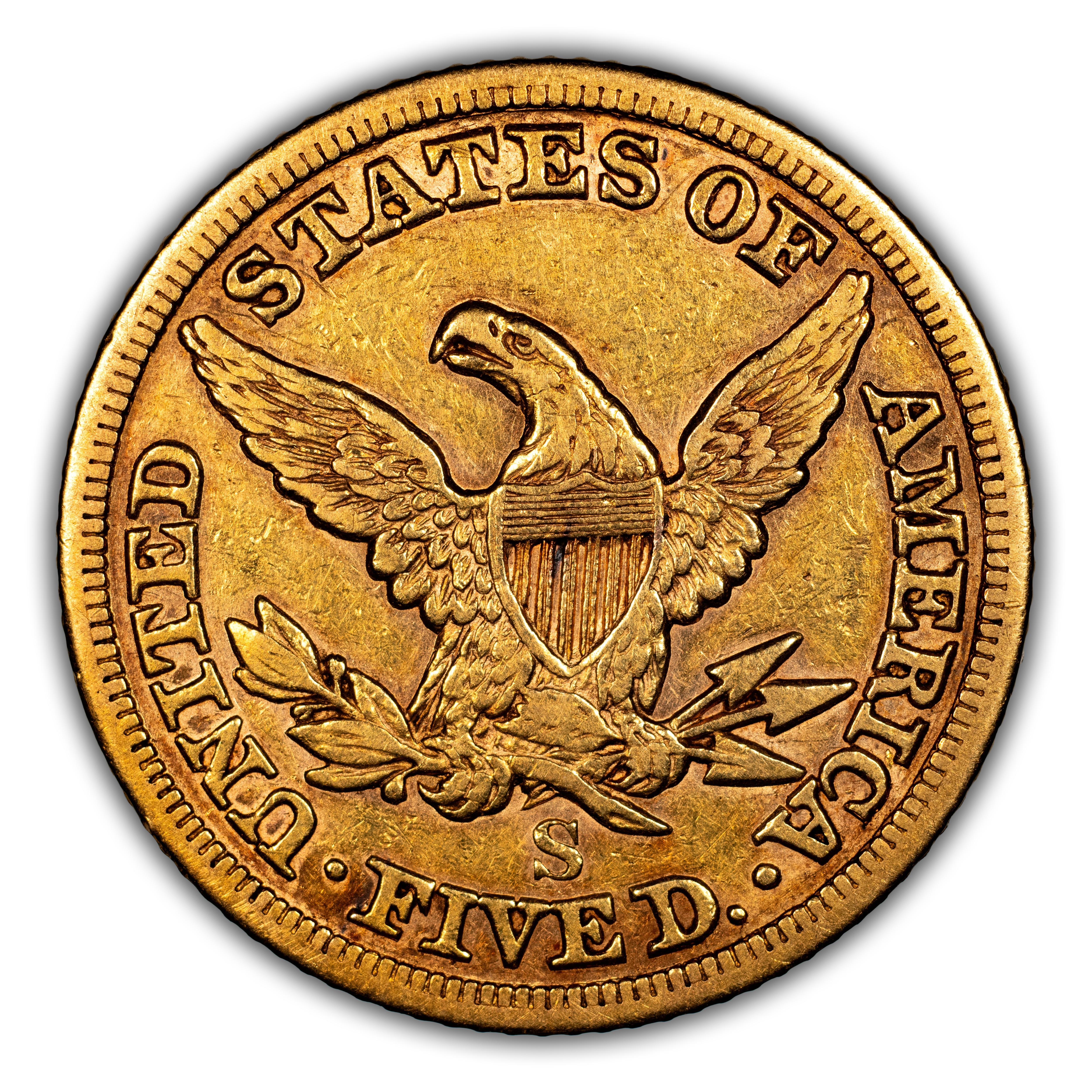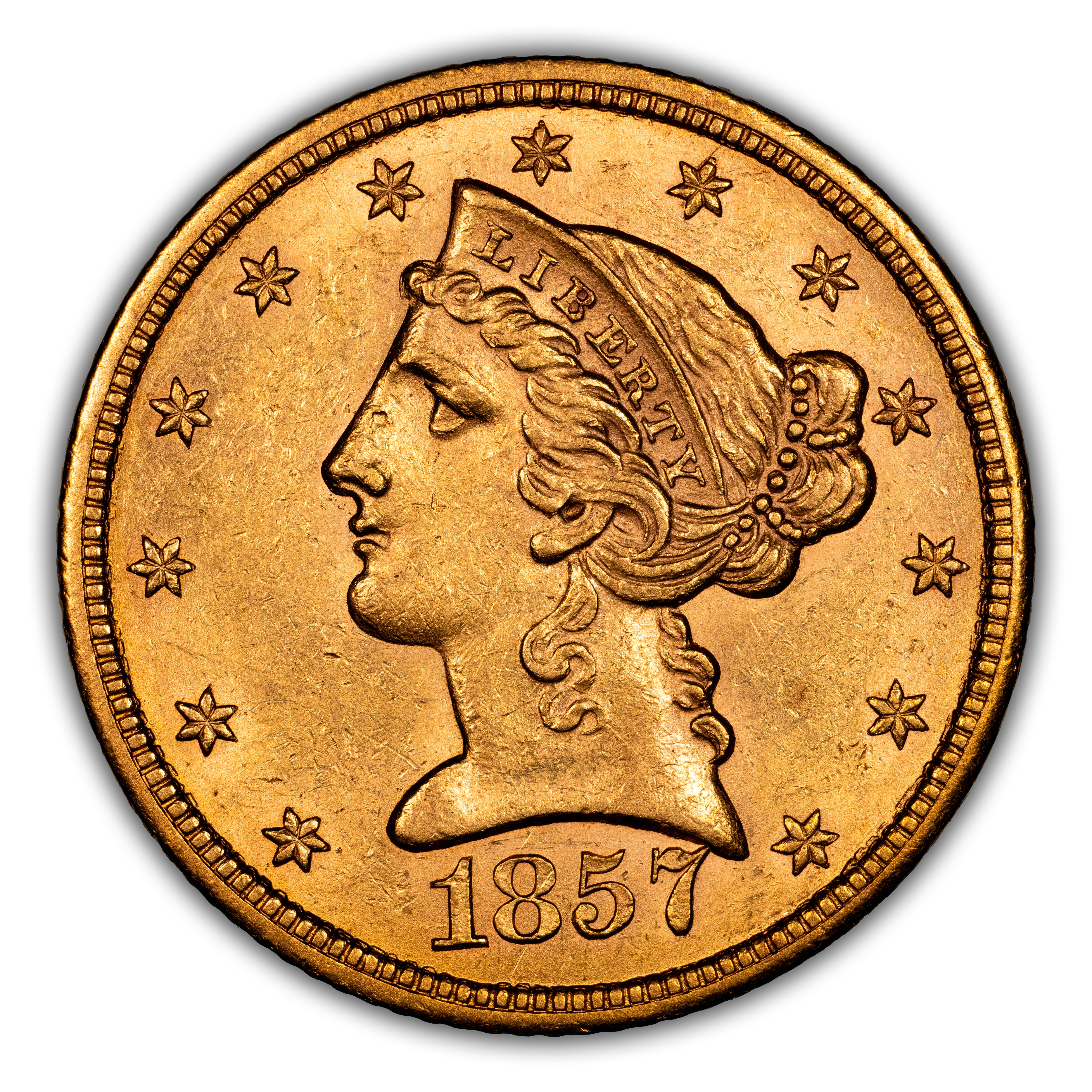 1857-S $5 AU55 PCGS. PCGS Population: (14/33 and 0/0+). NGC Census: (21/31 and 0/0+). CDN: $1,325 Whsle. Bid for NGC/PCGS A...