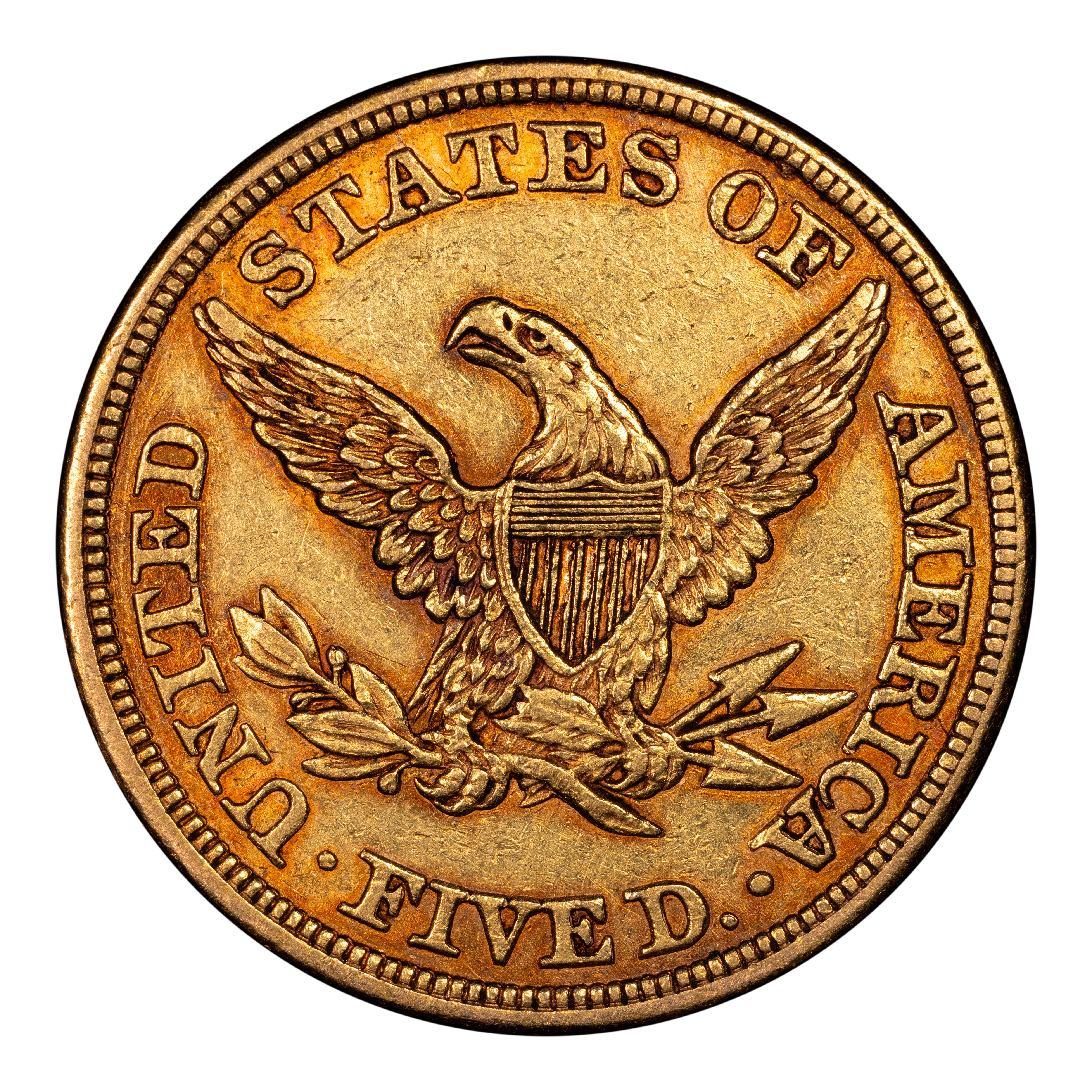 Reverse: Heraldic eagle holding arrows and branch in its claws is centered in the design with the words UNITED STATES OF AMERICA * FIVE D. around the periphery. Mintmark (if any) is located under the eagle's claws.