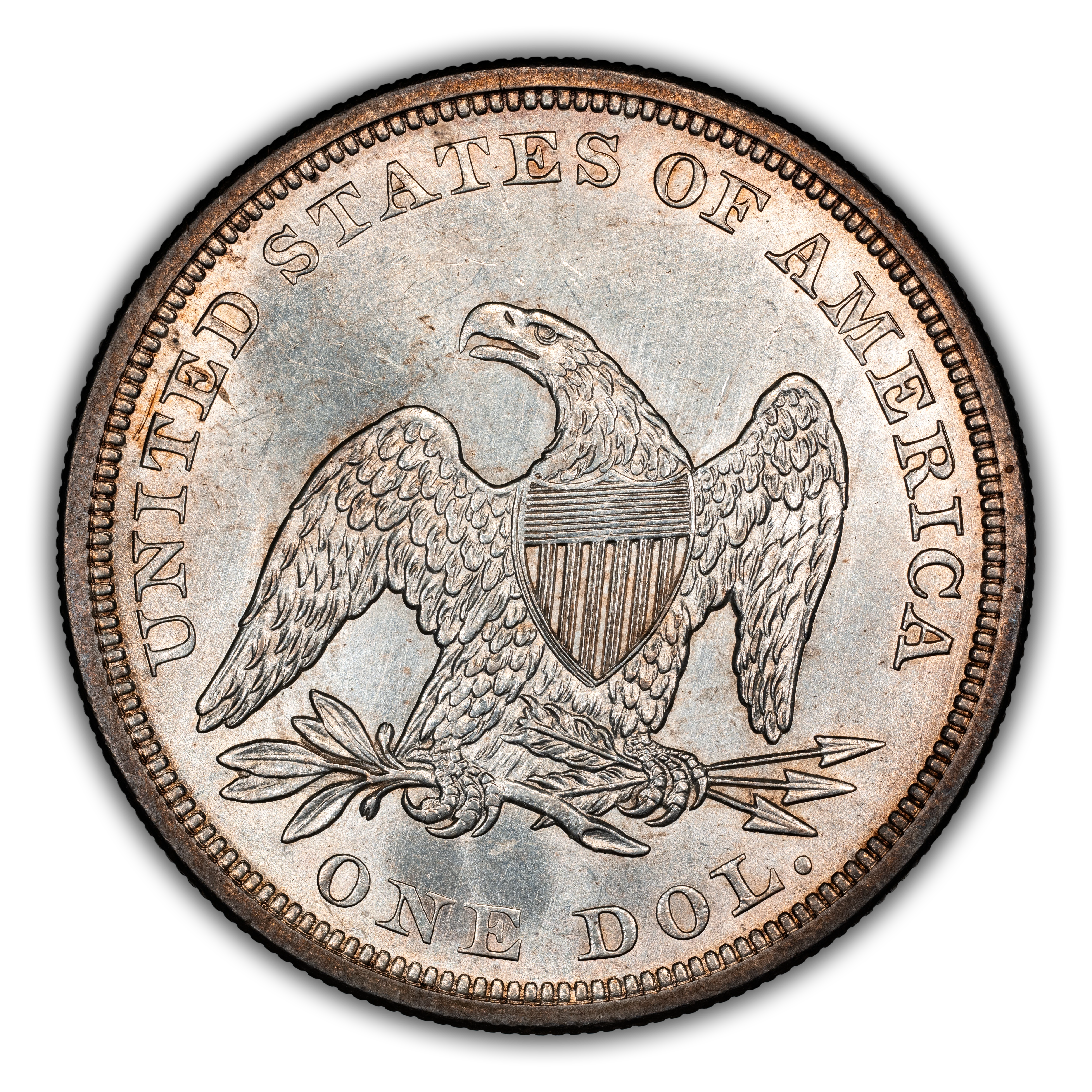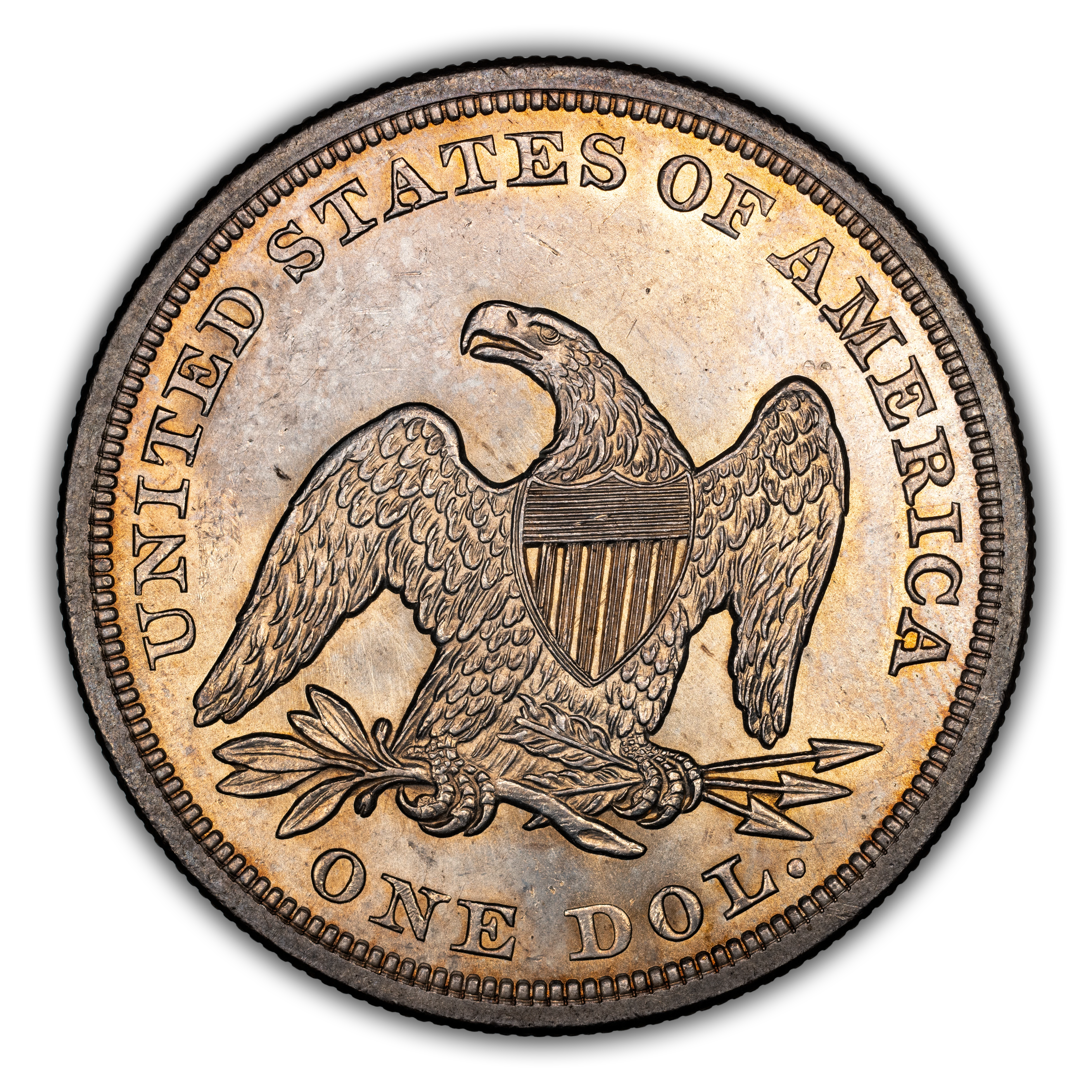Reverse: The heraldic eagle is centered in the design with the words UNITED STATES OF AMERICA and ONE DOL. around the periphery.