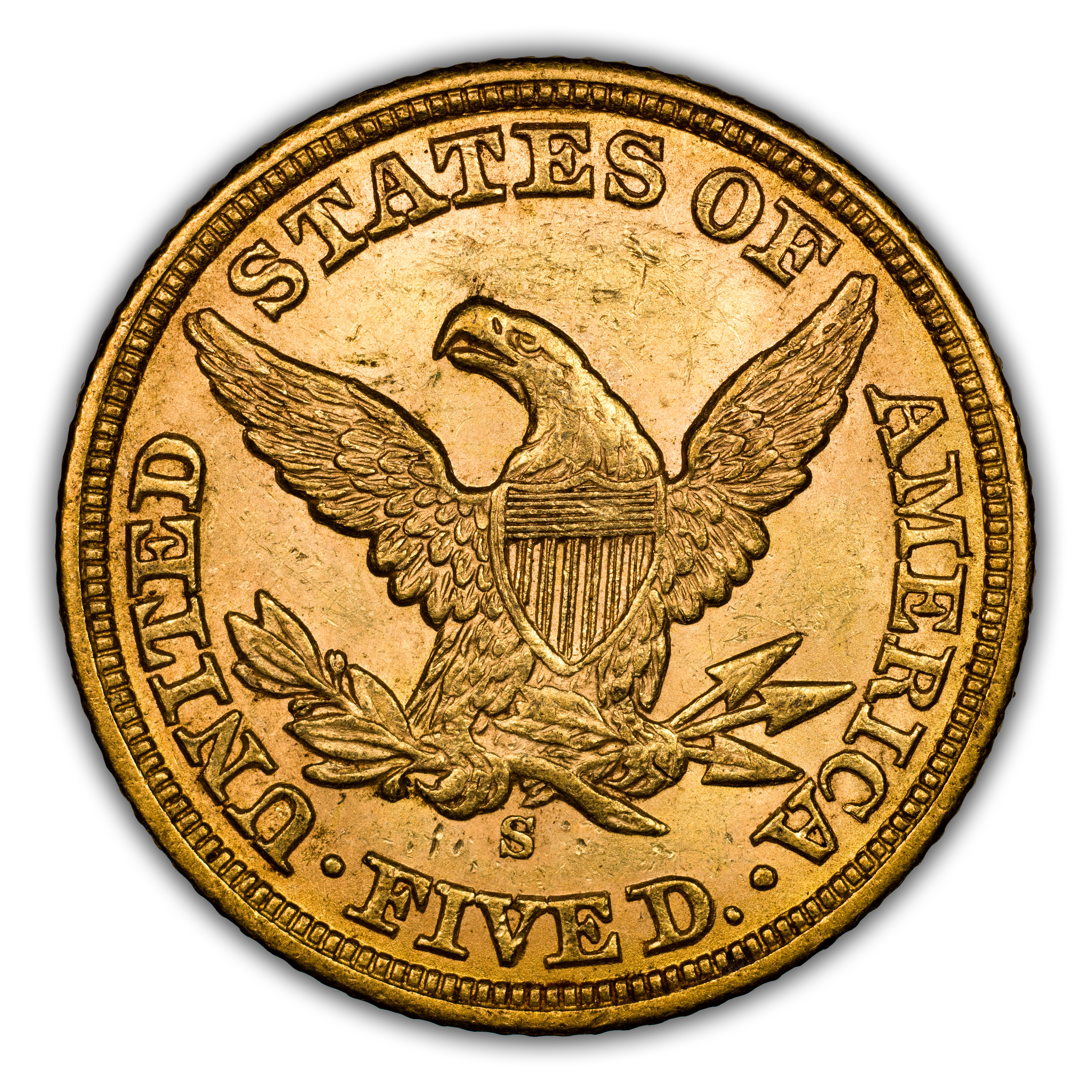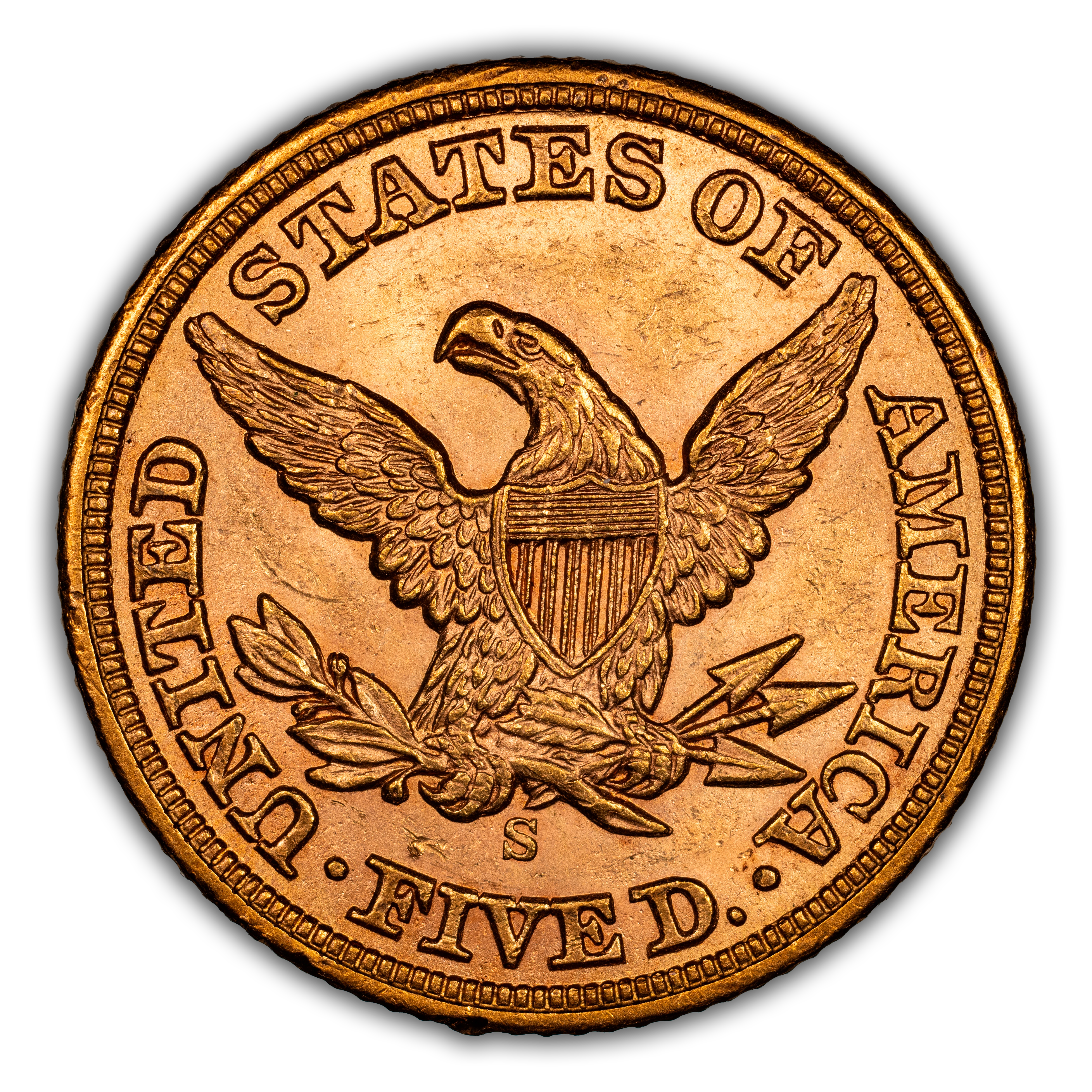 Reverse: Heraldic eagle holding arrows and branch in its claws is centered in the design with the words UNITED STATES OF AMERICA * FIVE D. around the periphery. Mintmark (if any) is located under the eagle's claws.
