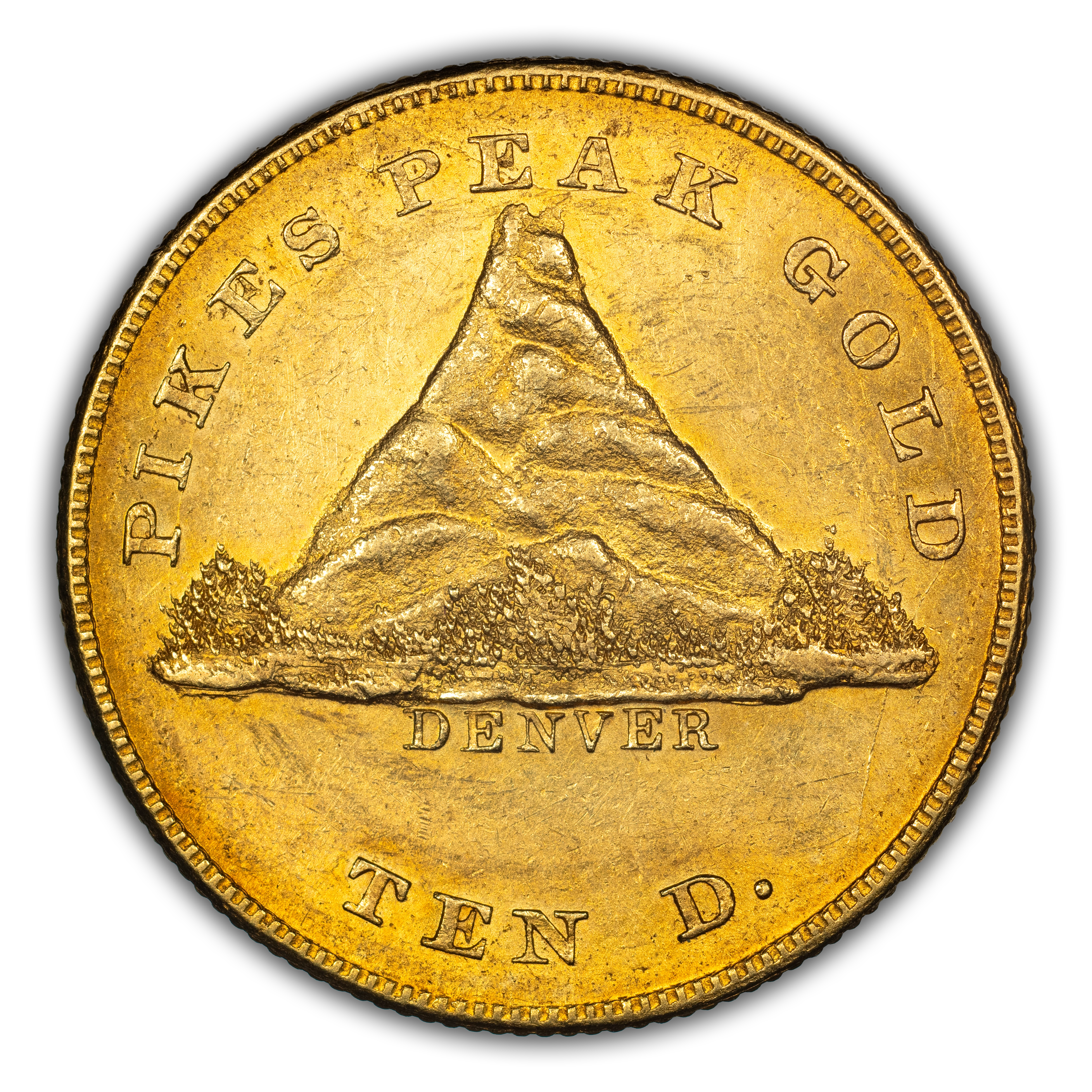Obverse: Mountain above DENVER encircled by PIKES PEAK GOLD TEN D.