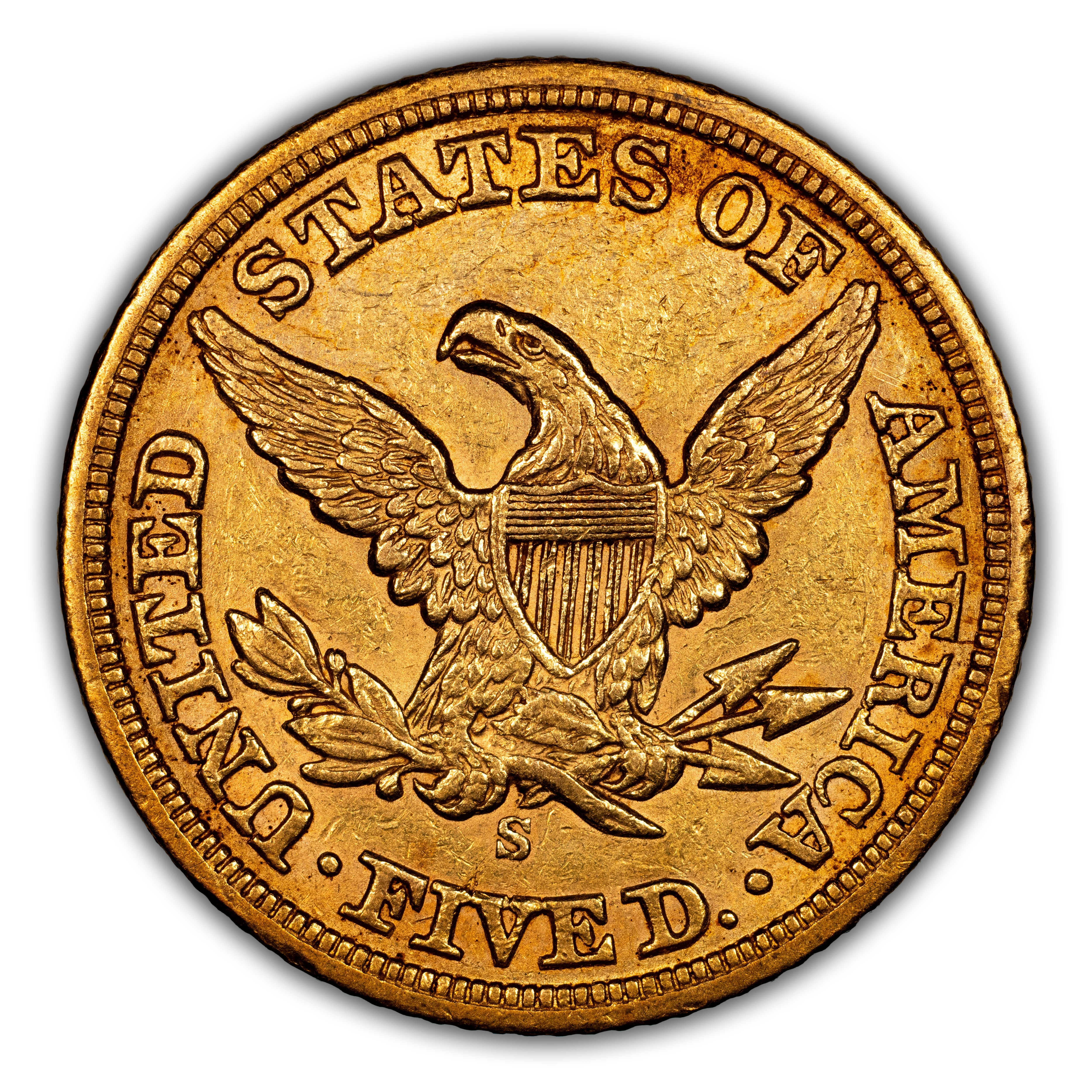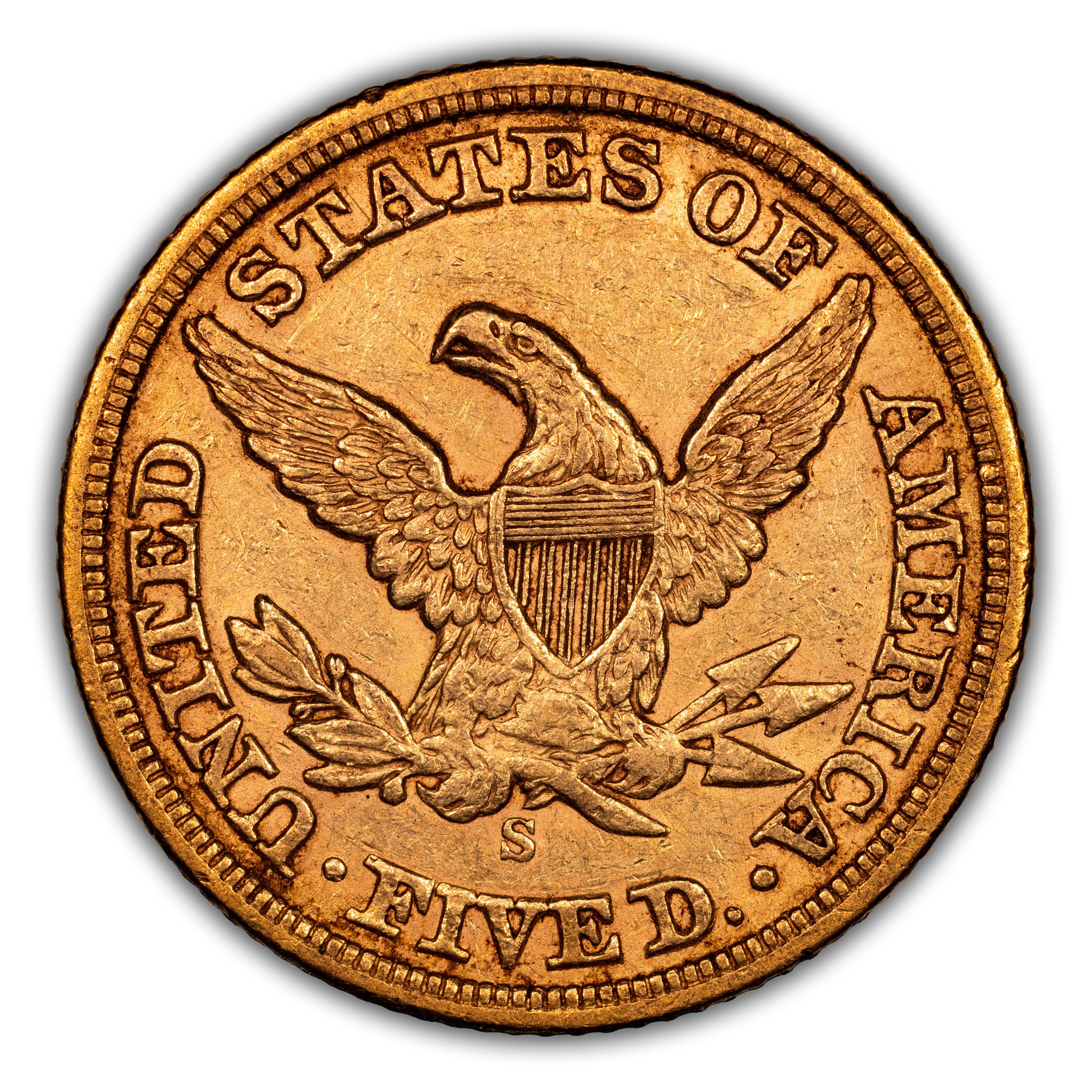 1861-S $5 XF45 NGC. CAC. Ex: Rive d'Or Collection. Fewer than 100 1861-S half eagles are believed to survive from the minta...