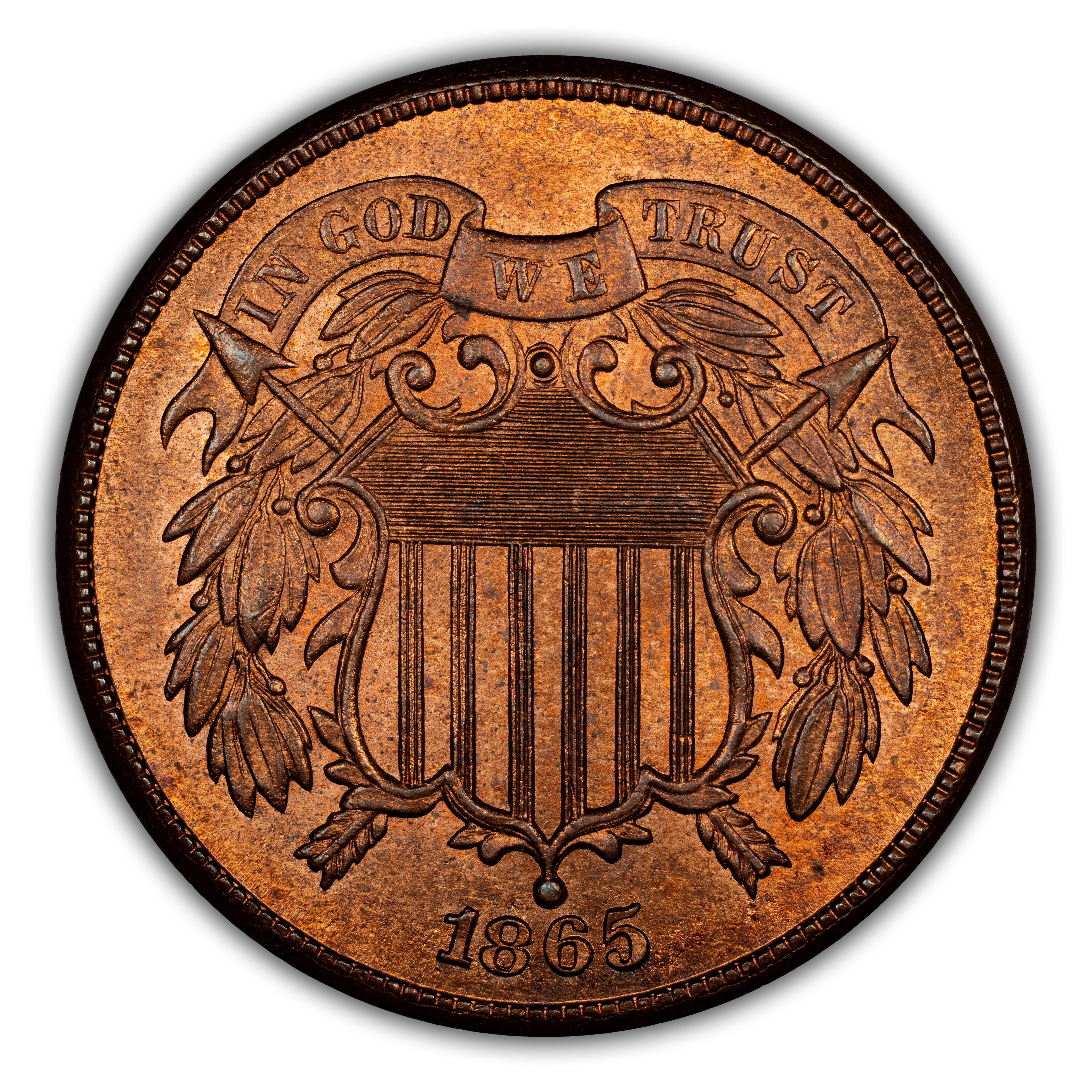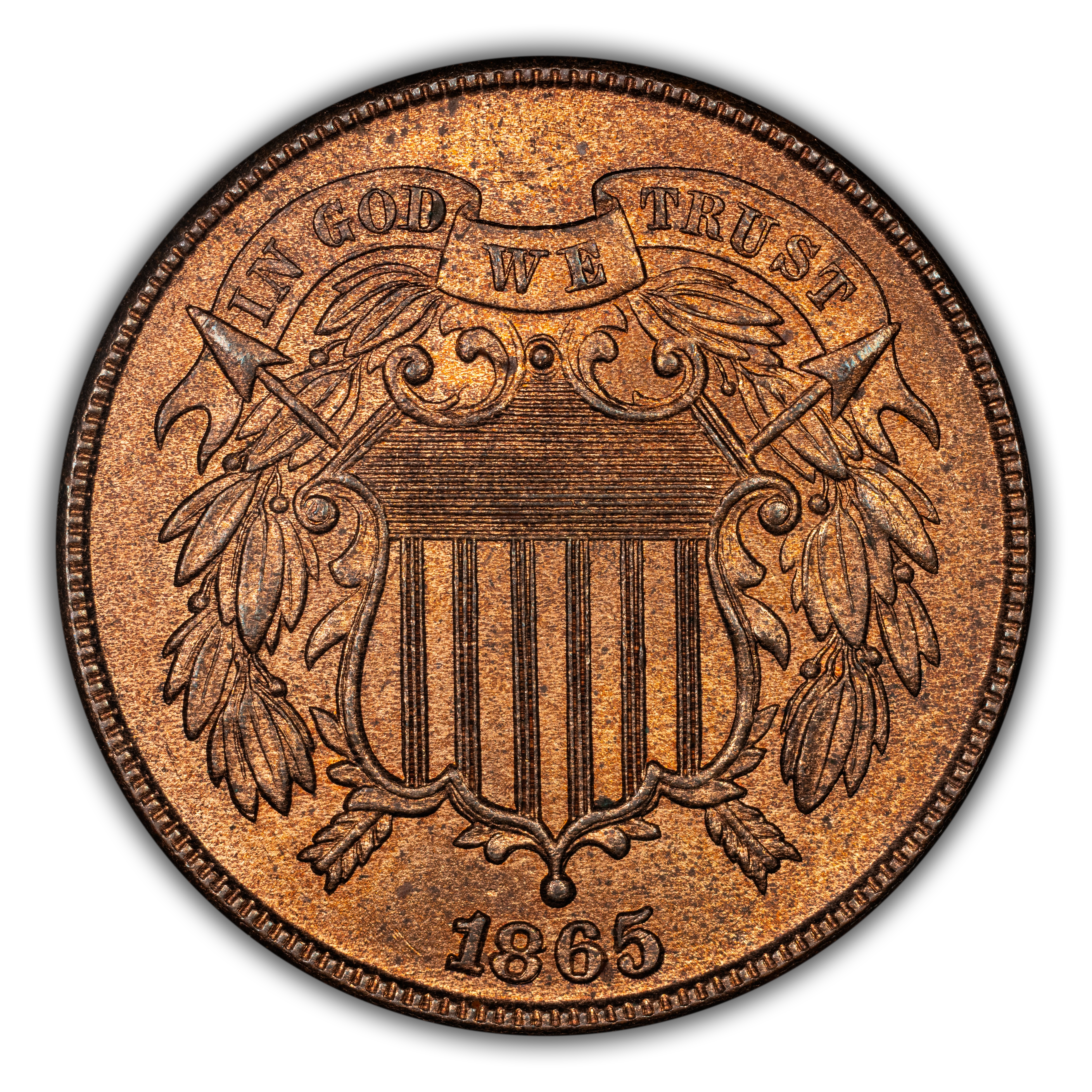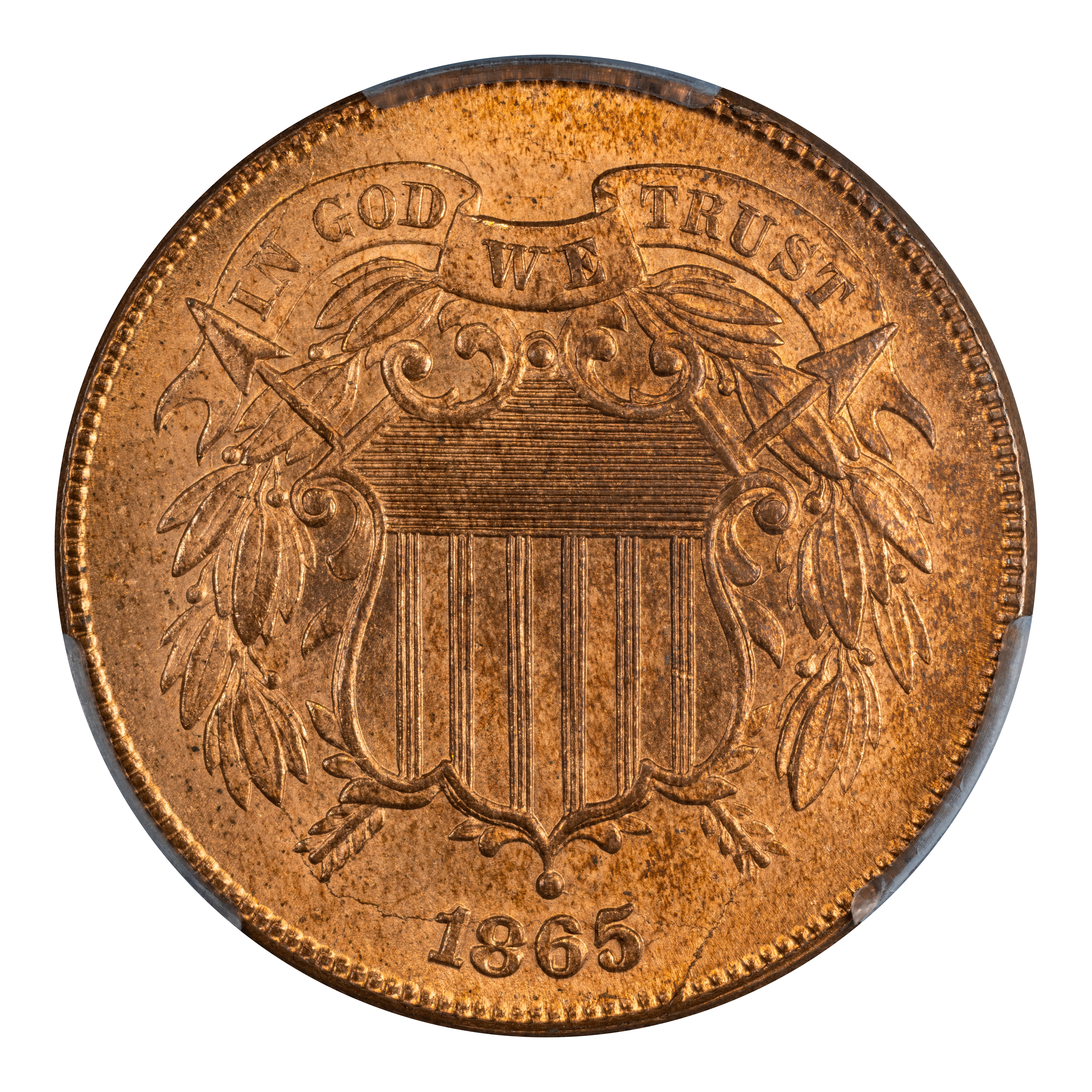 The 1865 Two Cent Piece is the ultimate high mintage type coin for its series and comes in two major varieties including the Plain and Fancy 5. Extremely common in all grades up to the finest of gems which are just slightly scarce. The color designations show a very gradual increase in value and rarity with just the highest graded red gems being rare.