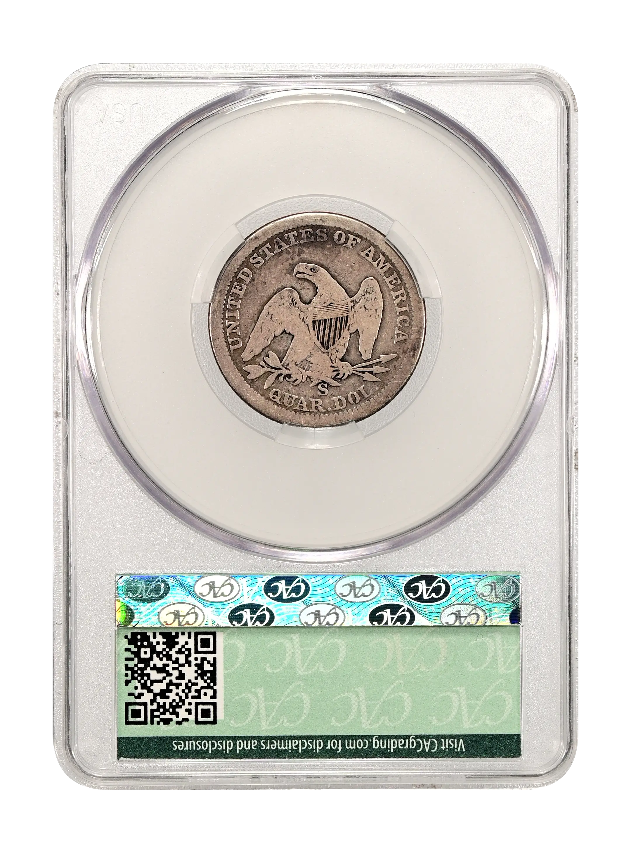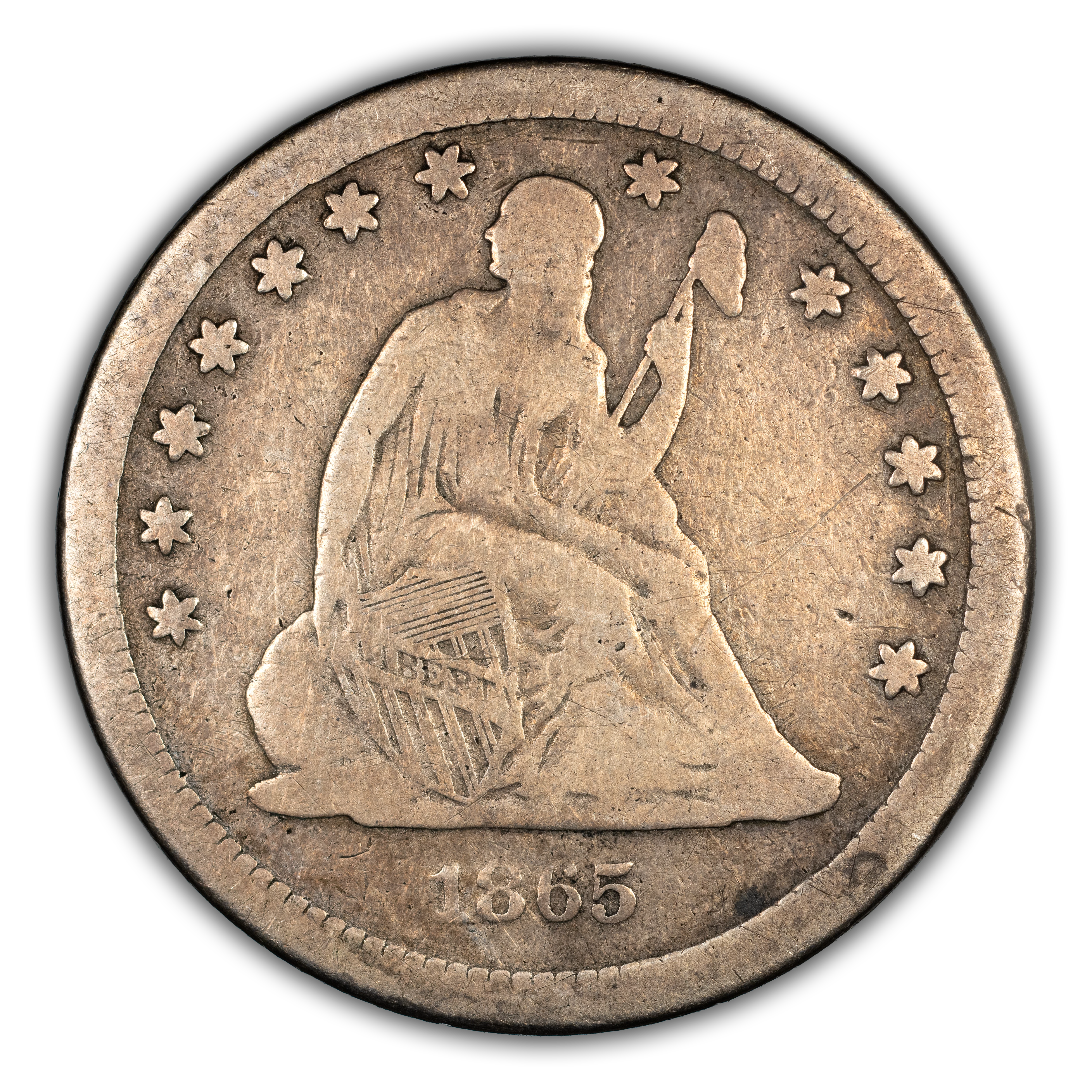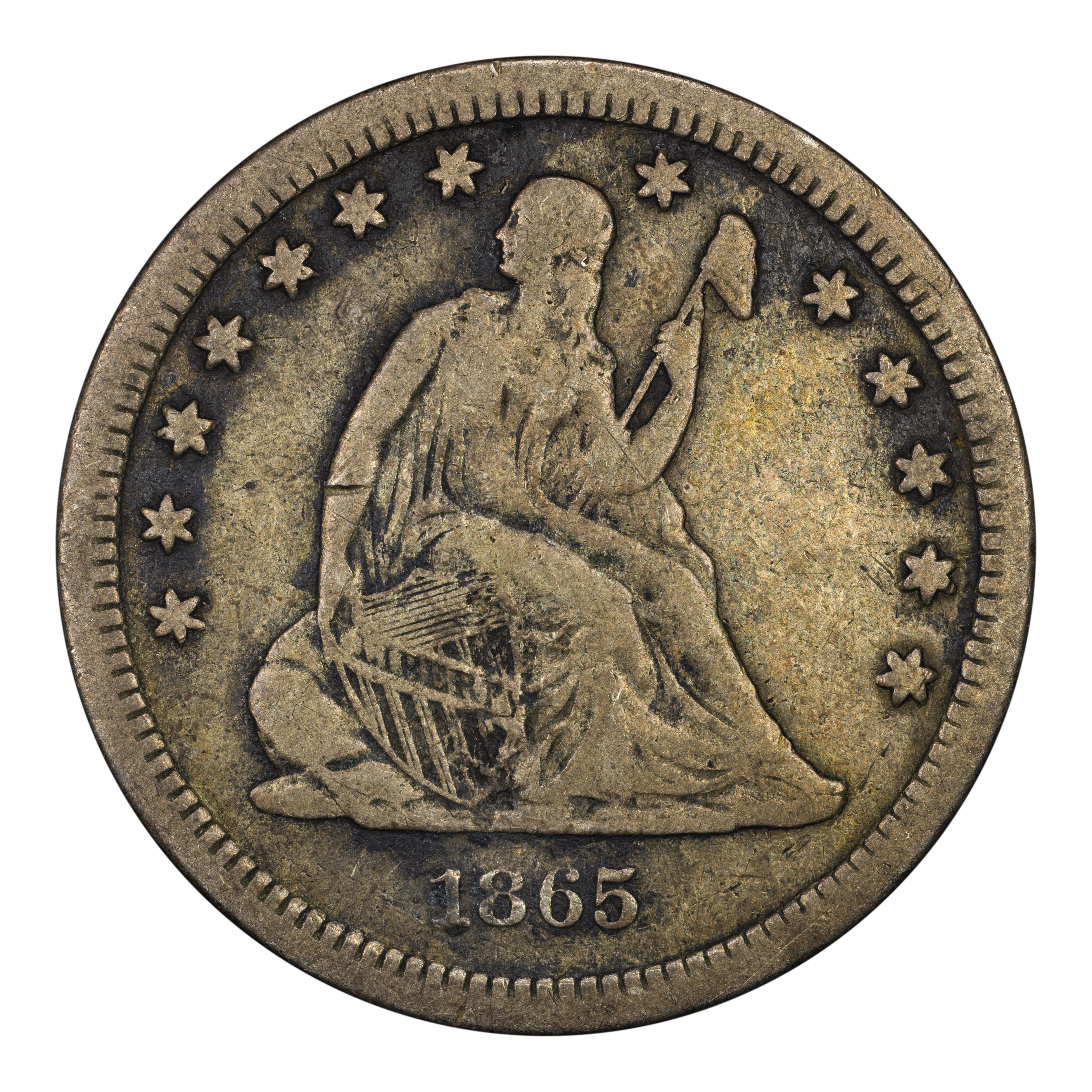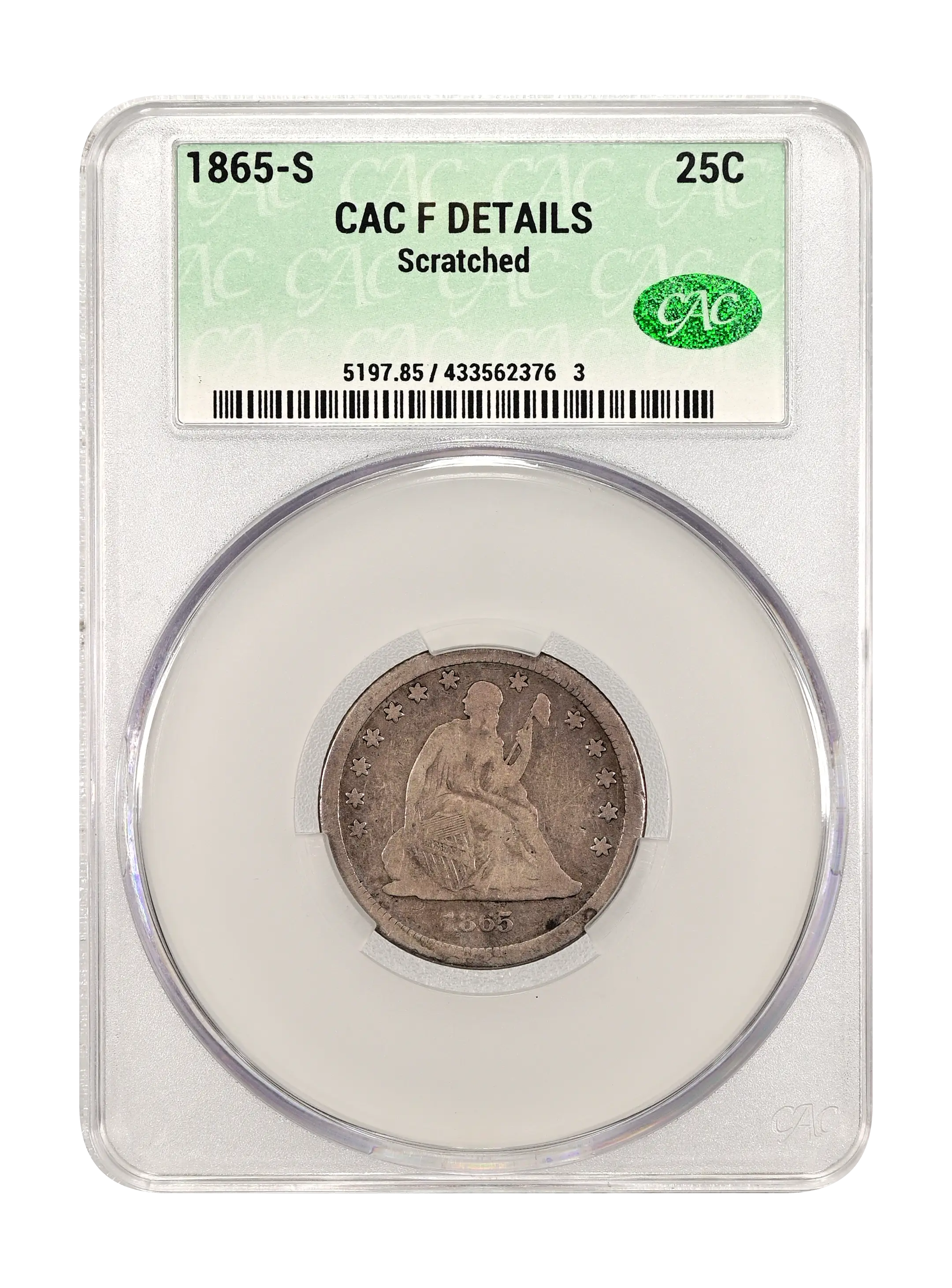 1865-S 25C VF30 ANACS. Housed in a small-sized holder. Mintage 41,000....
