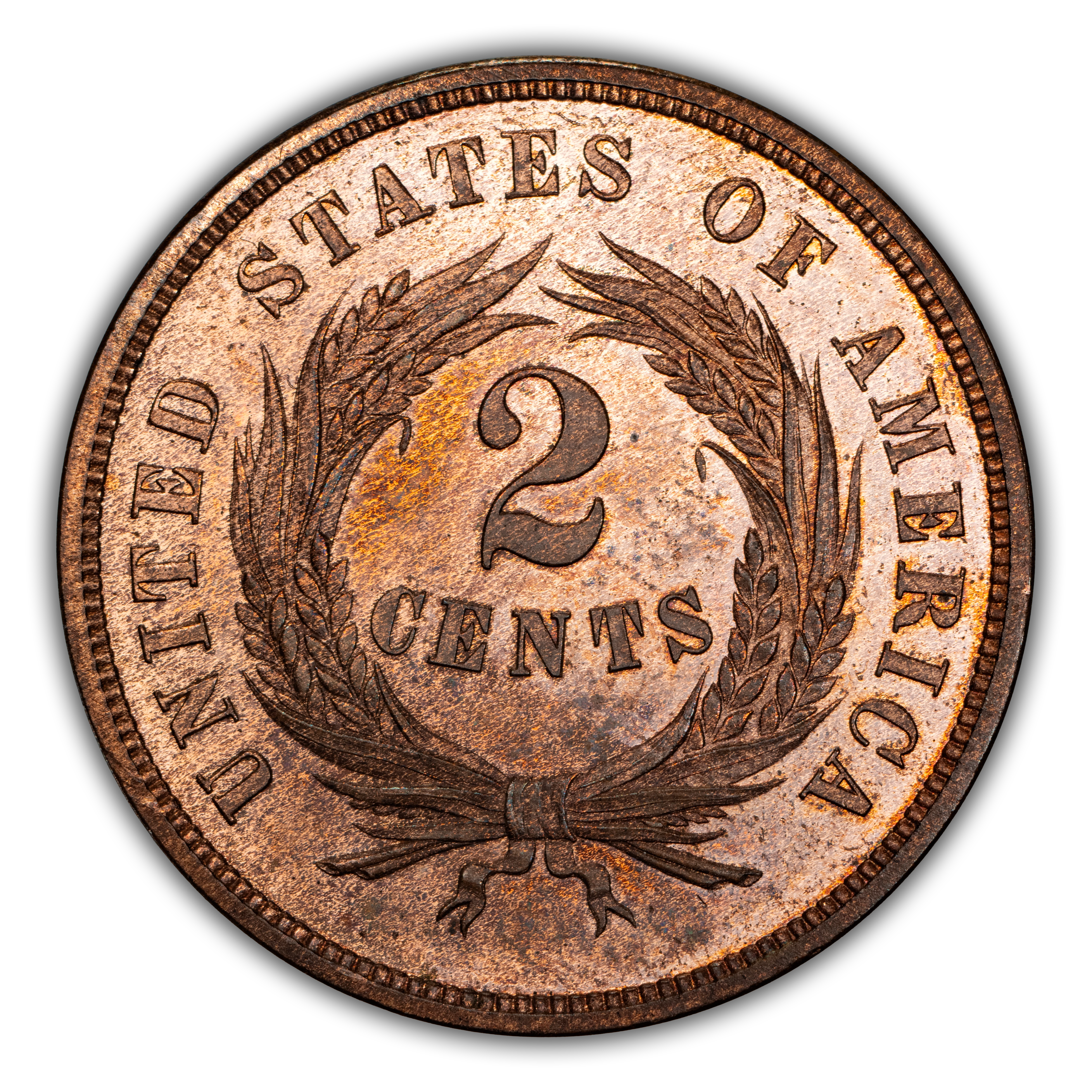 Reverse: A large numeral 2 with the word CENTS below (smaller) in the center is framed by a well-defined wheat wreath tied at the bottom center by a simple ribbon. UNITED STATES OF AMERICA appears around the periphery.
