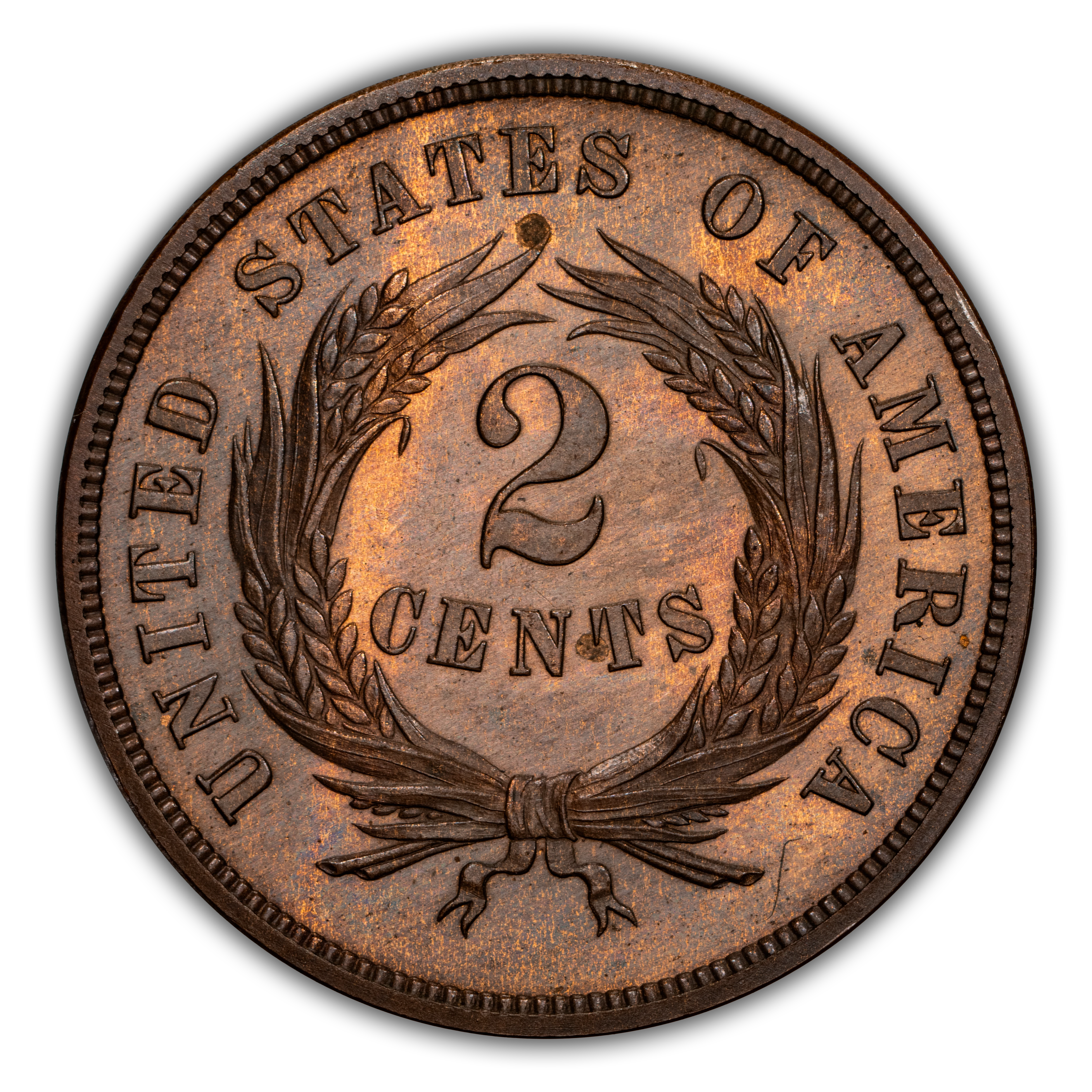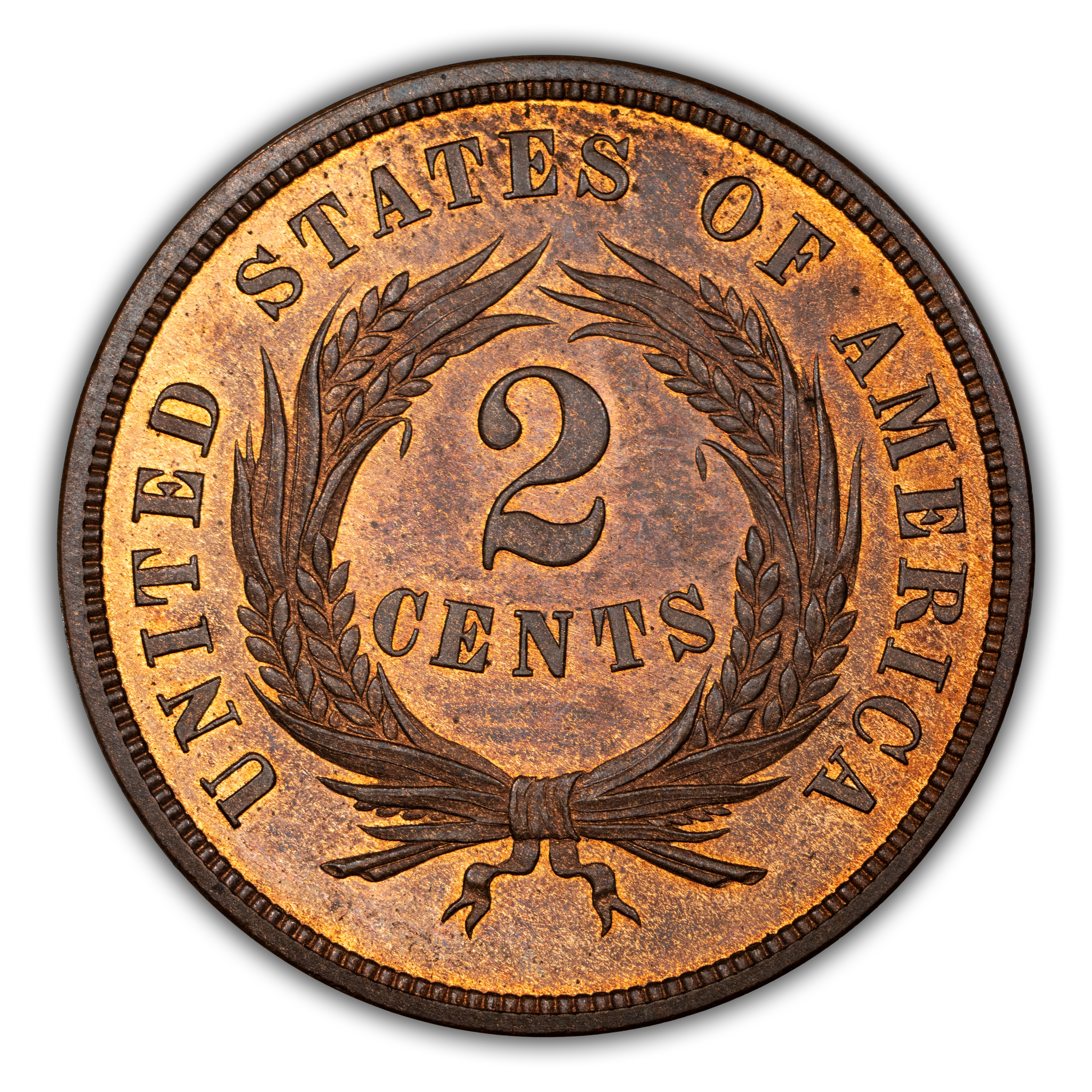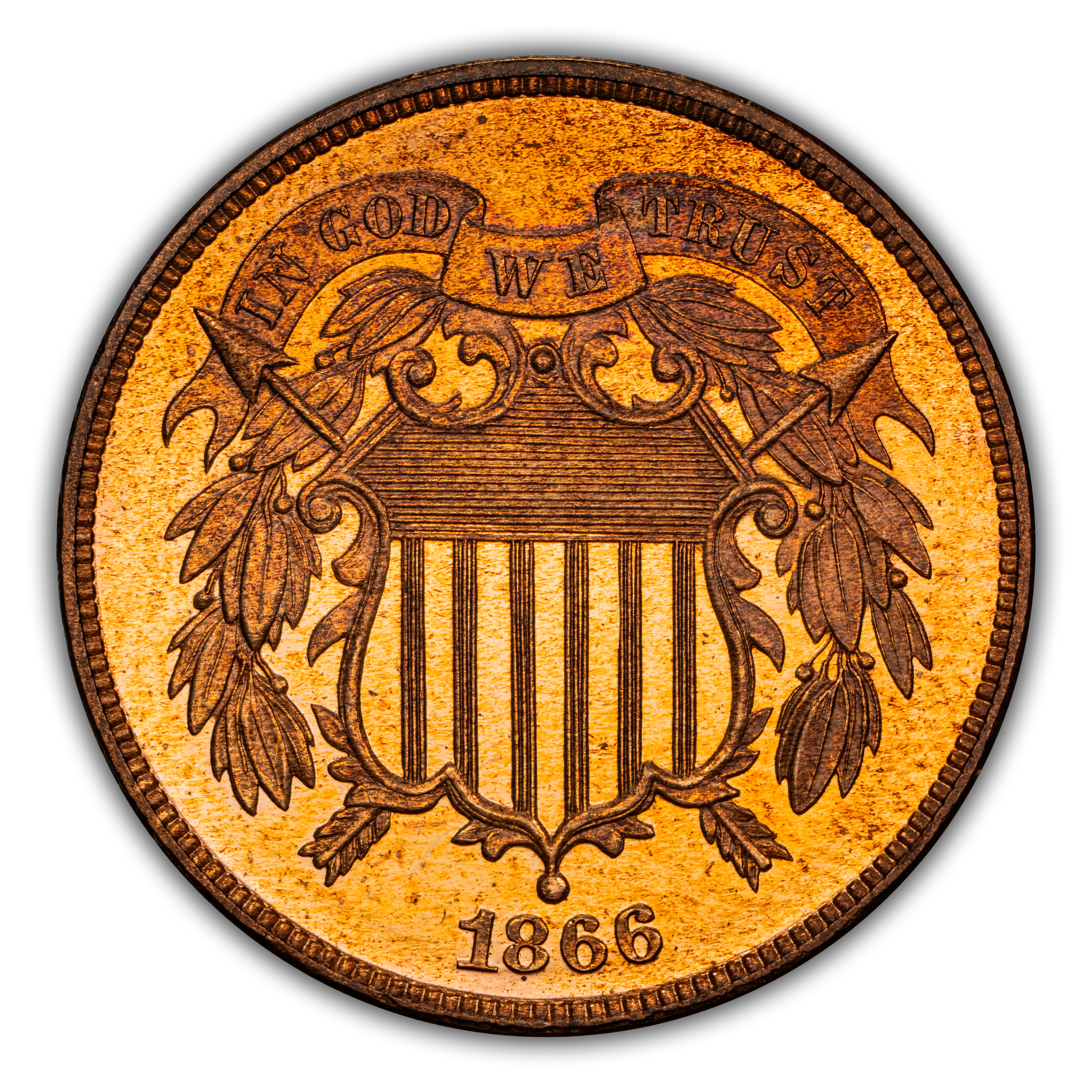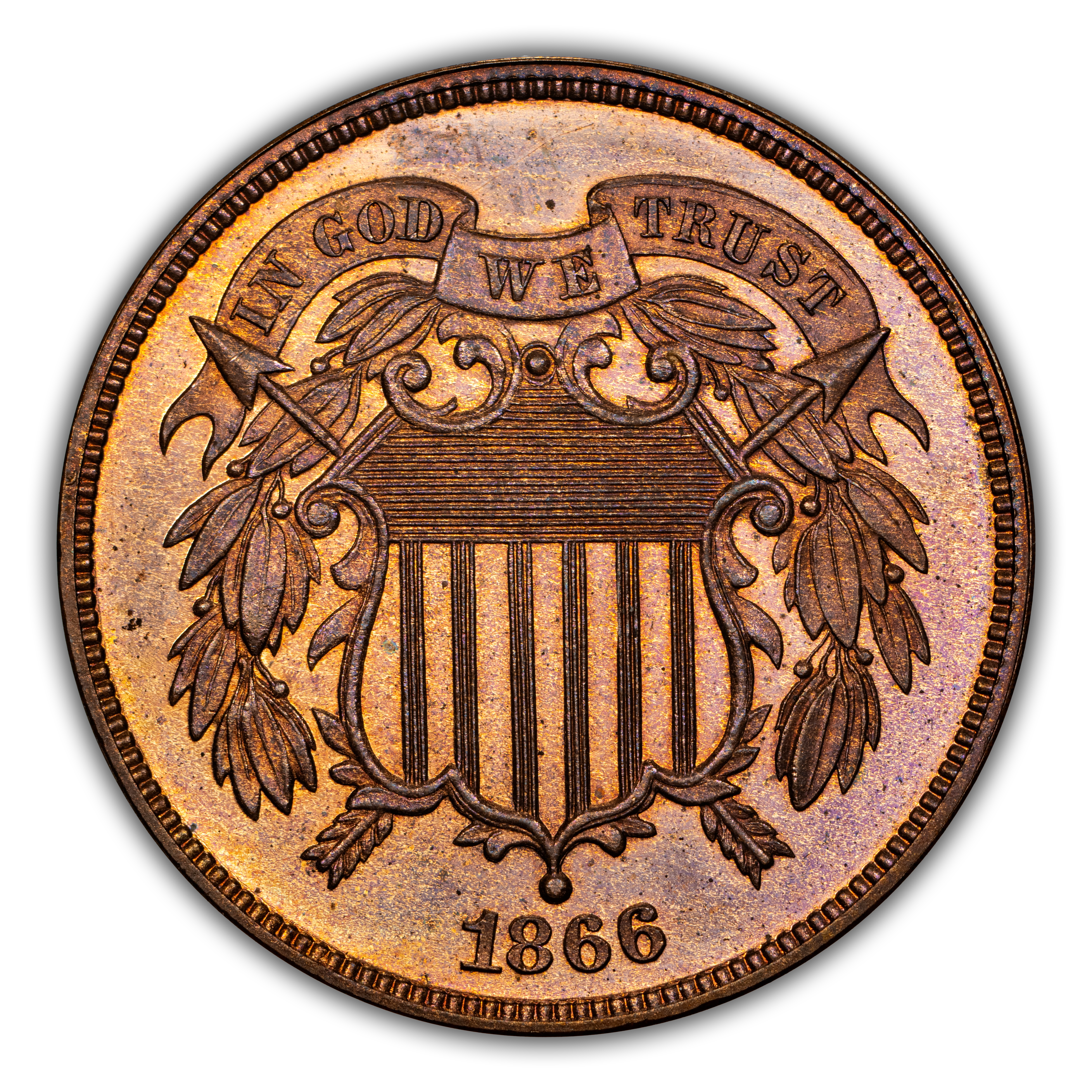 The 1866 Proof Two Cent Piece has a moderately low mintage of 725 coins struck, of which most have survived. Scarce as of PR66 with brown and red-brown color. Full red pieces are rare as of PR65. Any cameo surfaces are great rarities in all grades. Look for either nice toners or blazing red examples.