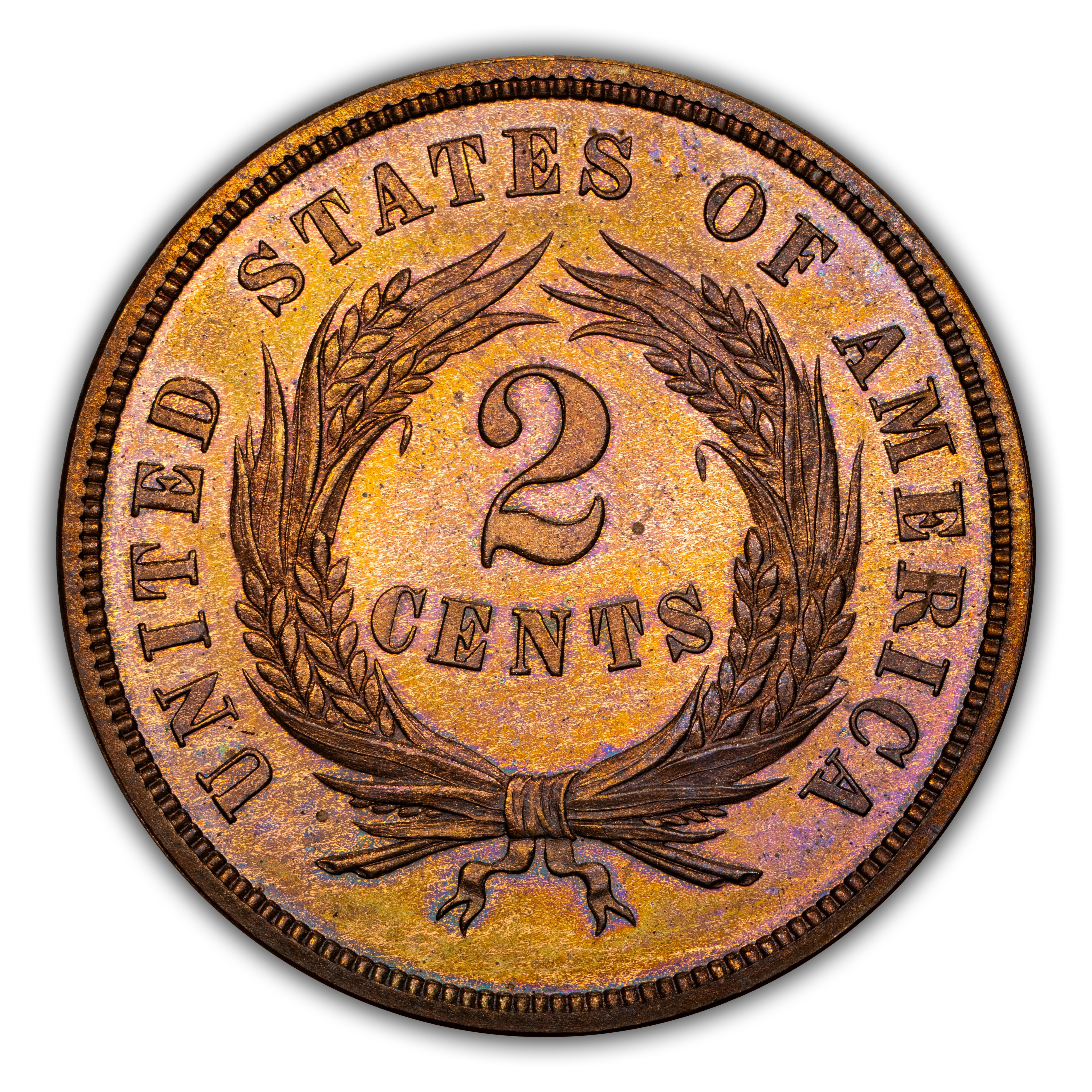 Reverse: A large numeral 2 with the word CENTS below (smaller) in the center is framed by a well-defined wheat wreath tied at the bottom center by a simple ribbon. UNITED STATES OF AMERICA appears around the periphery.