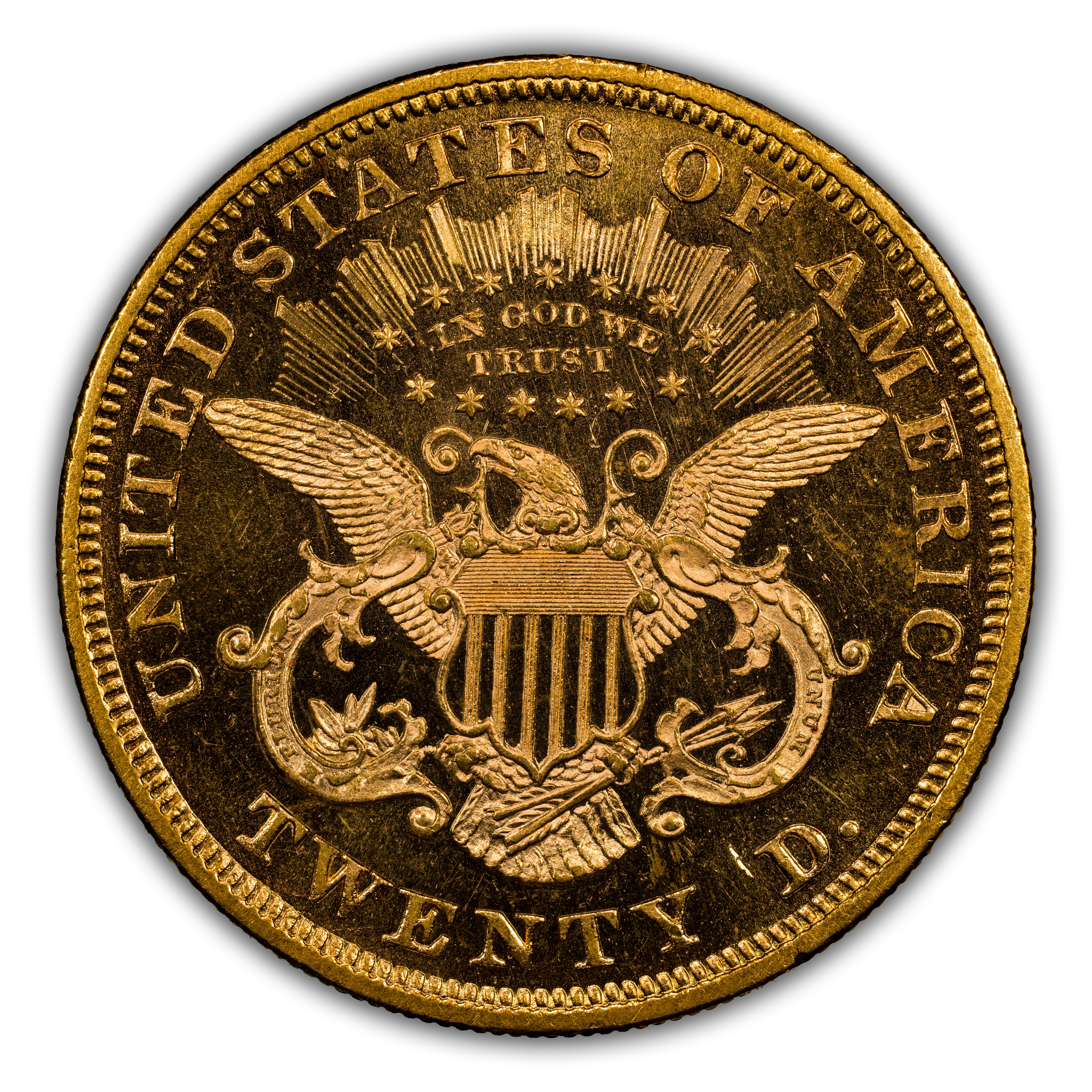 Reverse: Shielded eagle with wings outstretched holding arrows and olive branches. The words UNITED STATES OF AMERICA * TWENTY D. appear around the periphery. Mint mark, if any, appears below the eagle's tail, above the N in TWENTY.