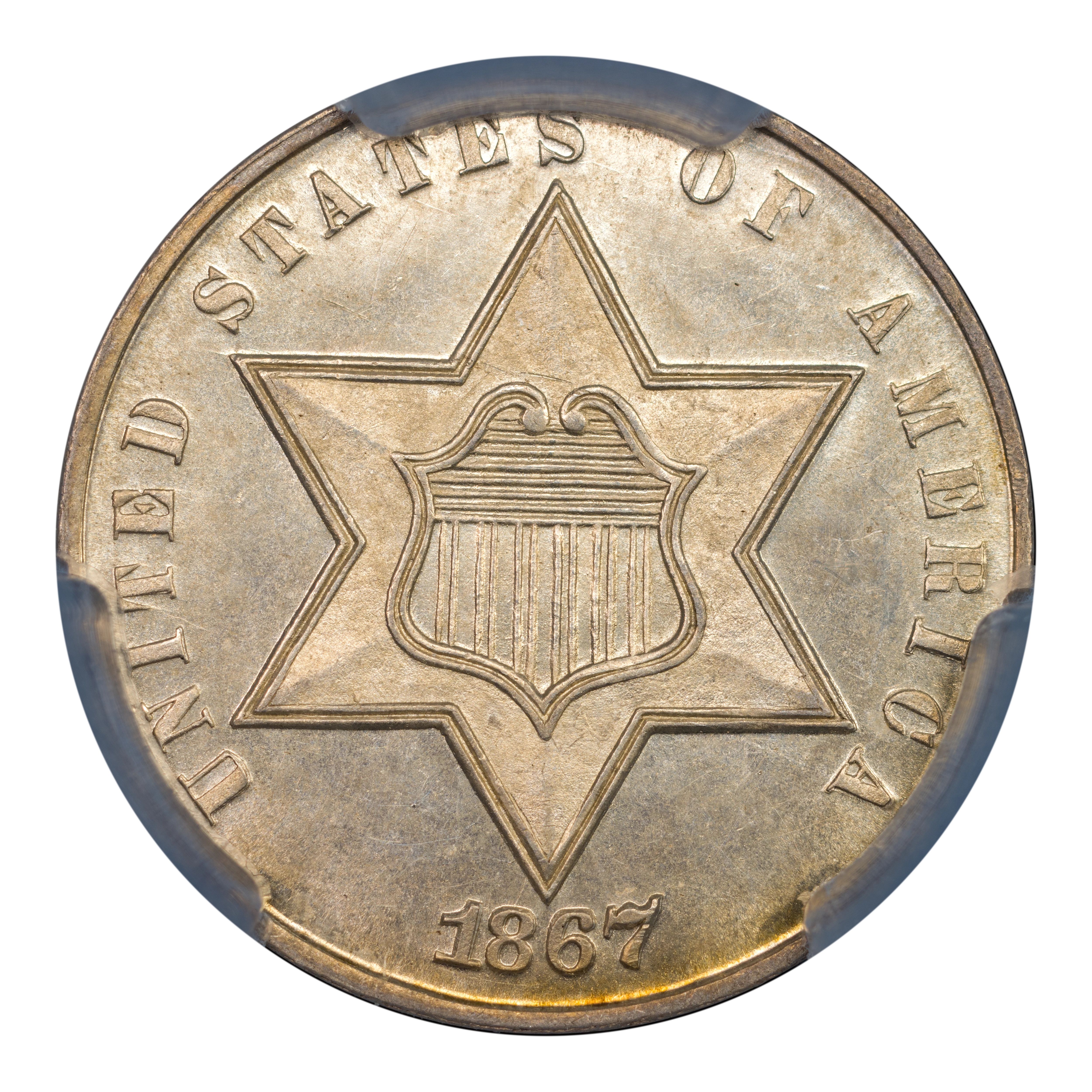 The 1867 Three Cent Silver comes from a miniscule mintage of 4,000 making it a very scarce date. This date is tough to find at any grade level but genuine scarcity begins in the AU range. MS60 and MS62 are very scarce. MS63 and MS64 are rare and all gems are extremely rare. This issue is normally well struck and clash-marks are surprisingly not an issue. Look for attractive toners as nice color is not too hard to find.