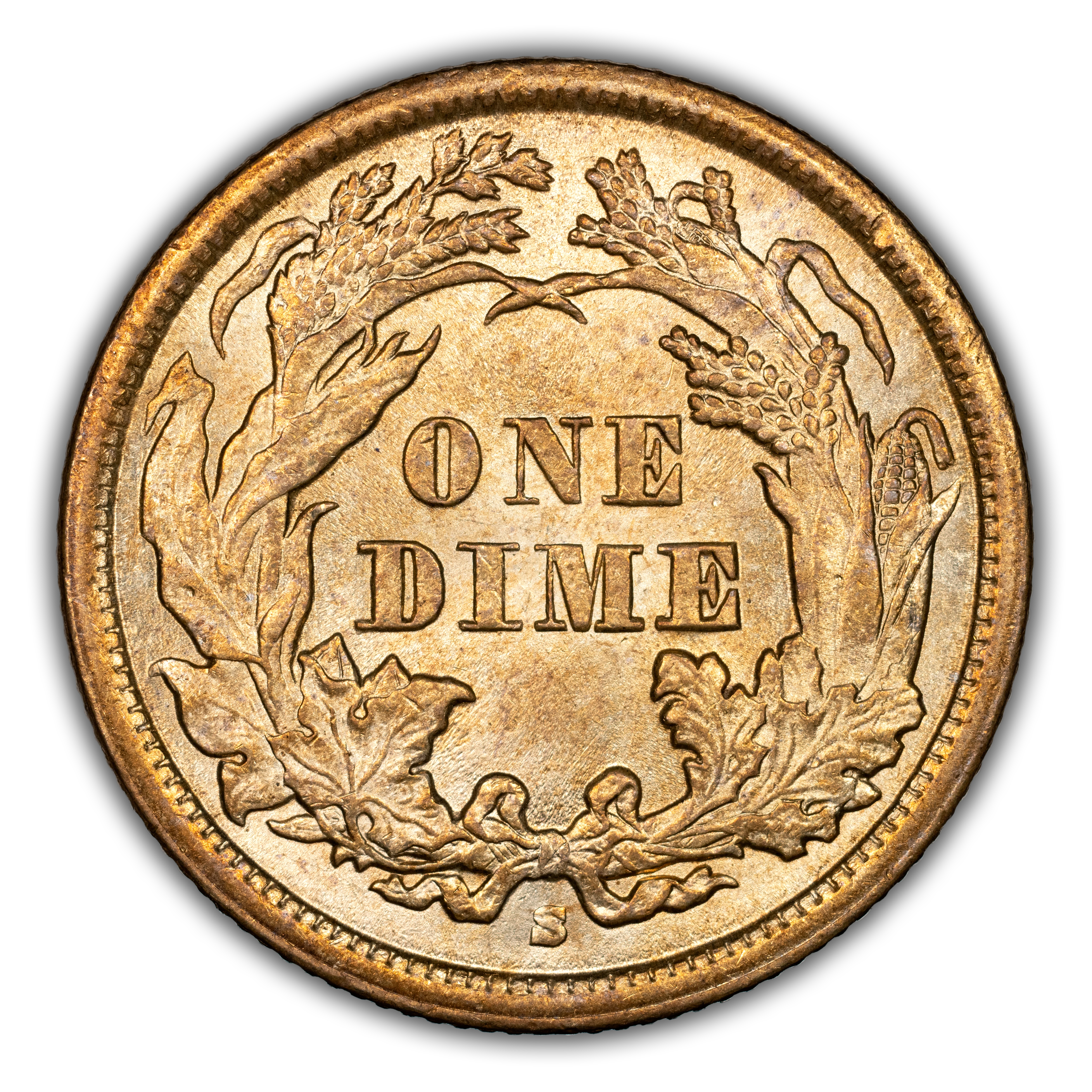 Reverse: ONE DIME is centered in the middle of the reverse surrounded by a wreath tied by a bow at the bottom. Mint mark appears below the bow at the bottom.