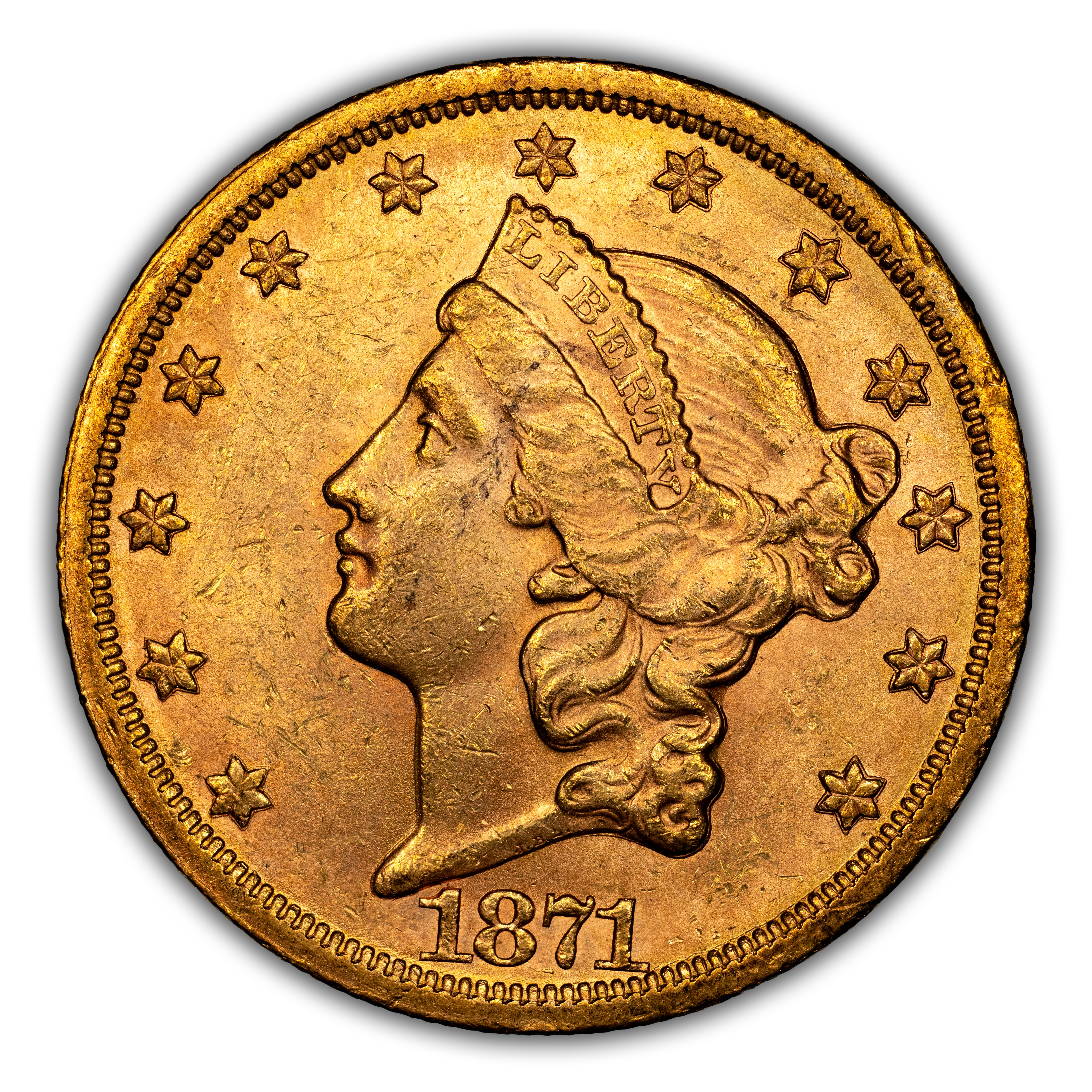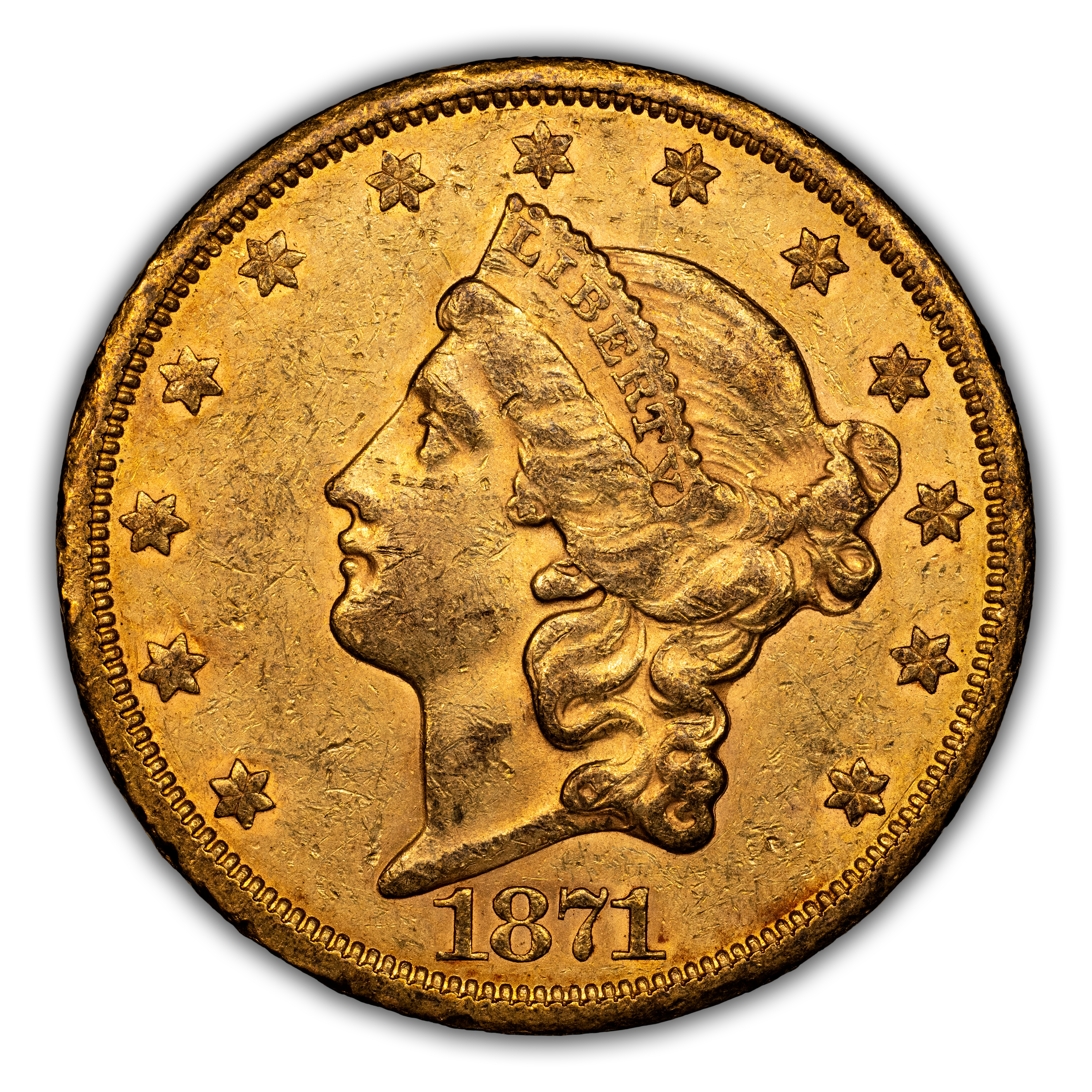 1871-S $20 AU58 NGC. CAC. NGC Census: (515/193). PCGS Population: (228/189). CDN: $1,615.99.Whsle. Bid for NGC/PCGS AU58. M...