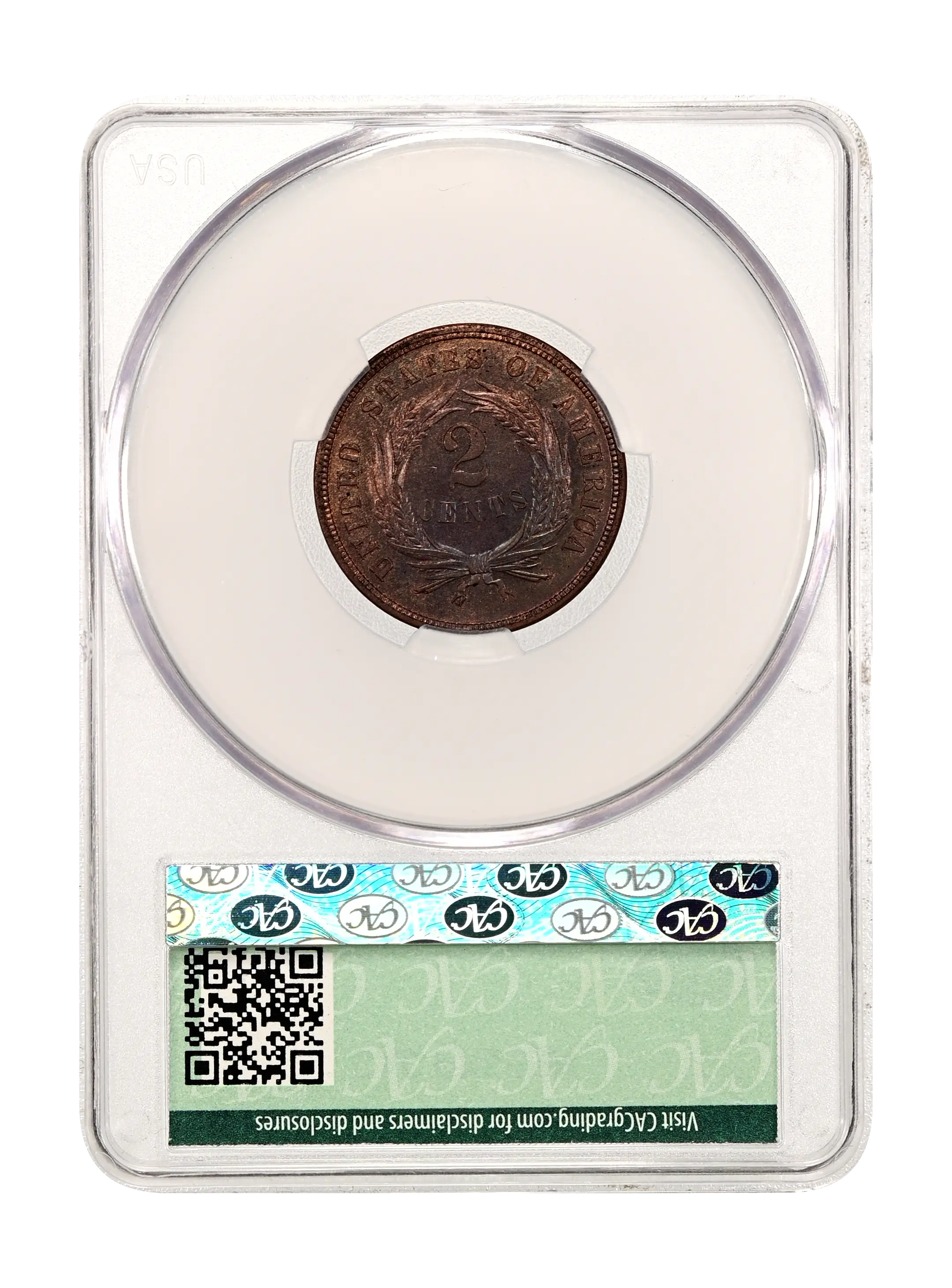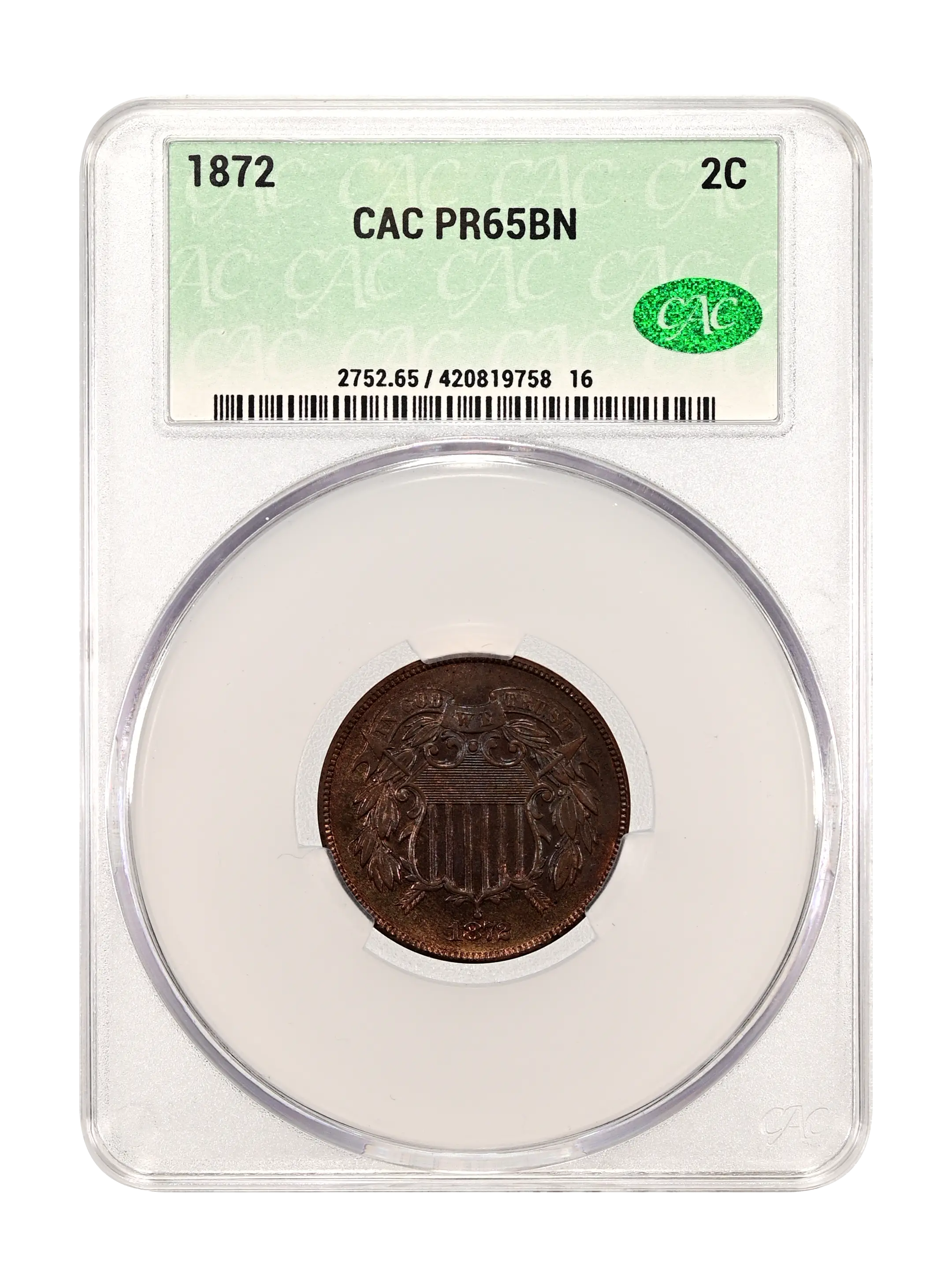 The 1872 Proof Two Cent Piece comes from a mintage of 950 coins struck, of which the majority of that mintage has survived. Scarce as of PR66 with brown and red-brown color; and rare as of PR65 with full red color. Any cameo surfaces are great rarities in any grade. Look for either nice toners or blazing red examples.