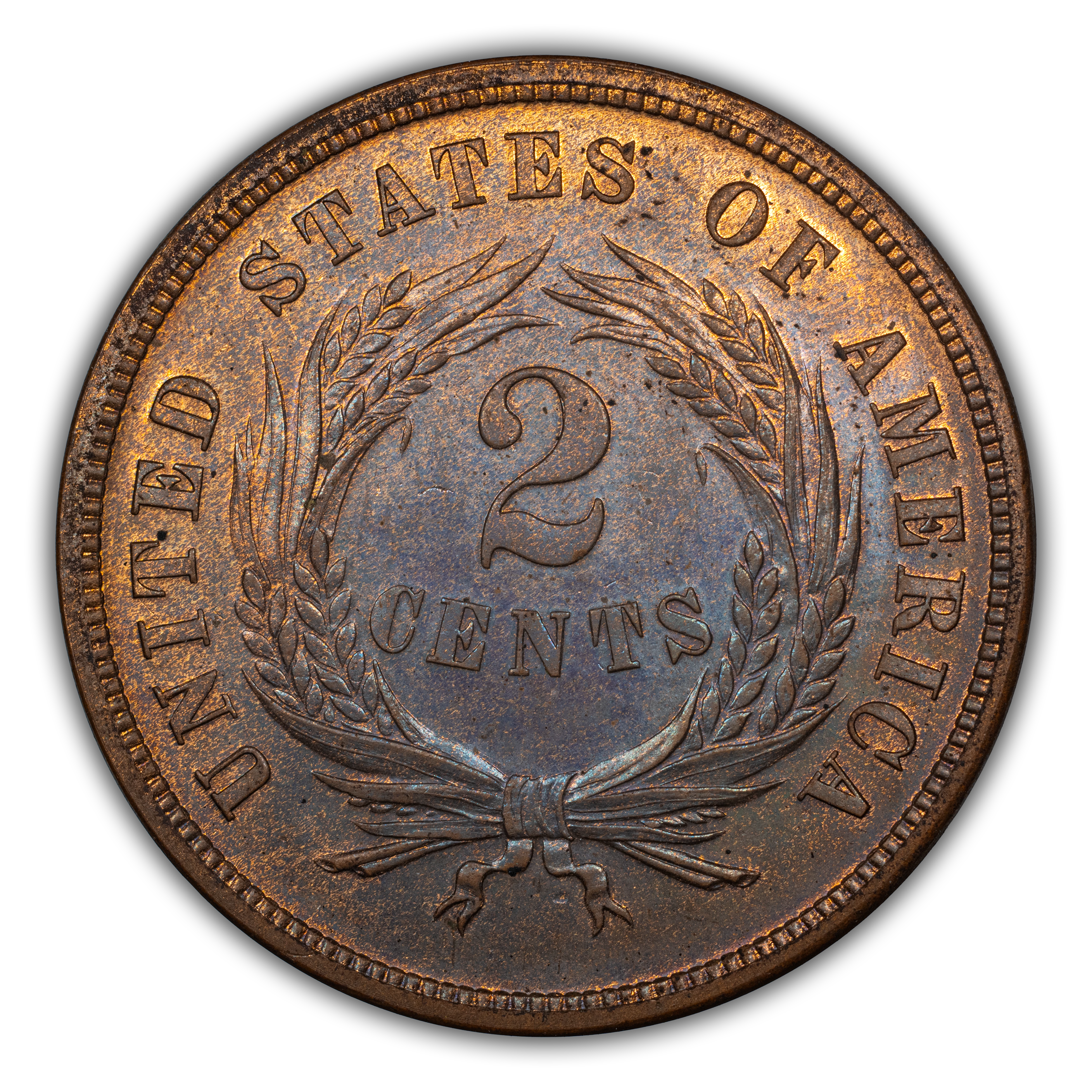 Reverse: A large numeral 2 with the word CENTS below (smaller) in the center is framed by a well-defined wheat wreath tied at the bottom center by a simple ribbon. UNITED STATES OF AMERICA appears around the periphery.