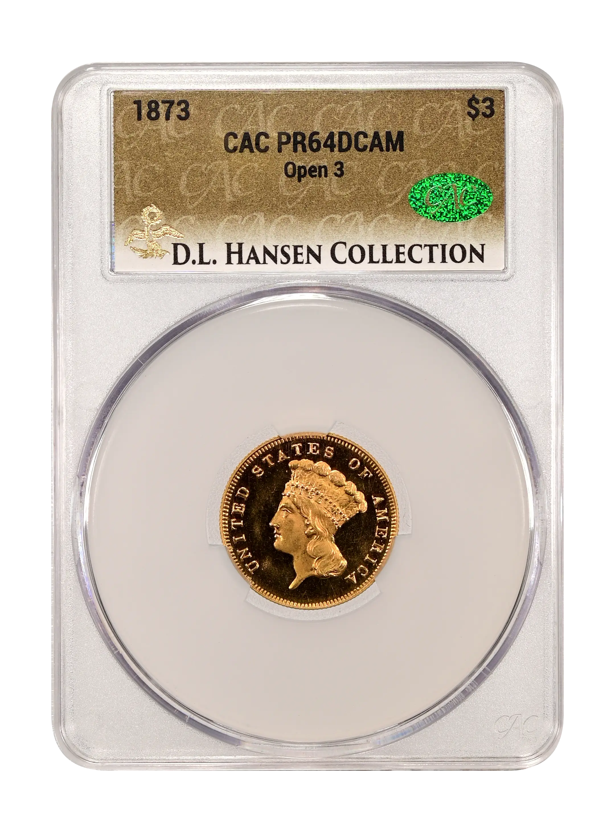 1873 Open 3 $3 DCAM (Proof) CAC PR64DCAM