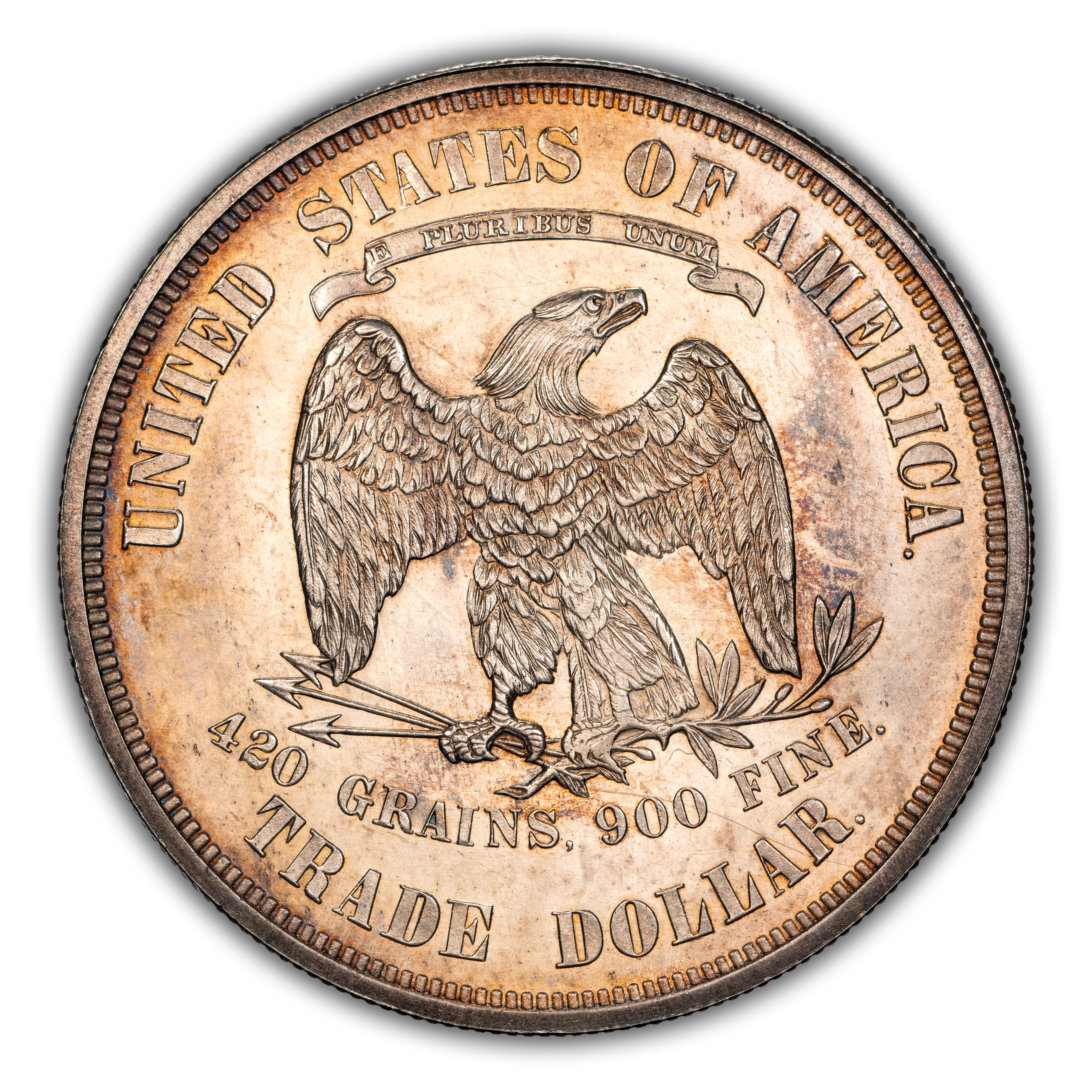 Reverse: An eagle is centered in the design with the weight of the coin listed below as "420 GRAINS. 900 FINE." The words UNITED STATES OF AMERICA and TRADE DOLLAR adorn the top and bottom periphery with a ribbon stating the motto E PLURIBUS UNUM above the eagle's head.