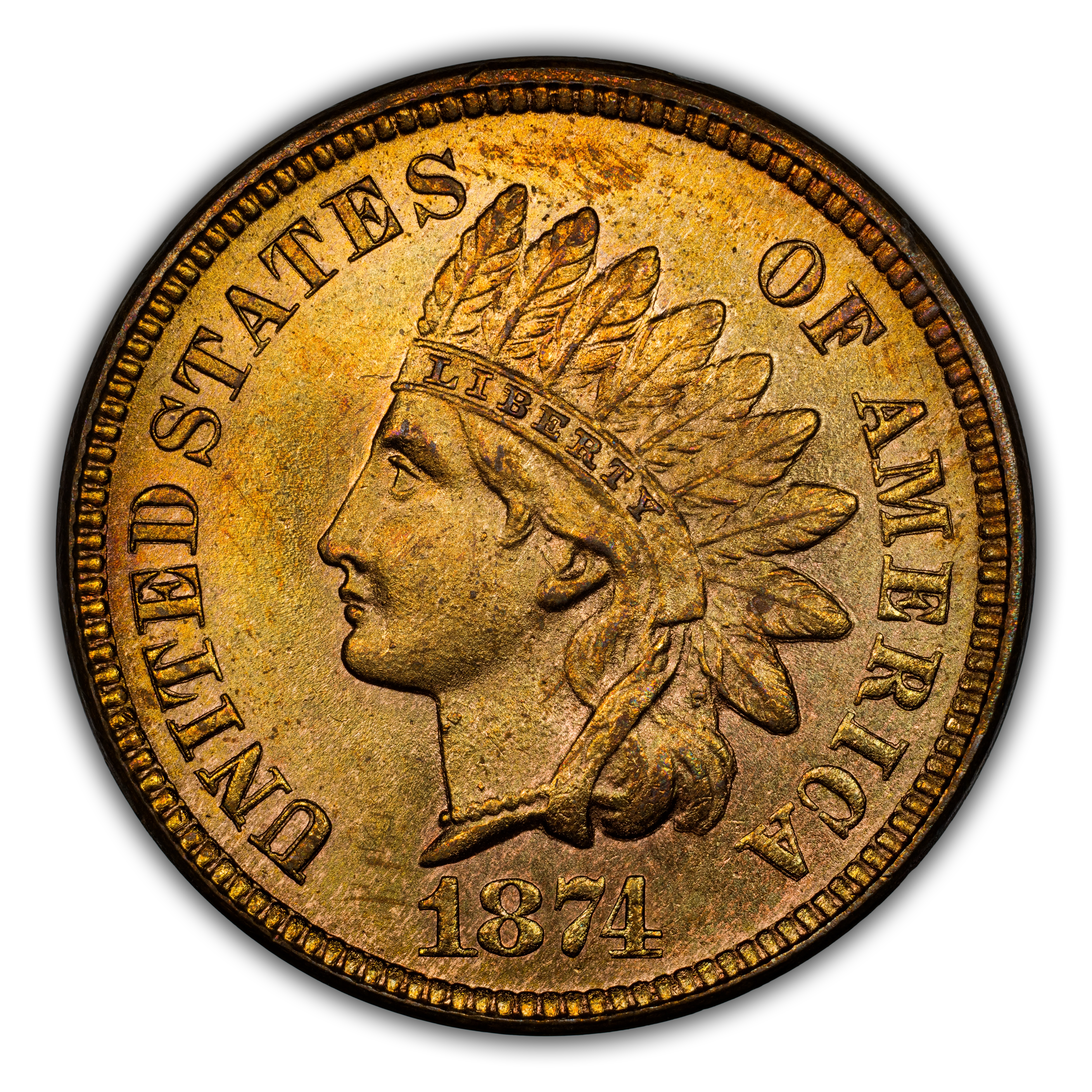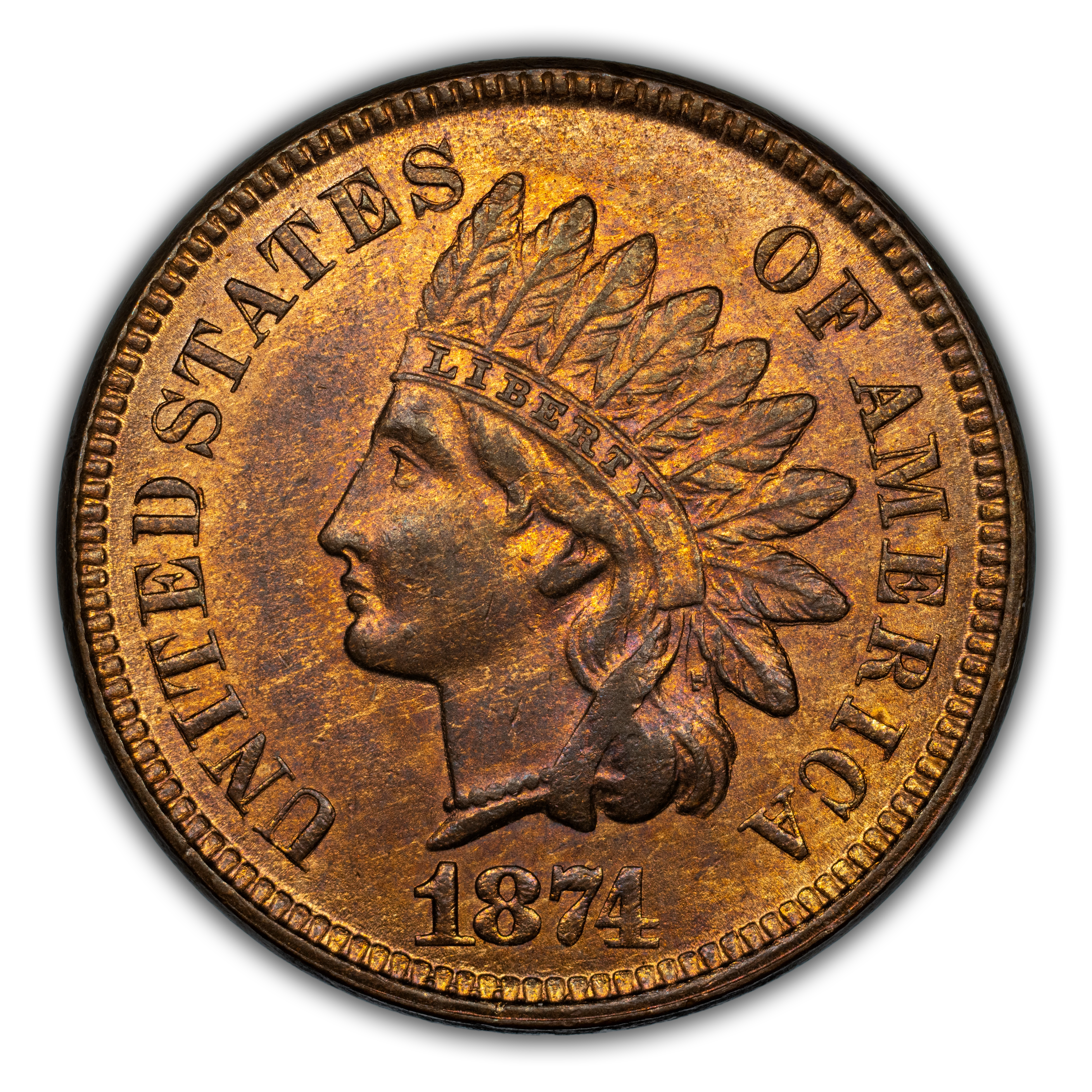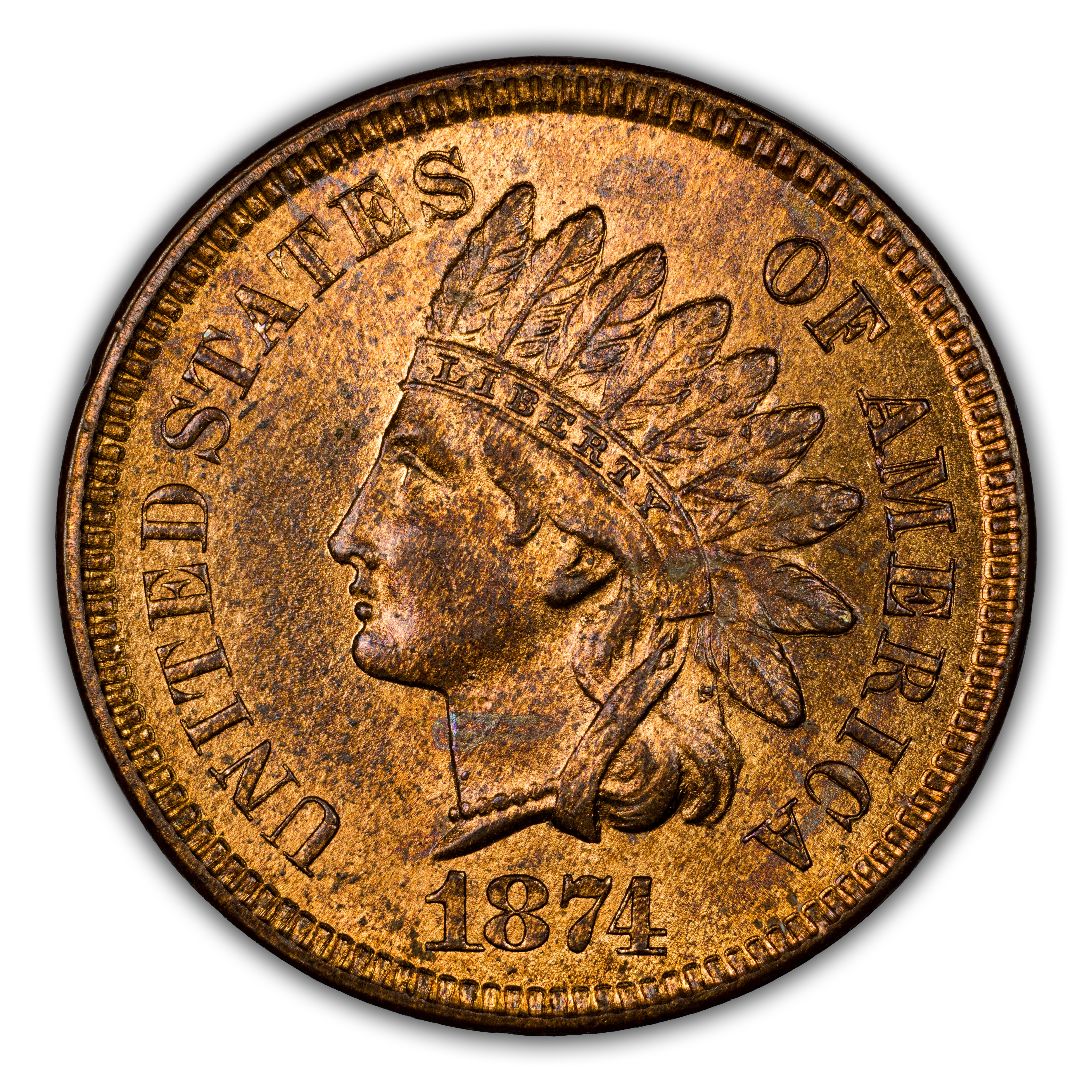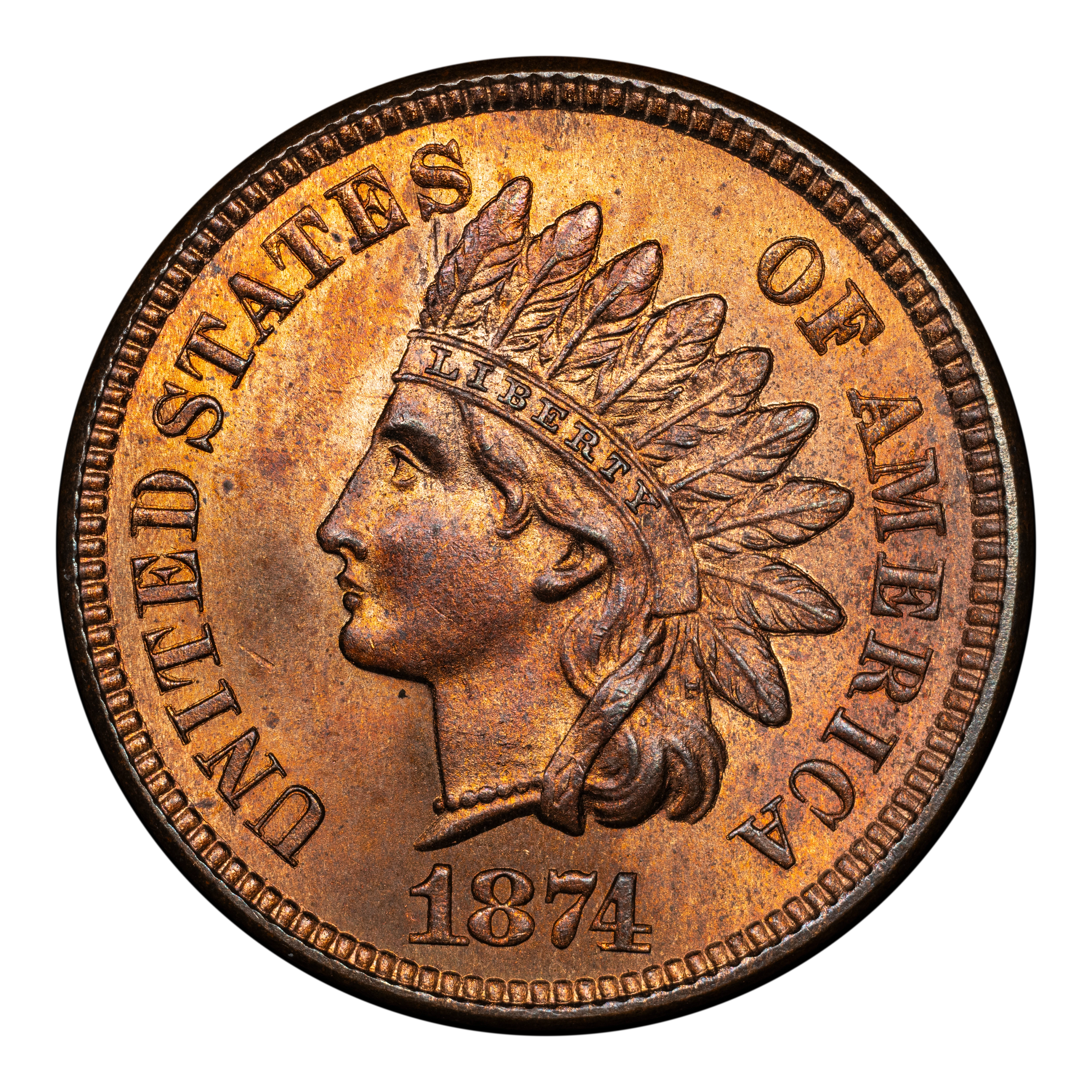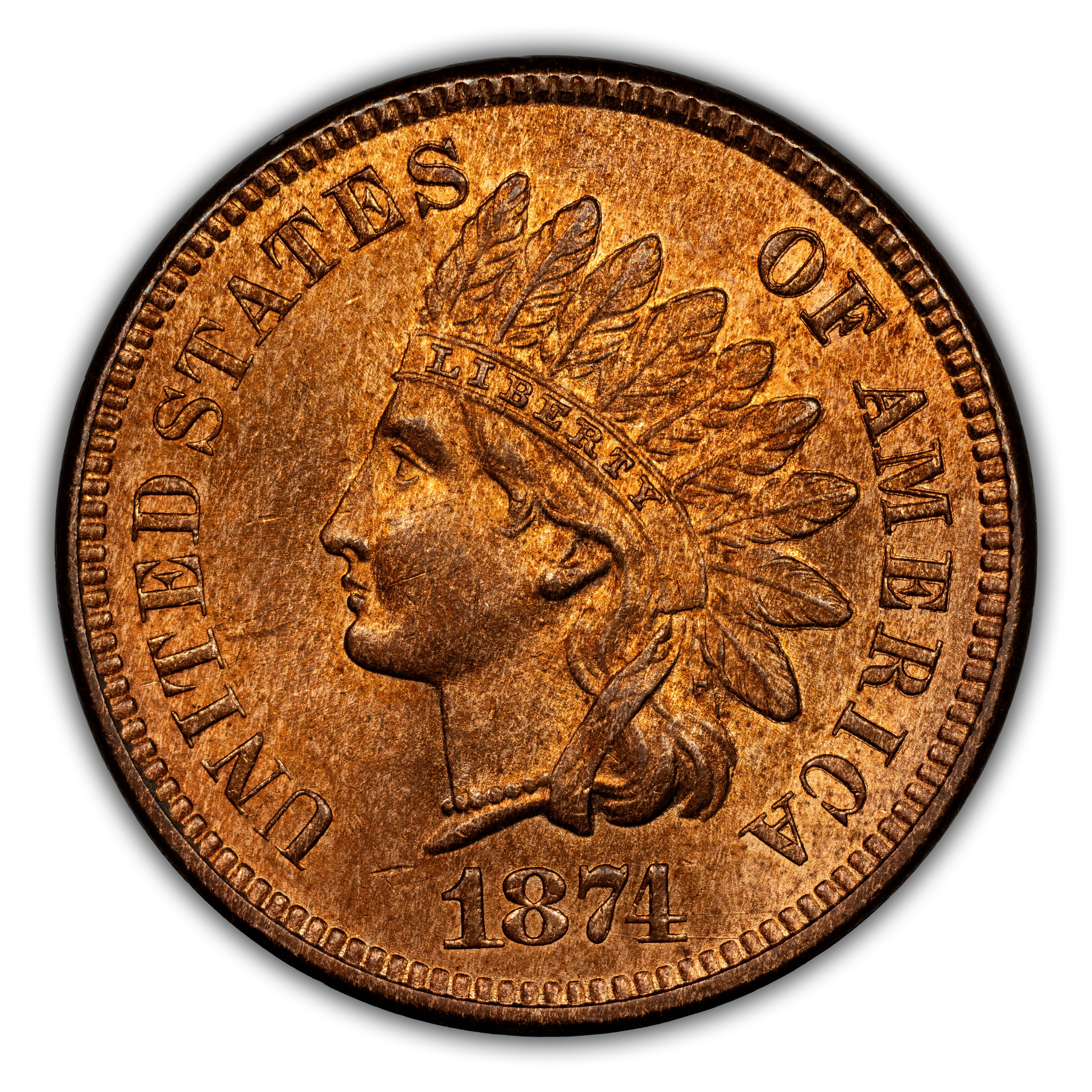 A near semi-key date in the Indian Cent Series in which very few have been saved, explains the scarcity of the 1874. Most of the surviving examples are known in circulated grades. Scarce in Mint State as the value gradually increases with more red color. High-end red gems are extremely rare.
