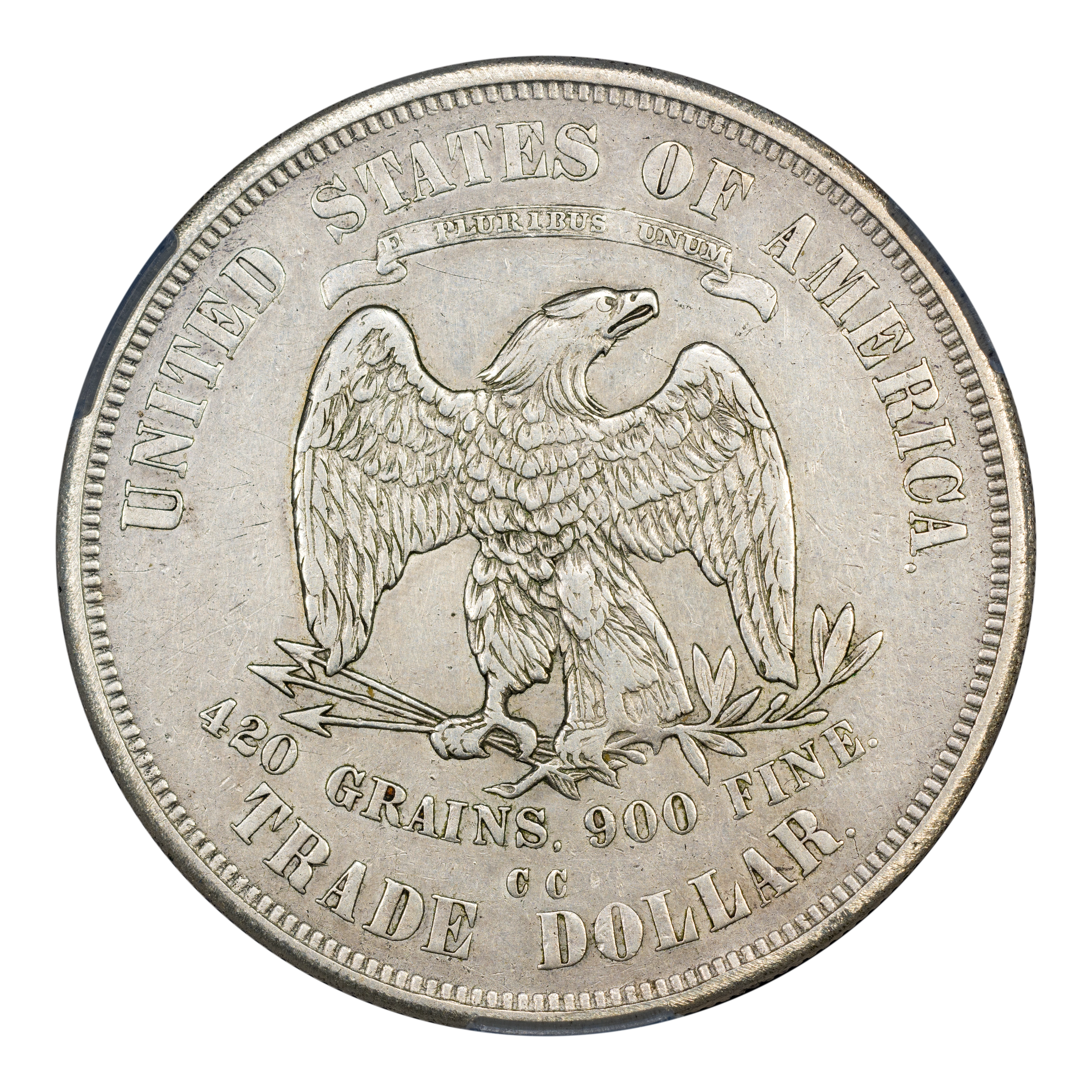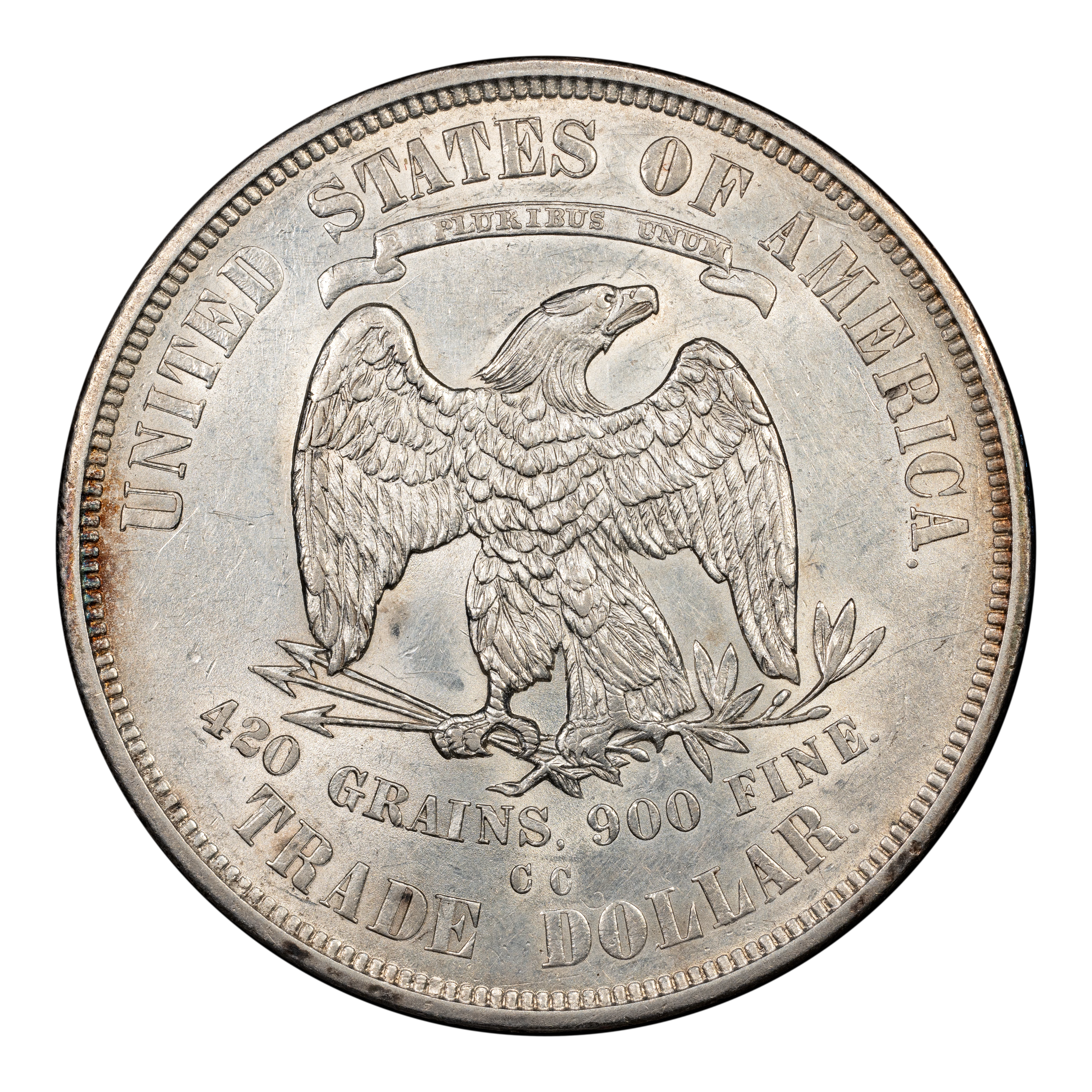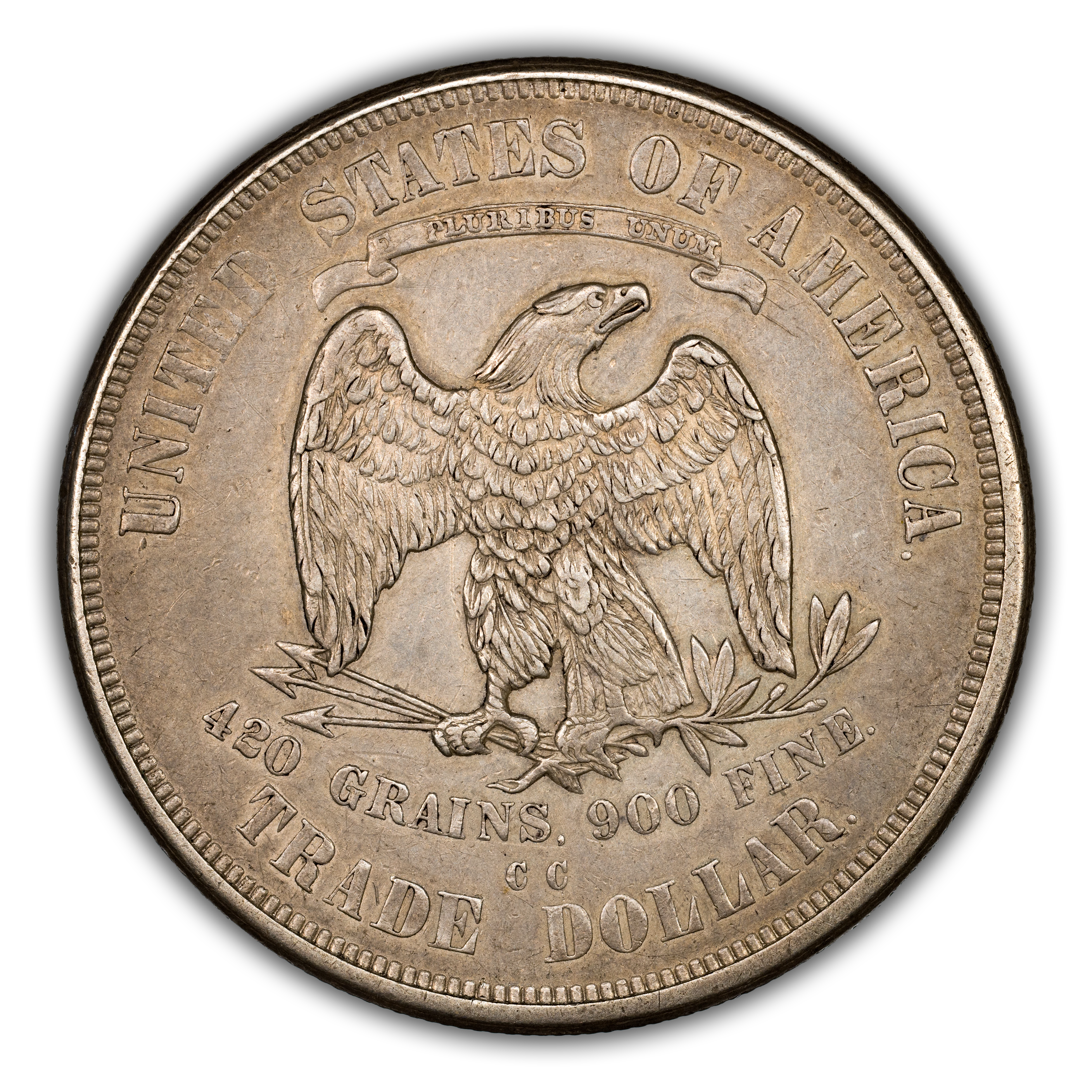 Reverse: An eagle is centered in the design with the weight of the coin listed below as "420 GRAINS. 900 FINE." The words UNITED STATES OF AMERICA and TRADE DOLLAR adorn the top and bottom periphery with a ribbon stating the motto E PLURIBUS UNUM above the eagle's head. The mint mark is positioned below the eagle and weight text, above the "E D" of TRADE DOLLAR. Reverse type I with the berry under the eagle's left (viewer's right) claw; arrowhead ends over the 0 in "420".