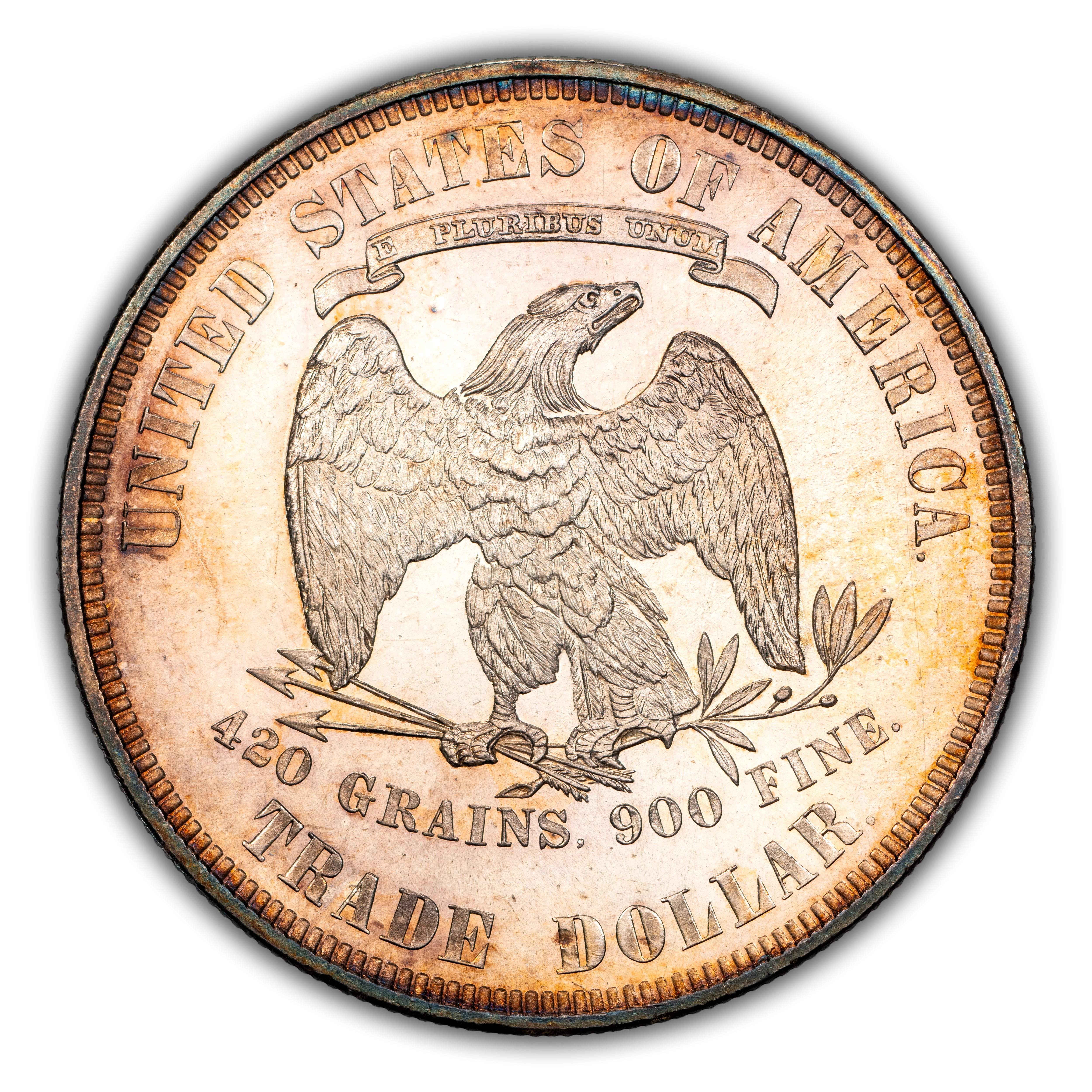 Reverse: An eagle is centered in the design with the weight of the coin listed below as "420 GRAINS. 900 FINE." The words UNITED STATES OF AMERICA and TRADE DOLLAR adorn the top and bottom periphery with a ribbon stating the motto E PLURIBUS UNUM above the eagle's head.