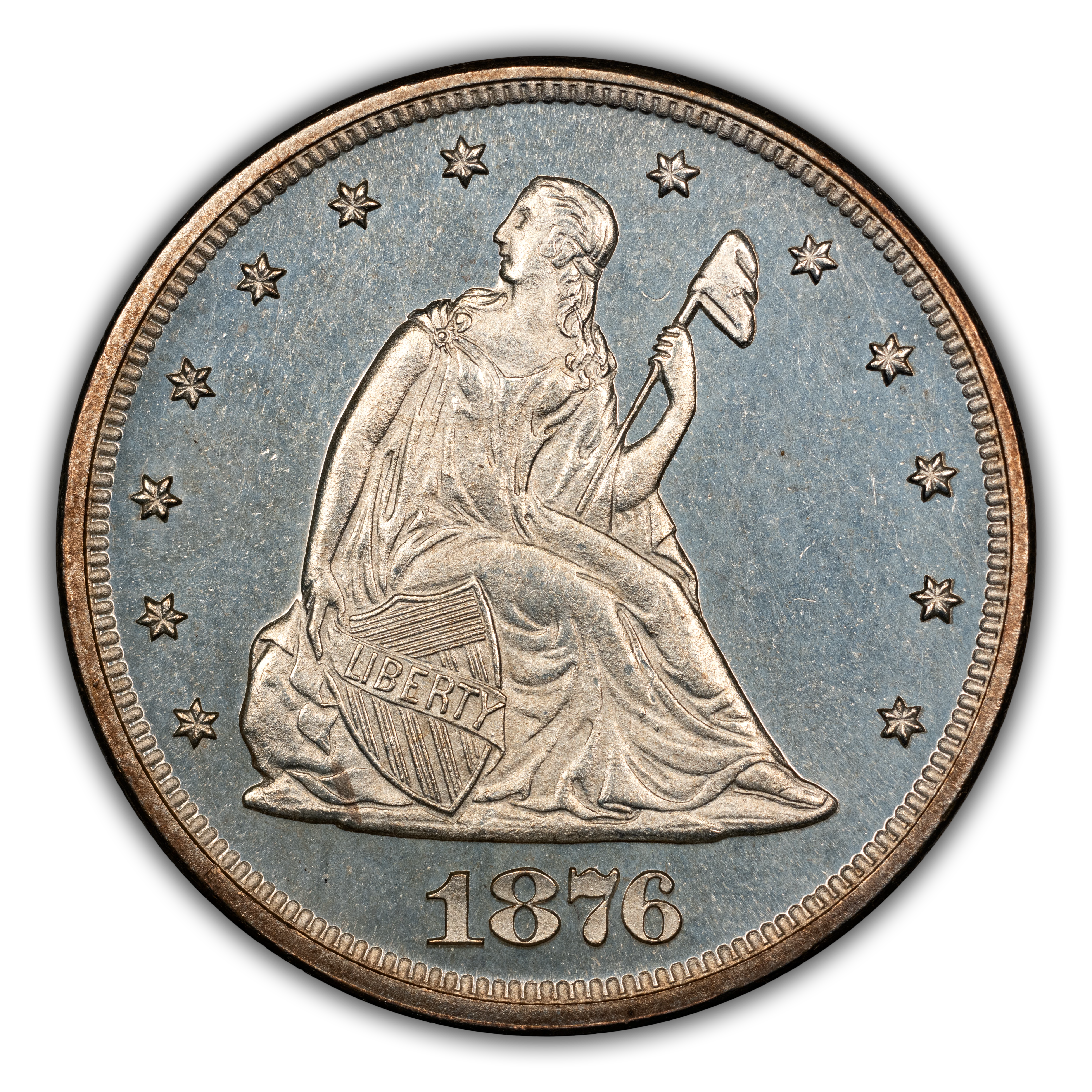 The 1876 Proof Twenty Cent Piece is one of the two proof type coins (the other being from 1875) from the 4 total issues. It is relatively common yet slightly harder to come by than its counterpart due to its mintage of 1,260. This date is decently scarce from the AU range all the way through MS66. The value escalates at a gradual pace through MS67 and at the finest known grade of PR68 (3 total), which are rare. The auction record is from a Heritage auction in 2007, in which one of those 3 PR68's sold for $54,625. As cameo and deep cameo pieces go there is an expected, yet subtle, premium. The survival estimate for the date is 700 although just 189 have a Cameo designation from PCGS and NGC and only 13 exist in Deep Cameo. Deep Cameos are very rare across all Twenty Cent dates.