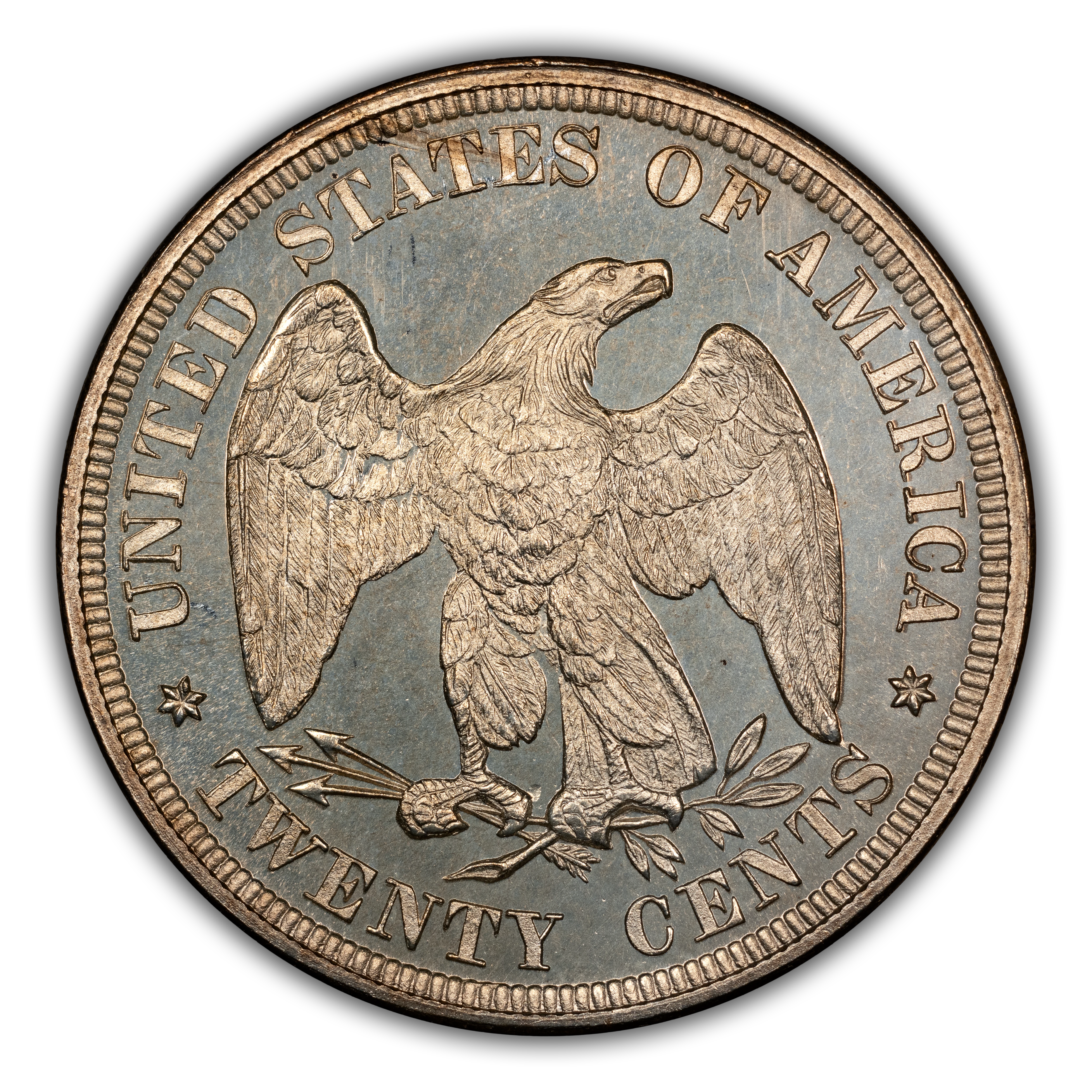 Reverse: An eagle is prominently featured with the words UNITED STATES OF AMERICA * TWENTY CENTS around the periphery.