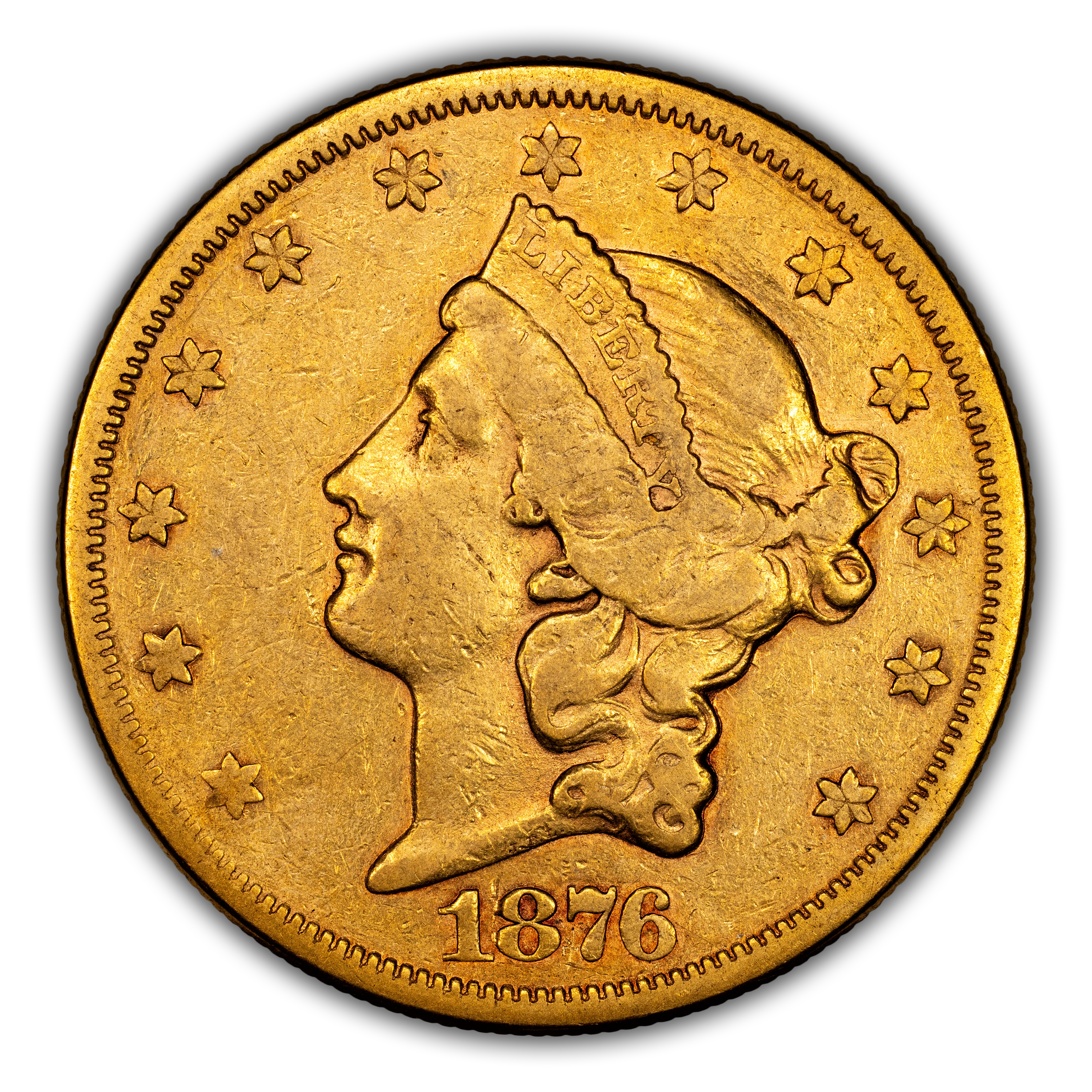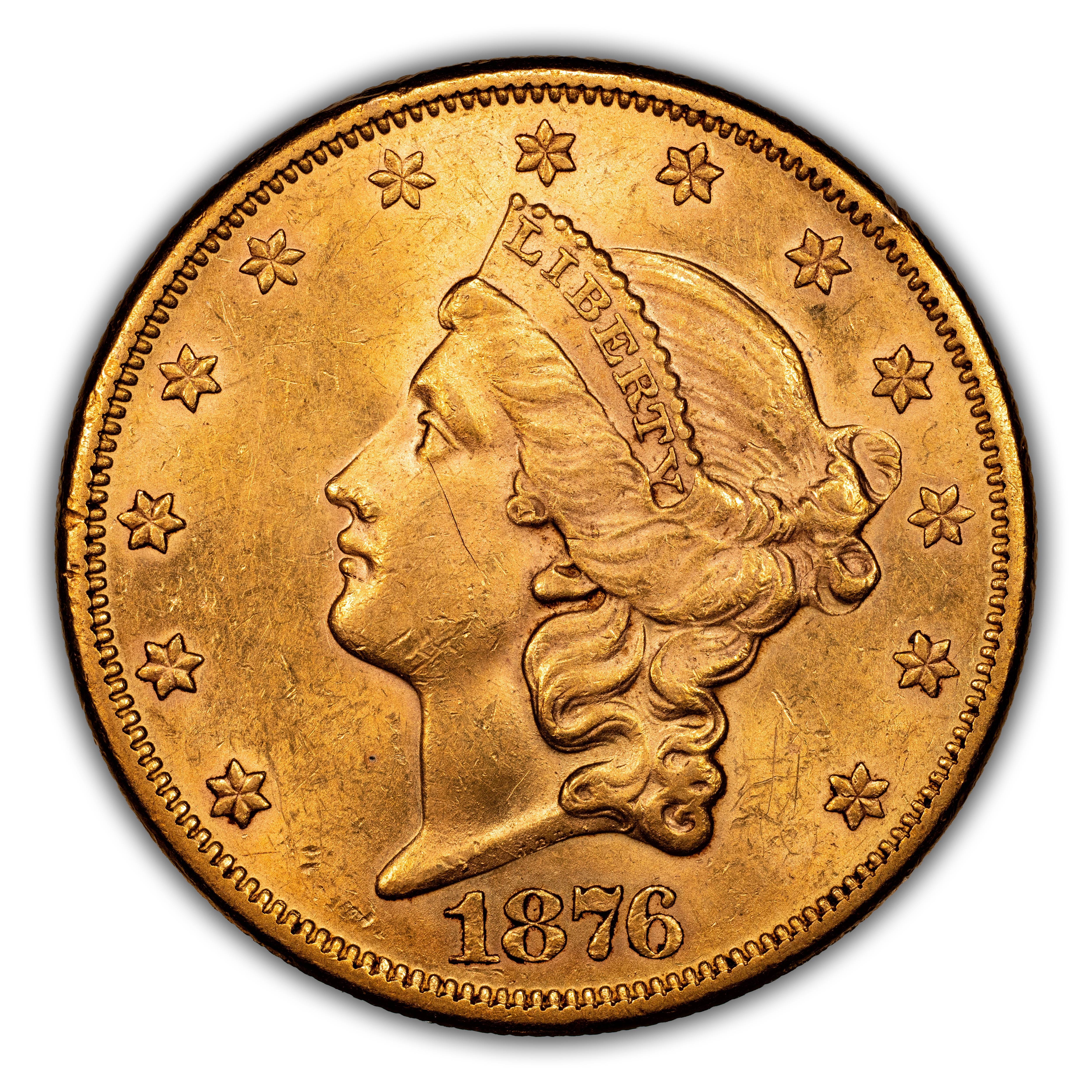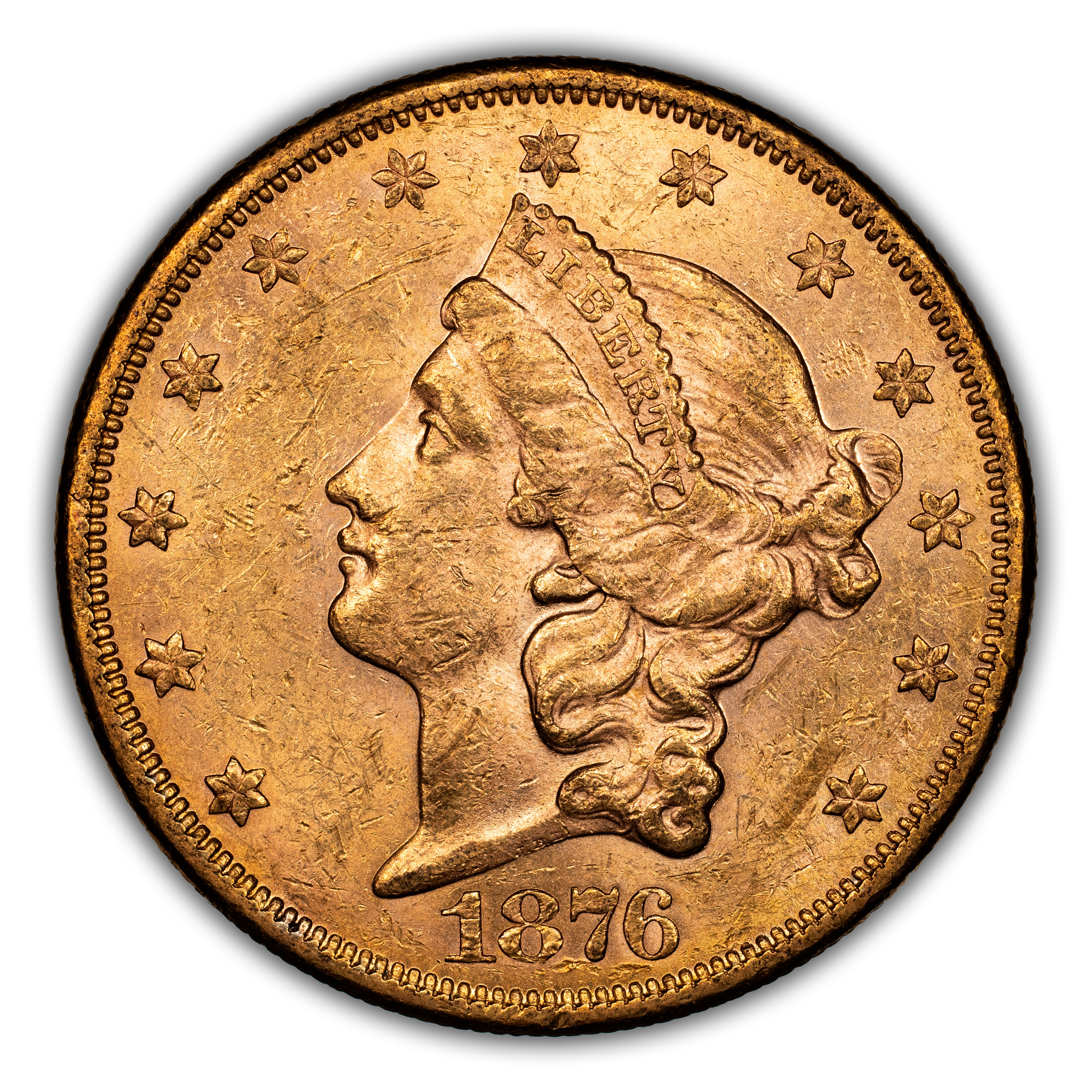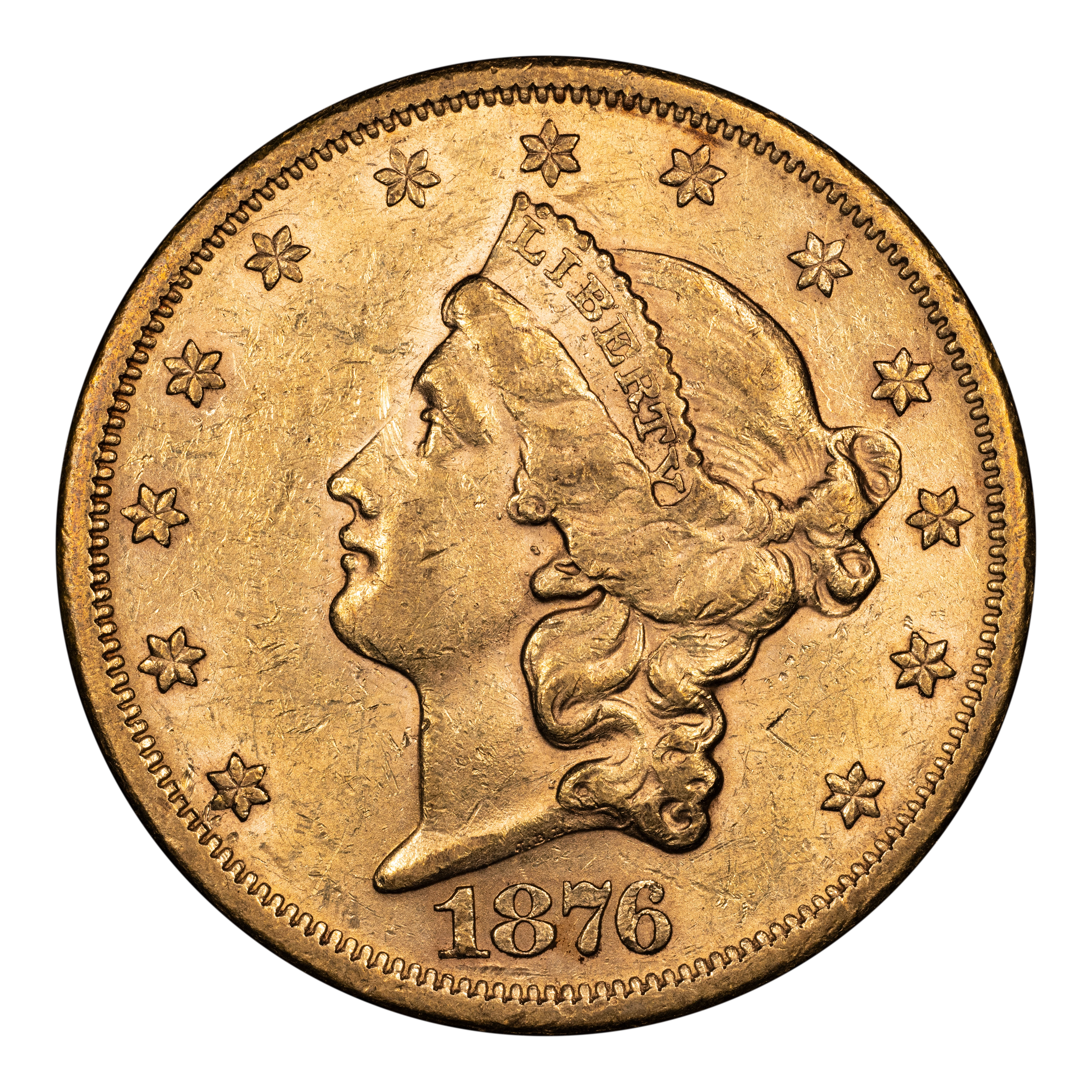 Reverse: Shielded eagle with wings outstretched holding arrows and olive branches. The words UNITED STATES OF AMERICA * TWENTY D. appear around the periphery. Mint mark, if any, appears below the eagle's tail, above the N in TWENTY.