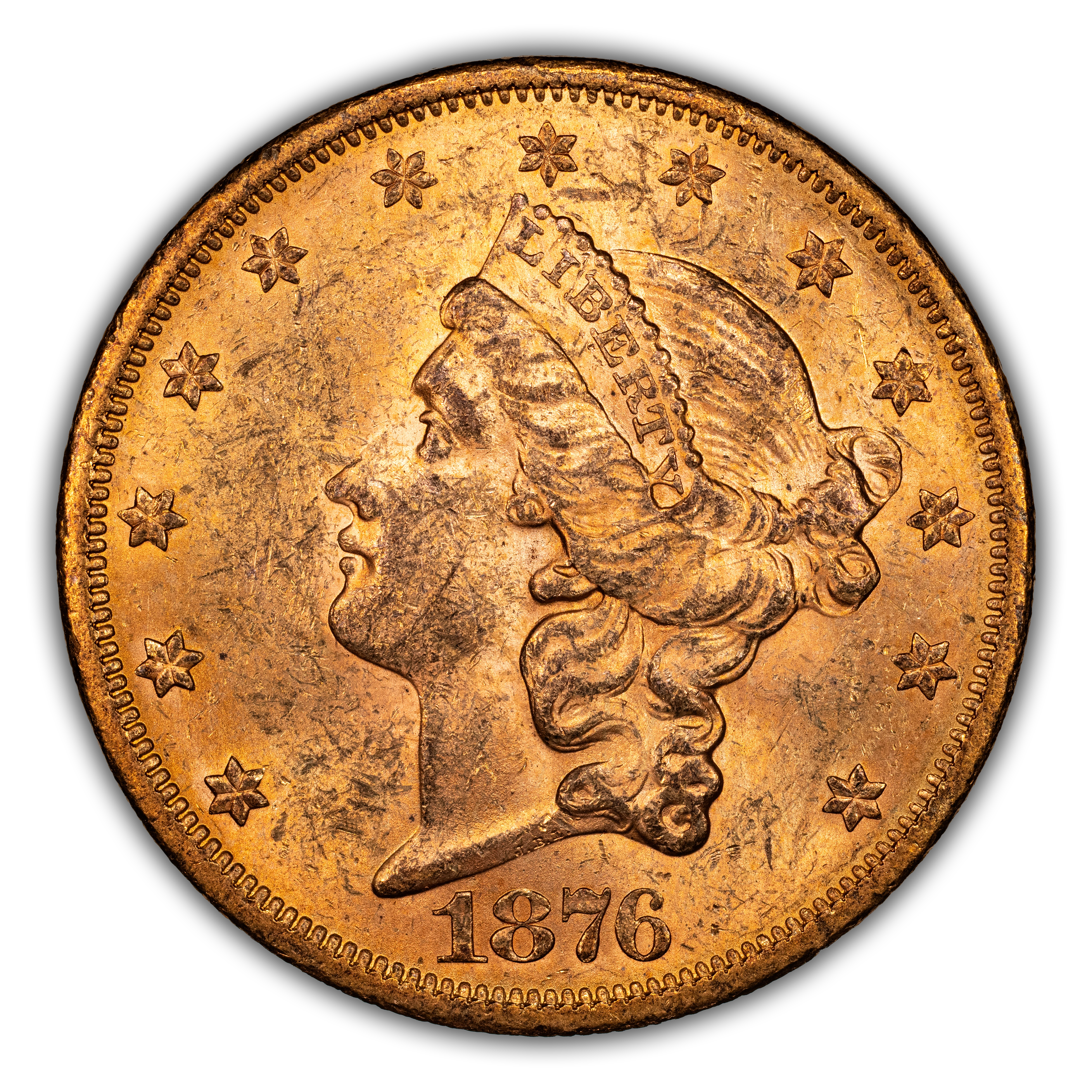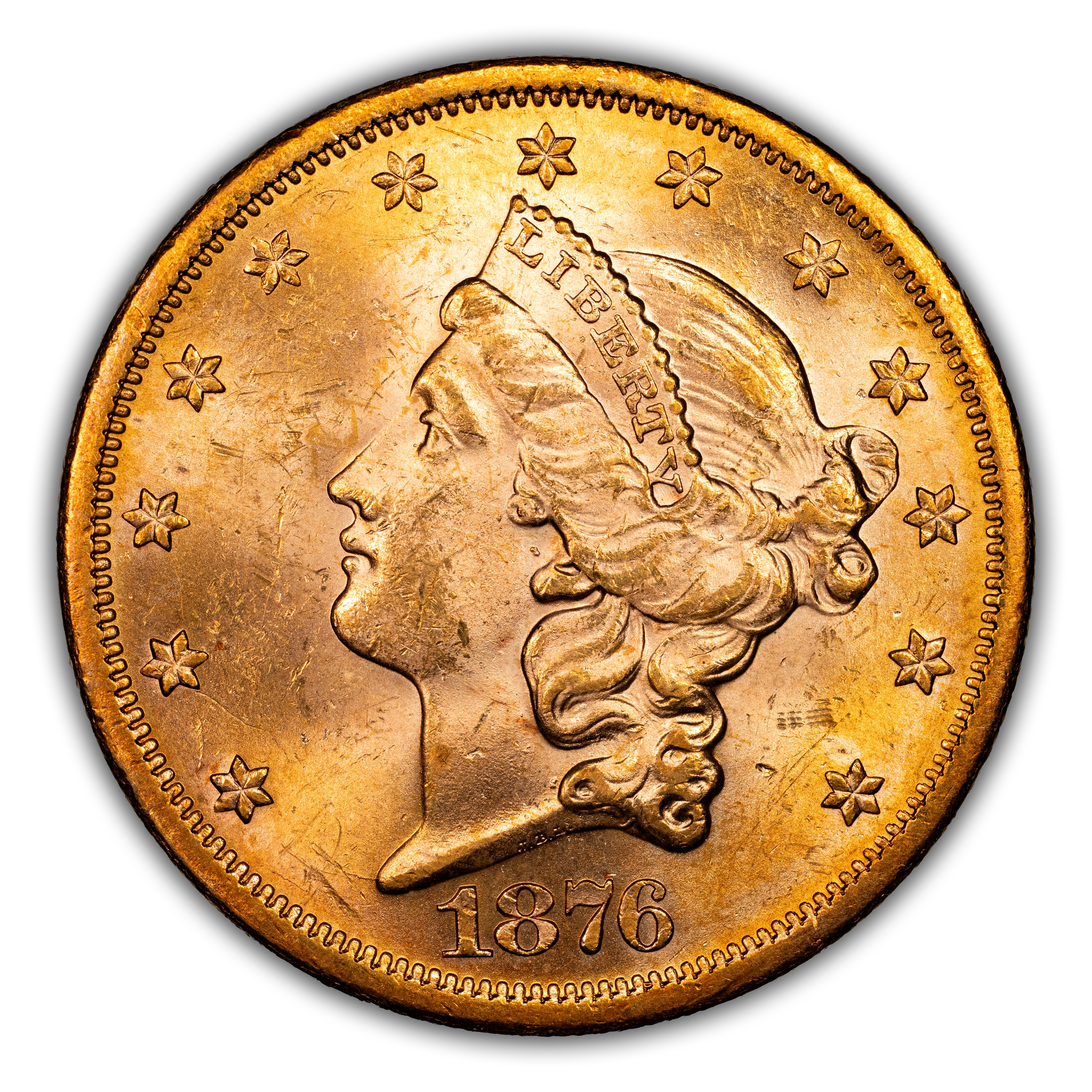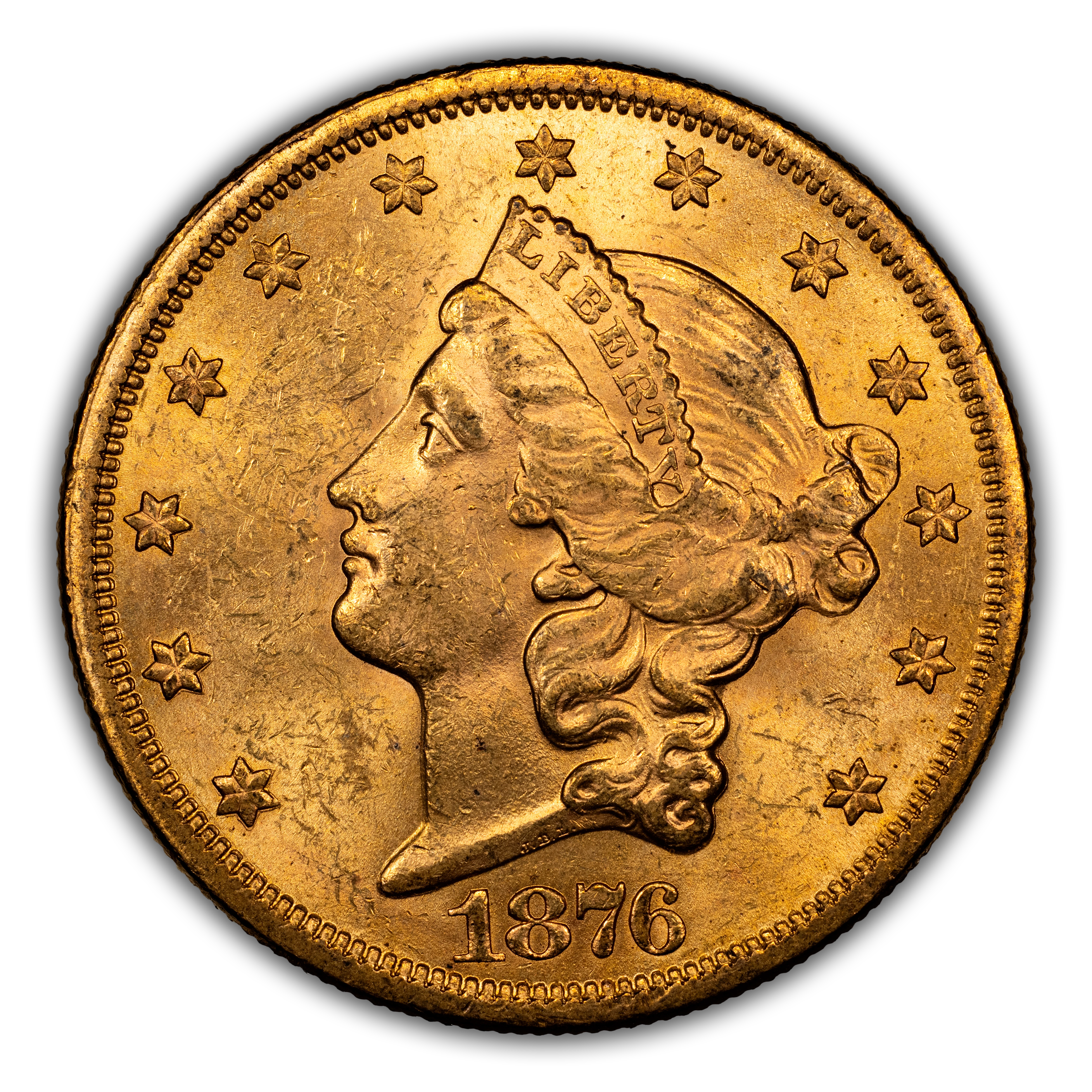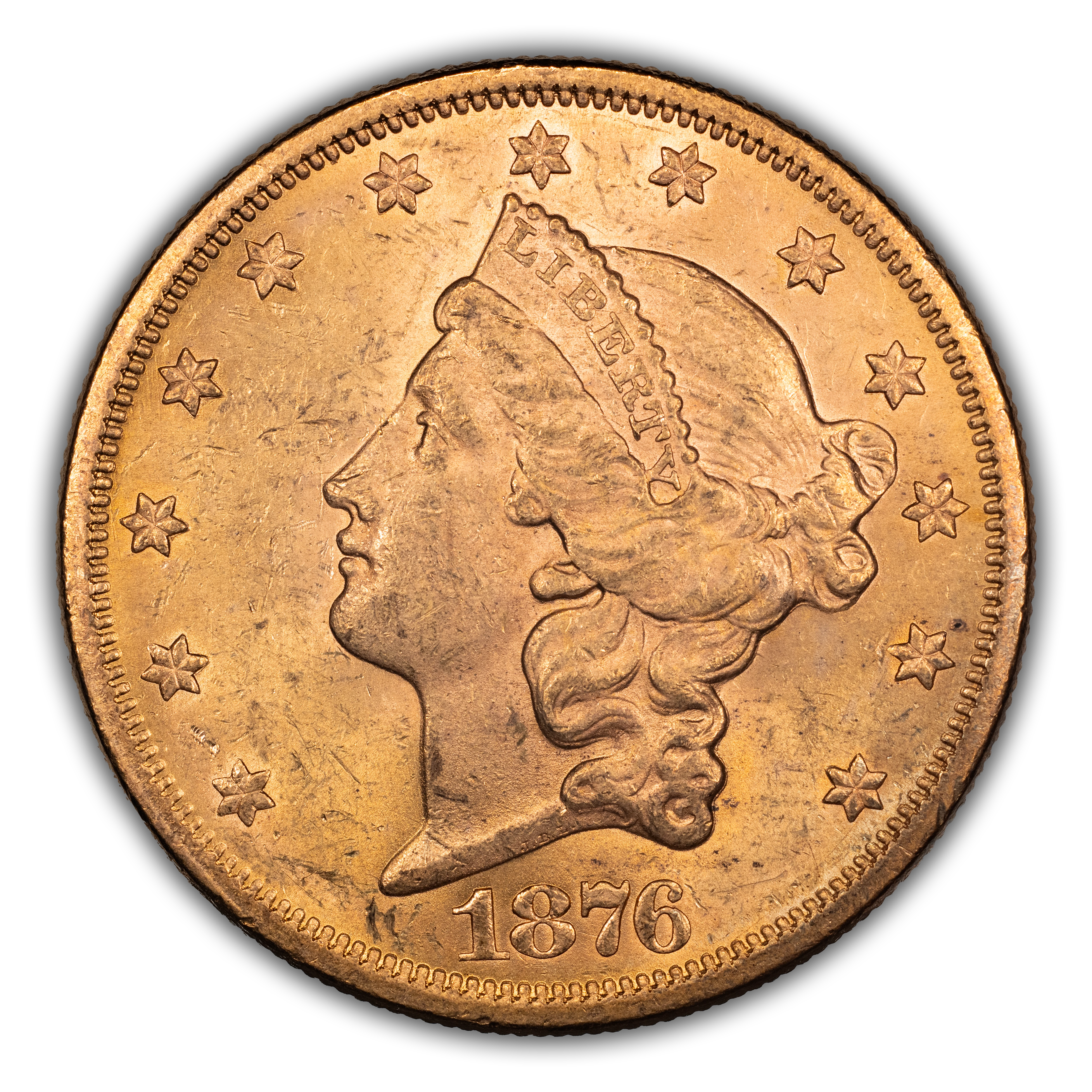 Reverse: Shielded eagle with wings outstretched holding arrows and olive branches. The words UNITED STATES OF AMERICA * TWENTY D. appear around the periphery. Mint mark, if any, appears below the eagle's tail, above the N in TWENTY.