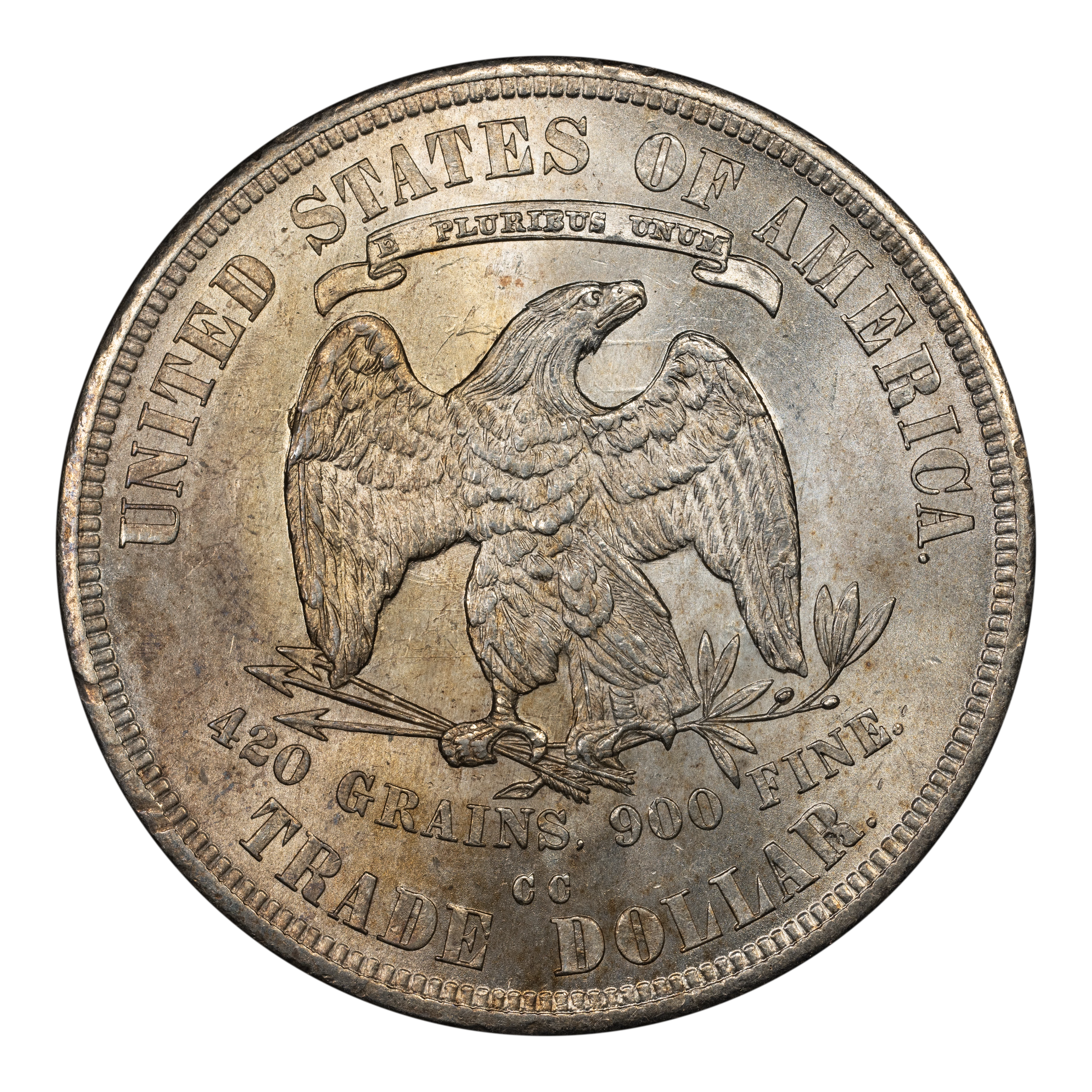 Reverse: An eagle is centered in the design with the weight of the coin listed below as "420 GRAINS. 900 FINE." The words UNITED STATES OF AMERICA and TRADE DOLLAR adorn the top and bottom periphery with a ribbon stating the motto E PLURIBUS UNUM above the eagle's head. The mint mark is positioned below the eagle and weight text, above the "E D" of TRADE DOLLAR. Type II reverse without the extra berry under the eagle's left (viewer's right) claw. Arrowhead ends over 2 in "420".