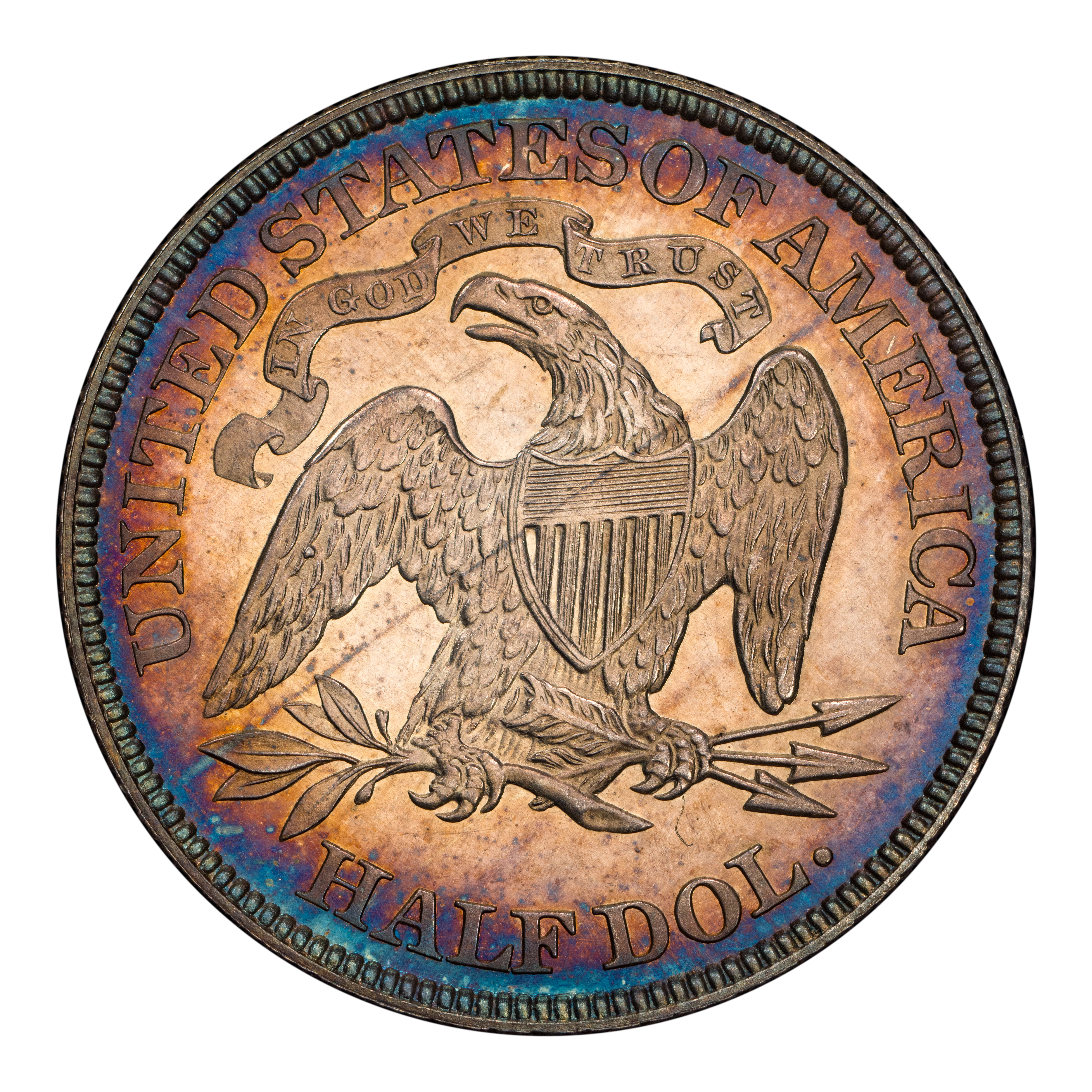 Reverse: The heraldic eagle is centered in the design with the words UNITED STATES OF AMERICA and HALF DOL. around the periphery. A ribbon above the eagle's head bears the motto IN GOD WE TRUST