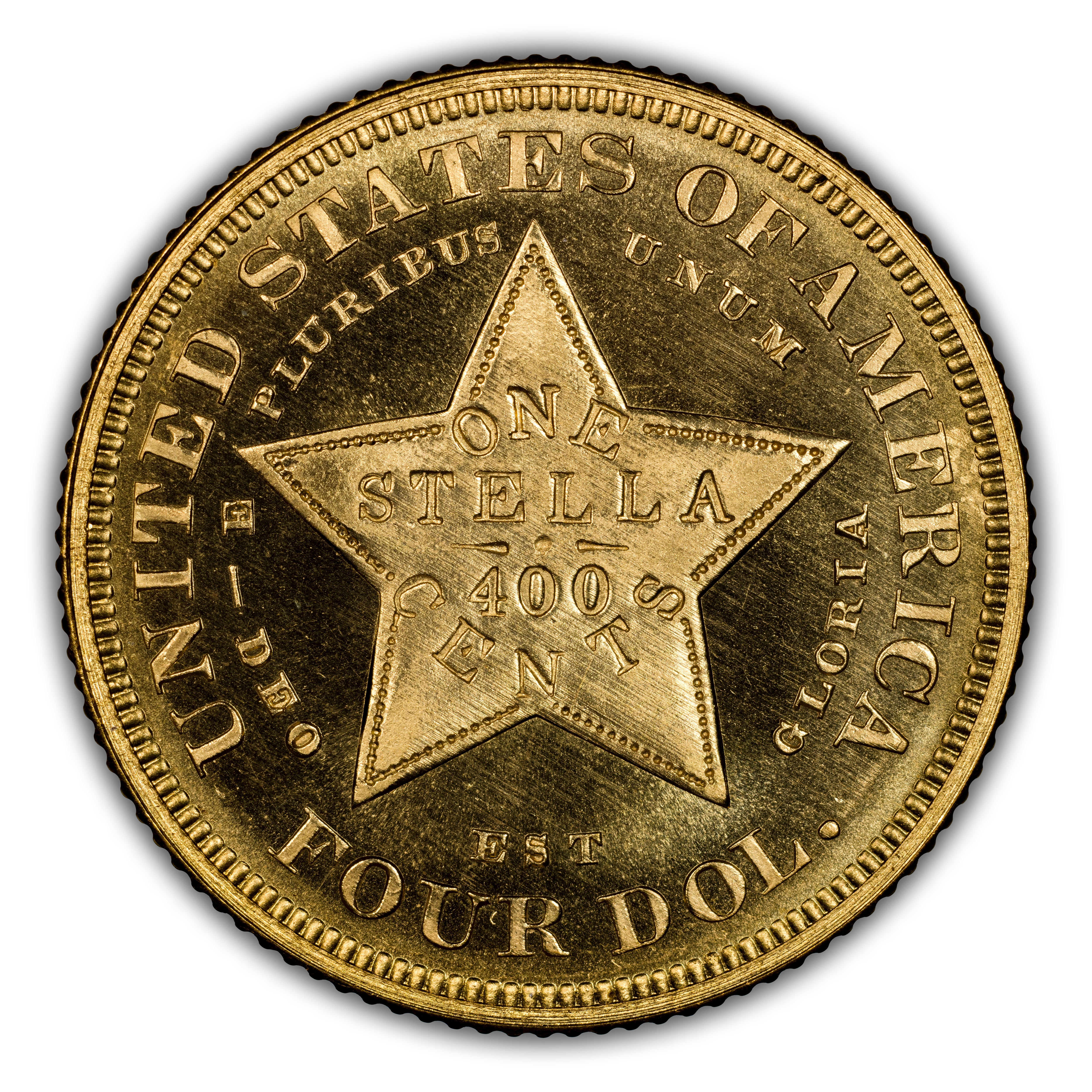 Reverse: A star is centered with the words "ONE STELLA", "400 CENTS" written inside. UNITED STATES OF AMERICA * FOUR DOL. around the periphery. The words "DEO EST GLORIA", "E PLURIBUS UNUM" are written inside the circumference.