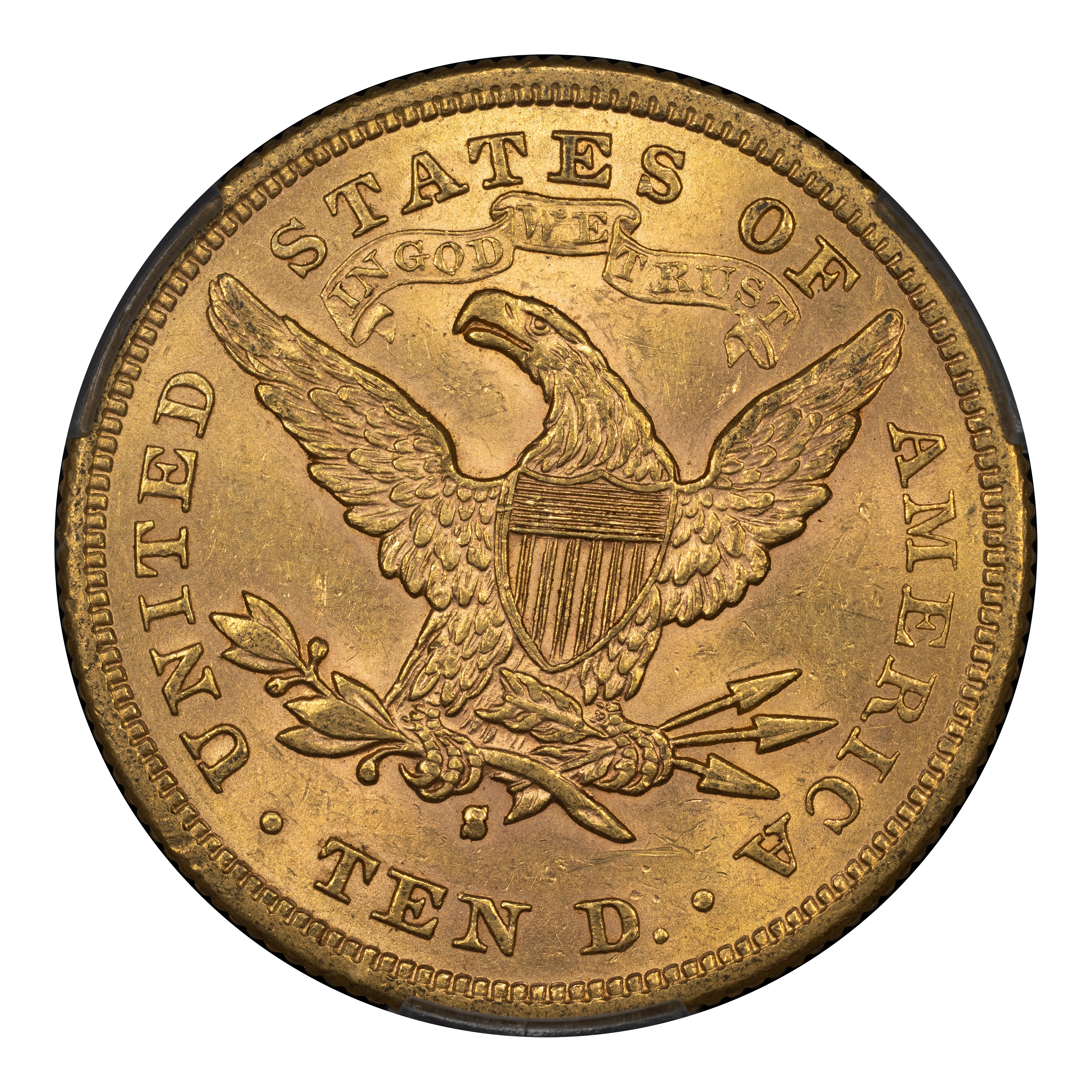 Reverse: Heraldic eagle holding arrows and branch in its claws is centered in the design with the words UNITED STATES OF AMERICA * TEN D. around the periphery. Mintmark (if any) is located under the eagle's claws.