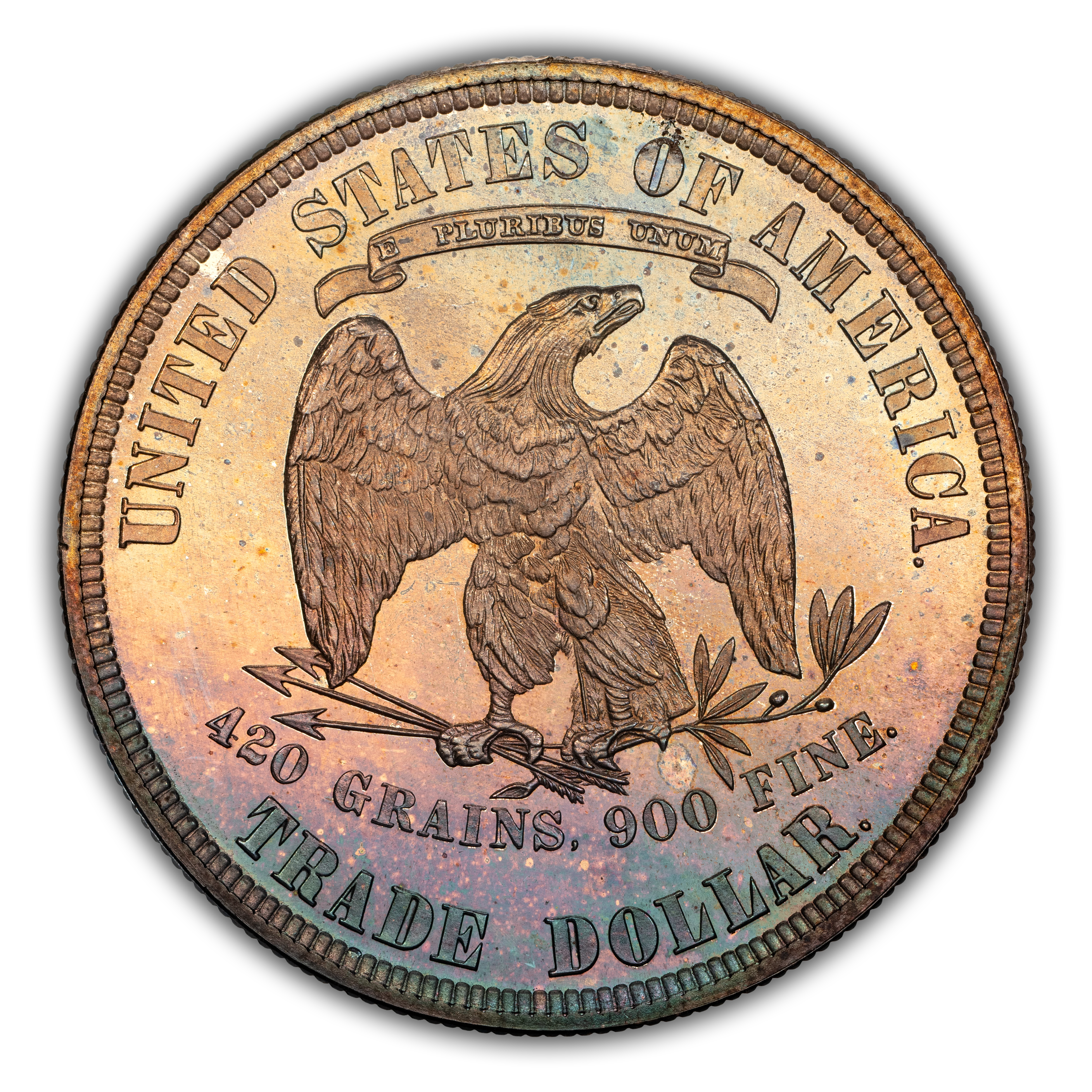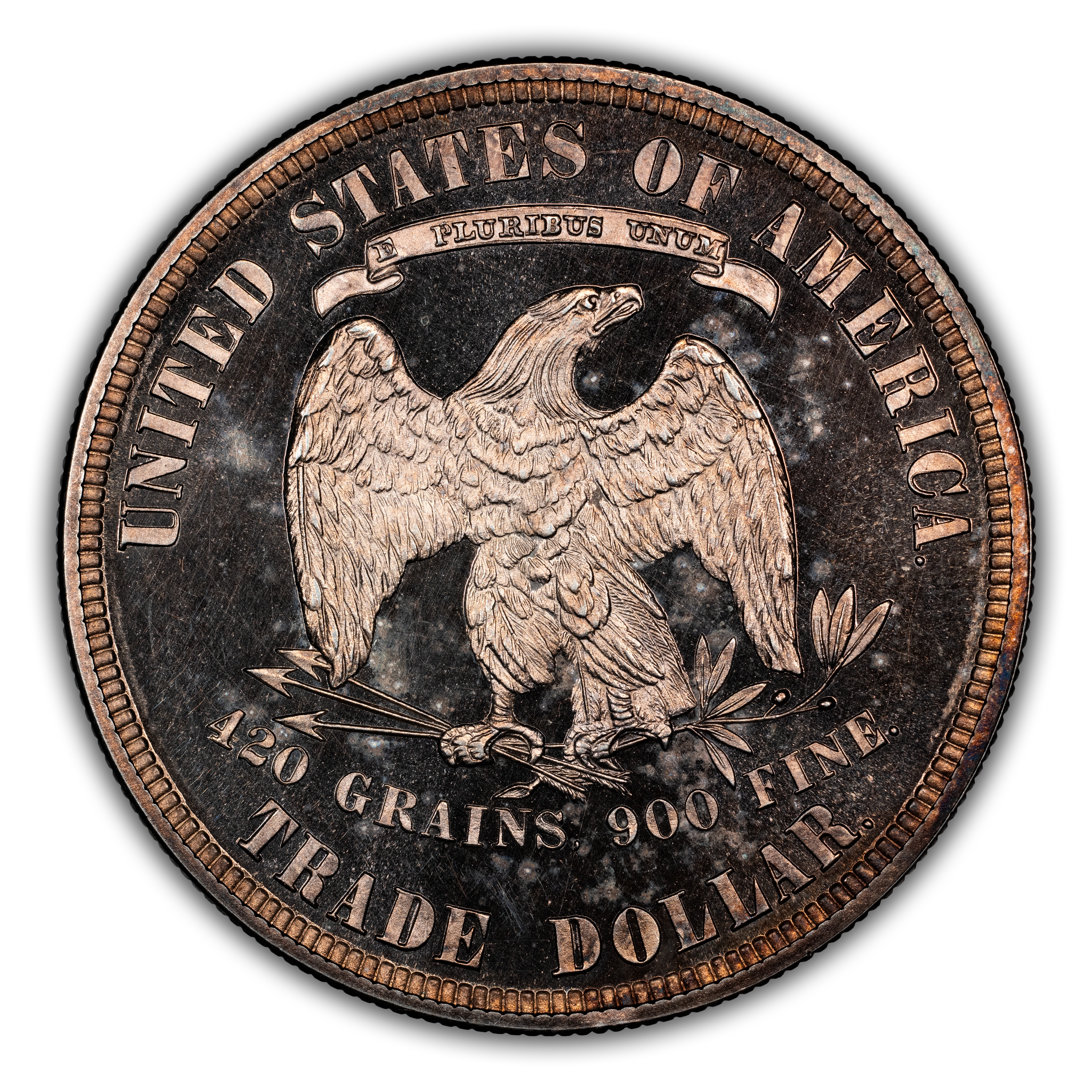 Reverse: An eagle is centered in the design with the weight of the coin listed below as "420 GRAINS. 900 FINE." The words UNITED STATES OF AMERICA and TRADE DOLLAR adorn the top and bottom periphery with a ribbon stating the motto E PLURIBUS UNUM above the eagle's head.