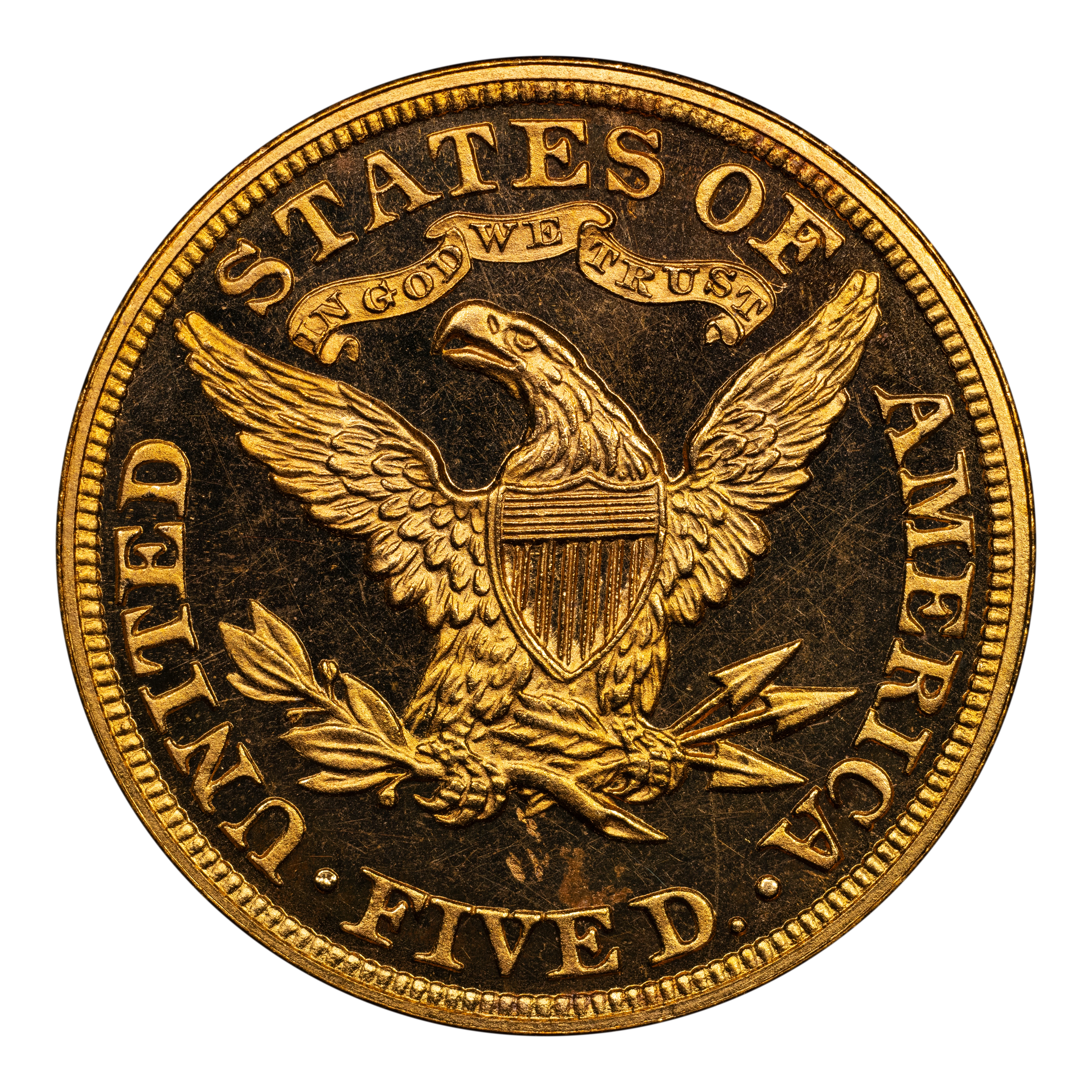 Reverse: Heraldic eagle holding arrows and branch in its claws is centered in the design with the words UNITED STATES OF AMERICA * FIVE D. around the periphery. Mintmark (if any) is located under the eagle's claws.