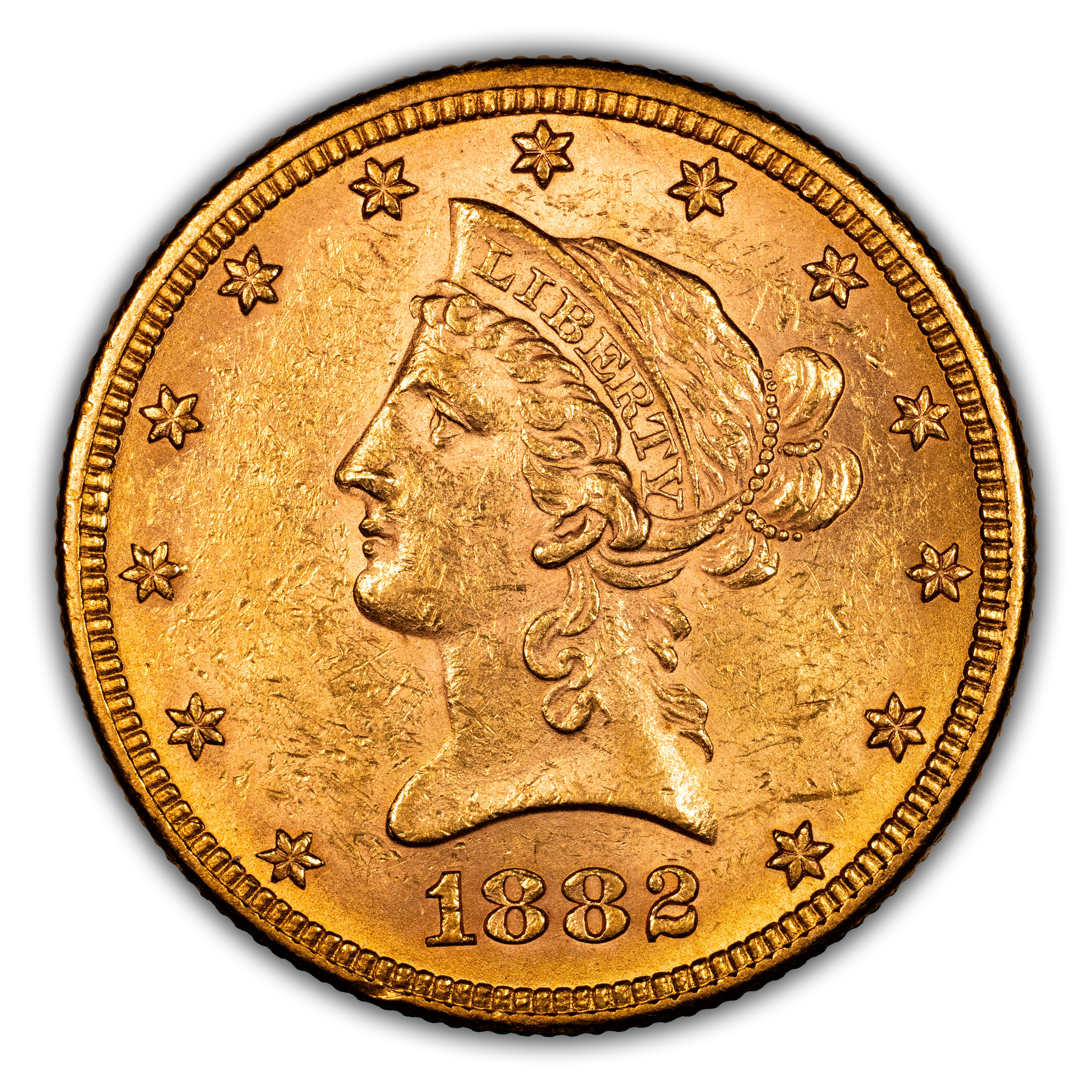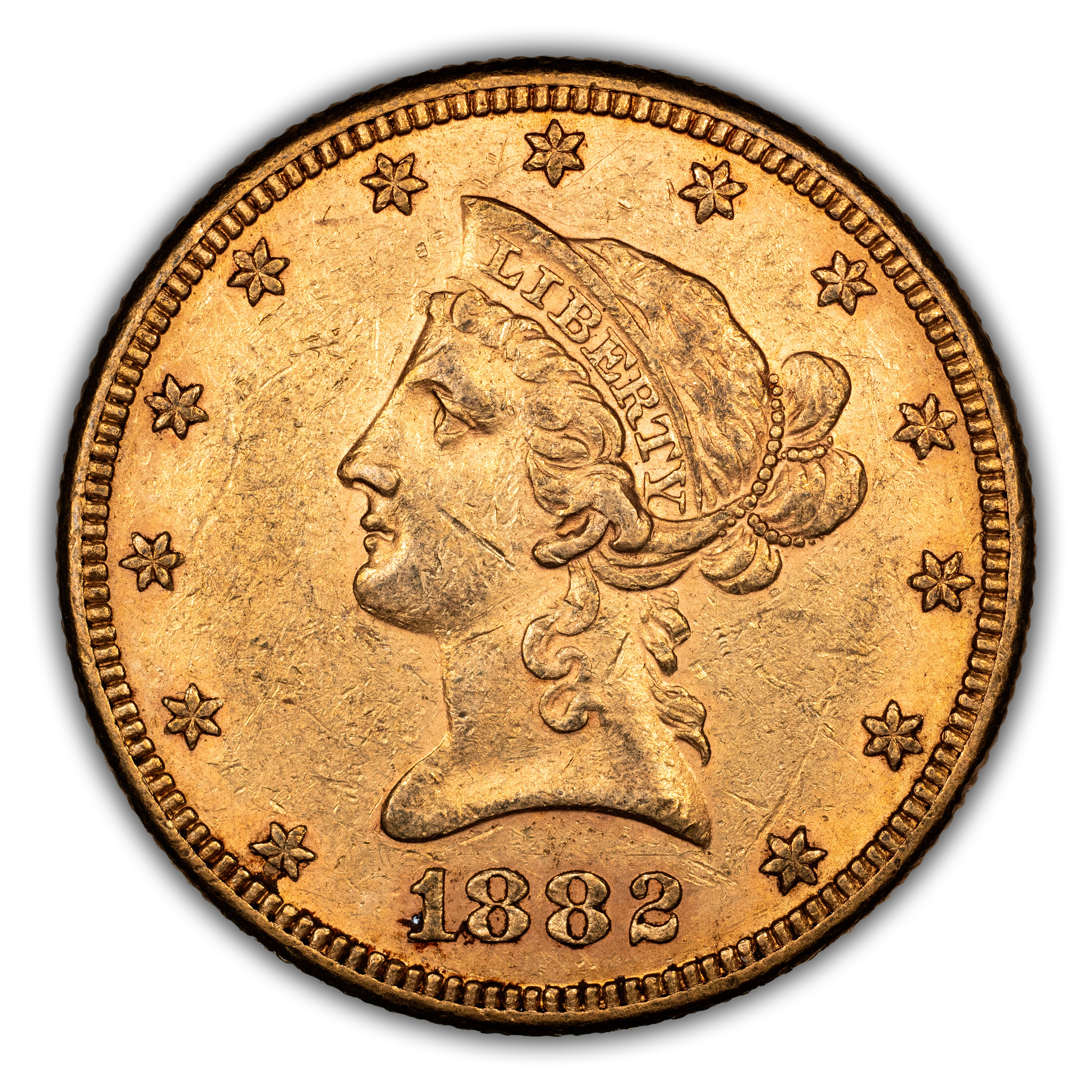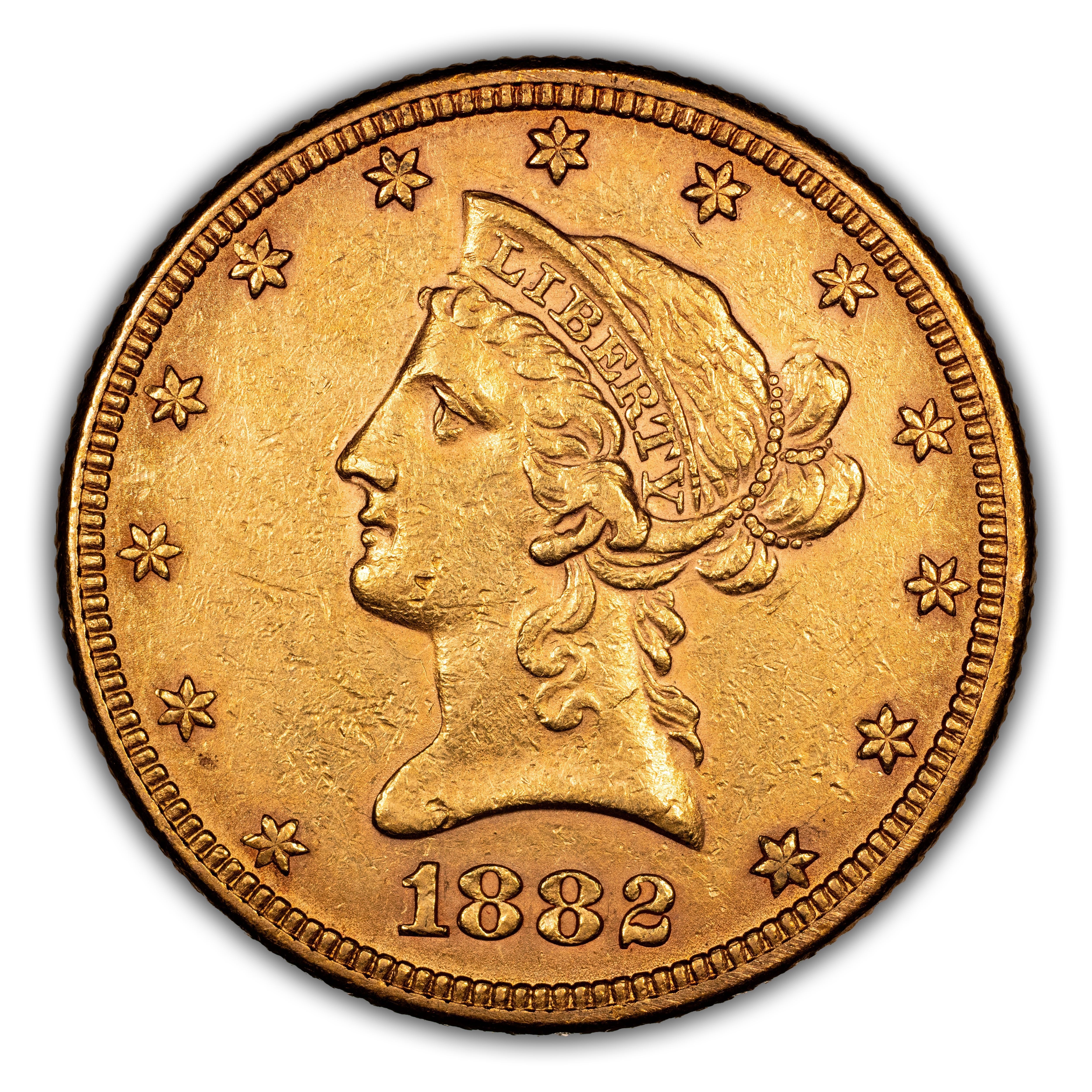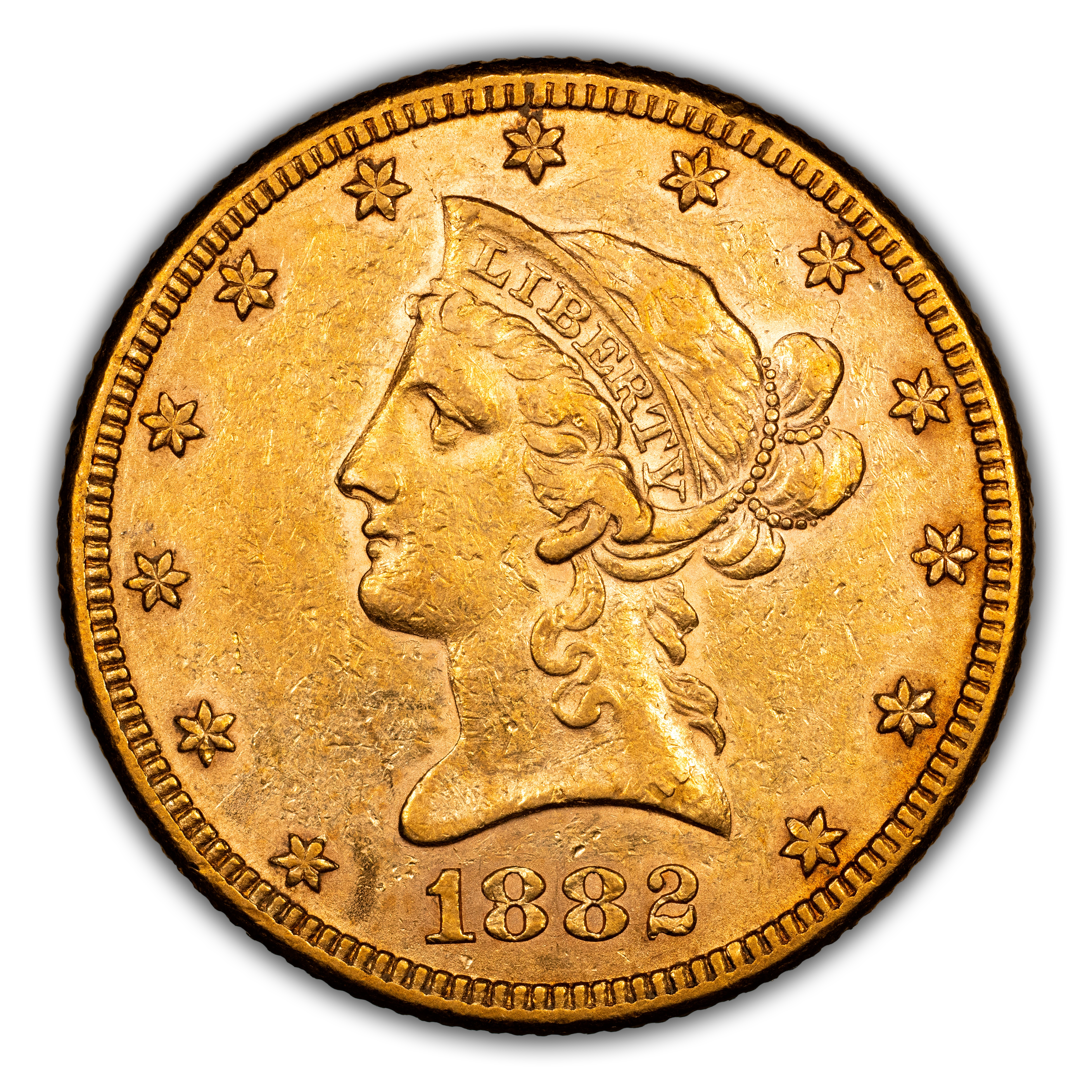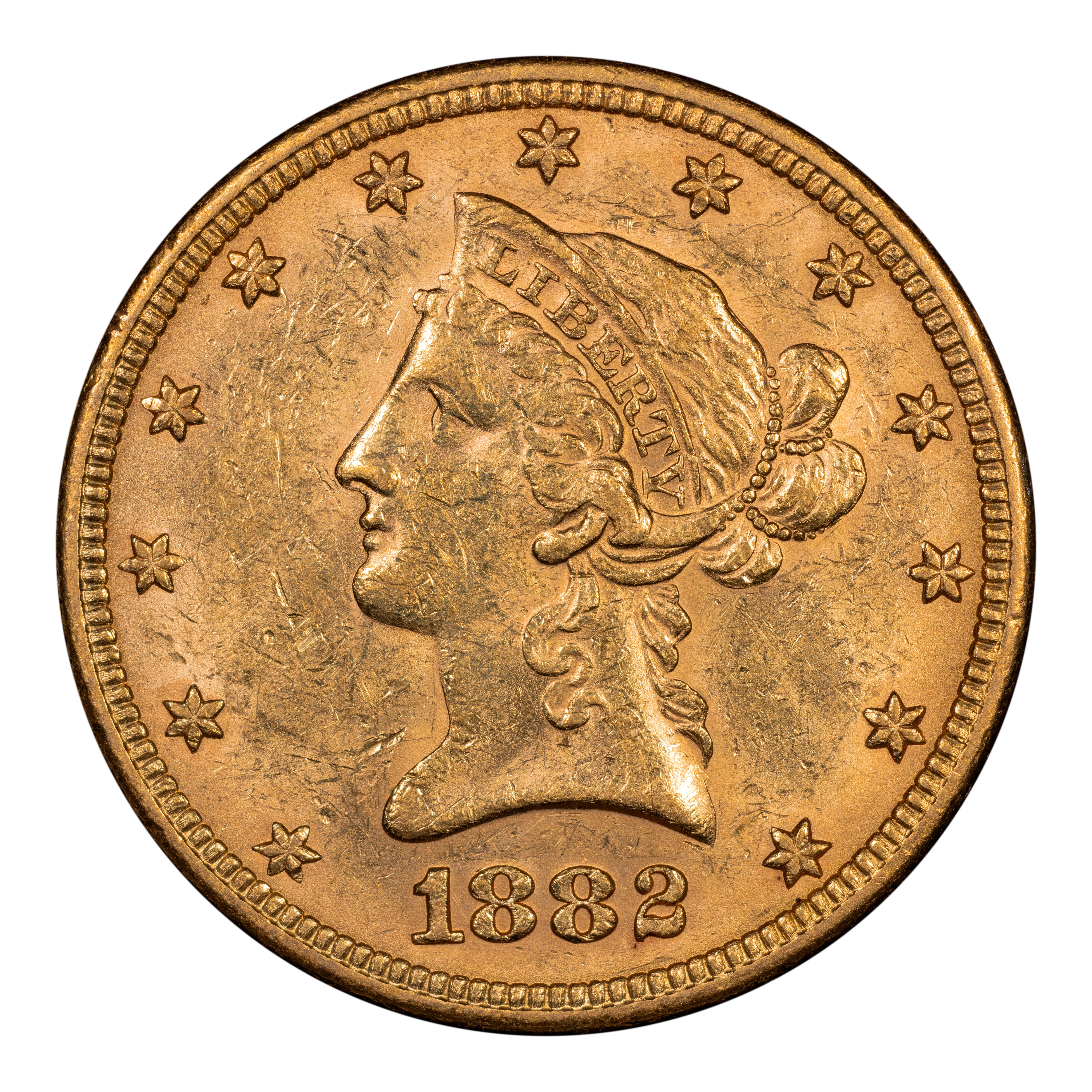 Reverse: Heraldic eagle holding arrows and branch in its claws is centered in the design with the words UNITED STATES OF AMERICA * TEN D. around the periphery.