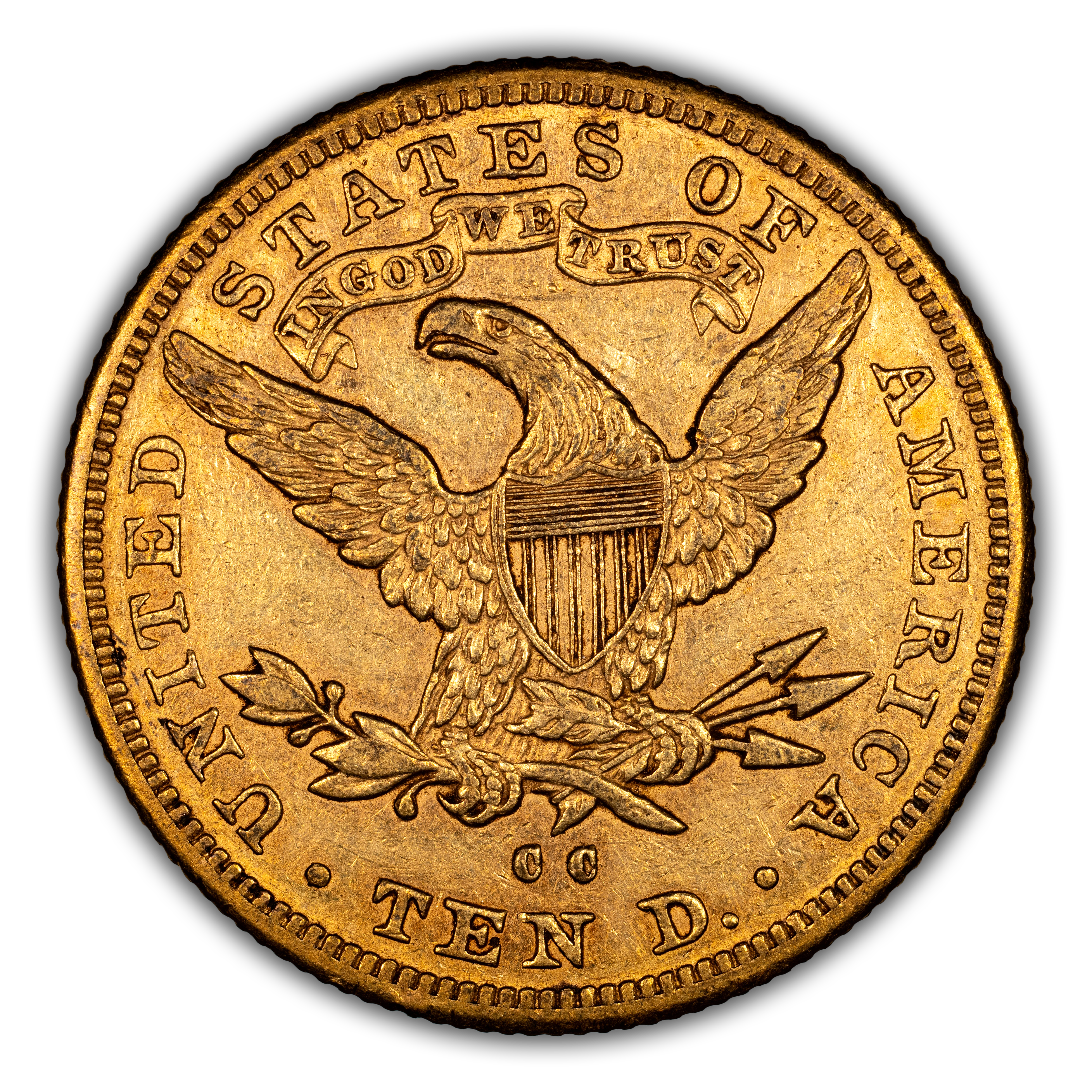 Reverse: Heraldic eagle holding arrows and branch in its claws is centered in the design with the words UNITED STATES OF AMERICA * TEN D. around the periphery. Mintmark (if any) is located under the eagle's claws.
