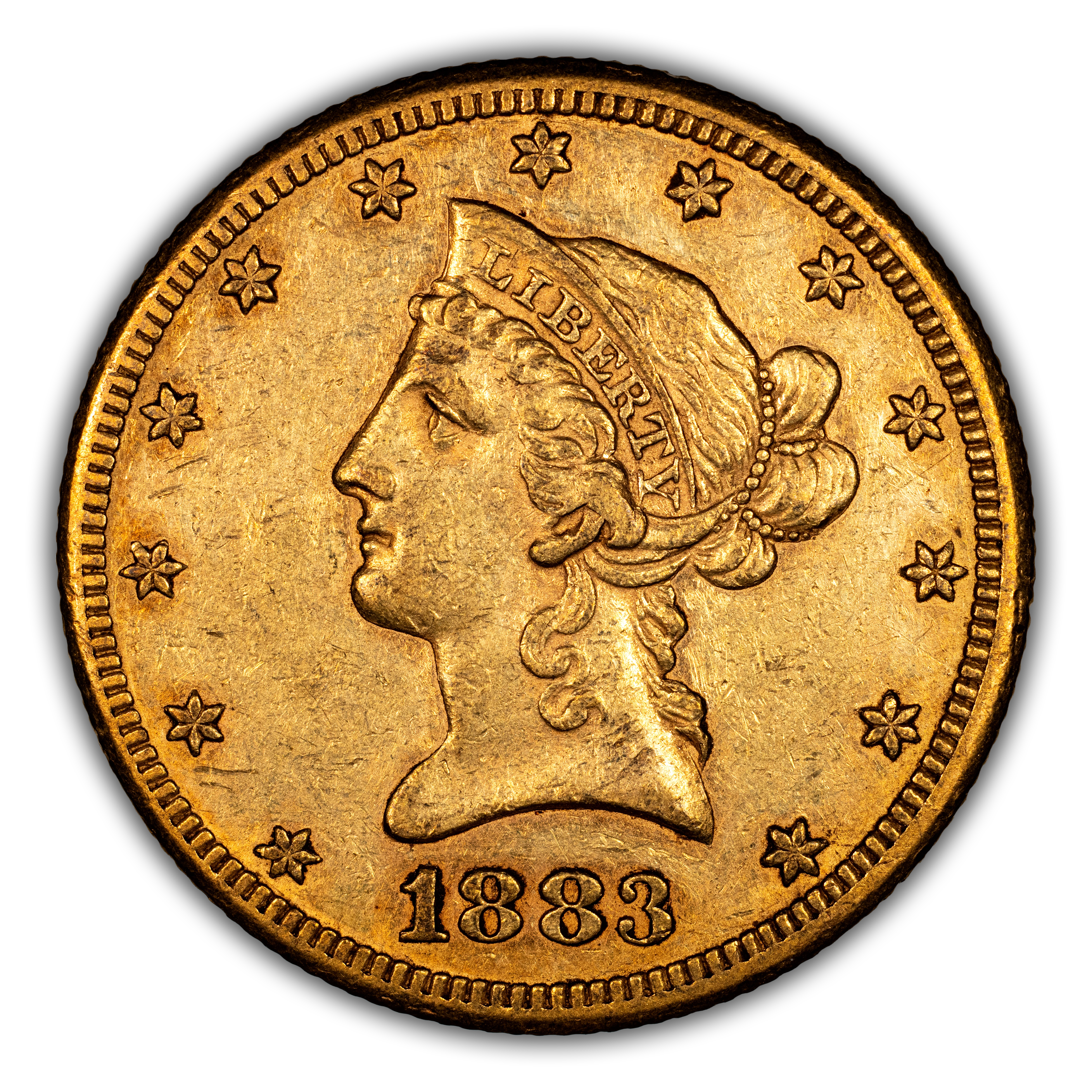 1883-CC $10 AU53 NGC. Variety 3-D....