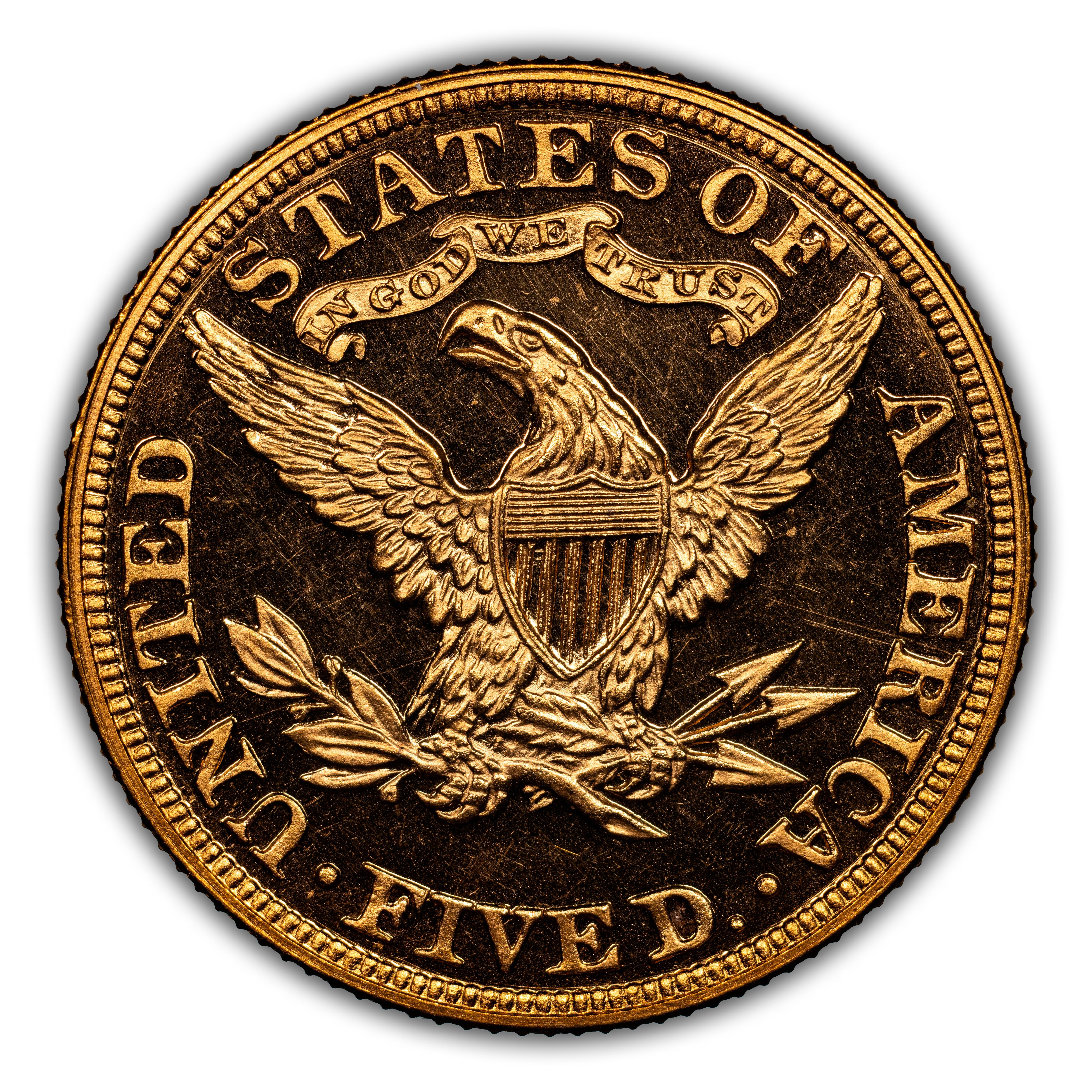 Reverse: Heraldic eagle holding arrows and branch in its claws is centered in the design with the words UNITED STATES OF AMERICA * FIVE D. around the periphery. Mintmark (if any) is located under the eagle's claws.