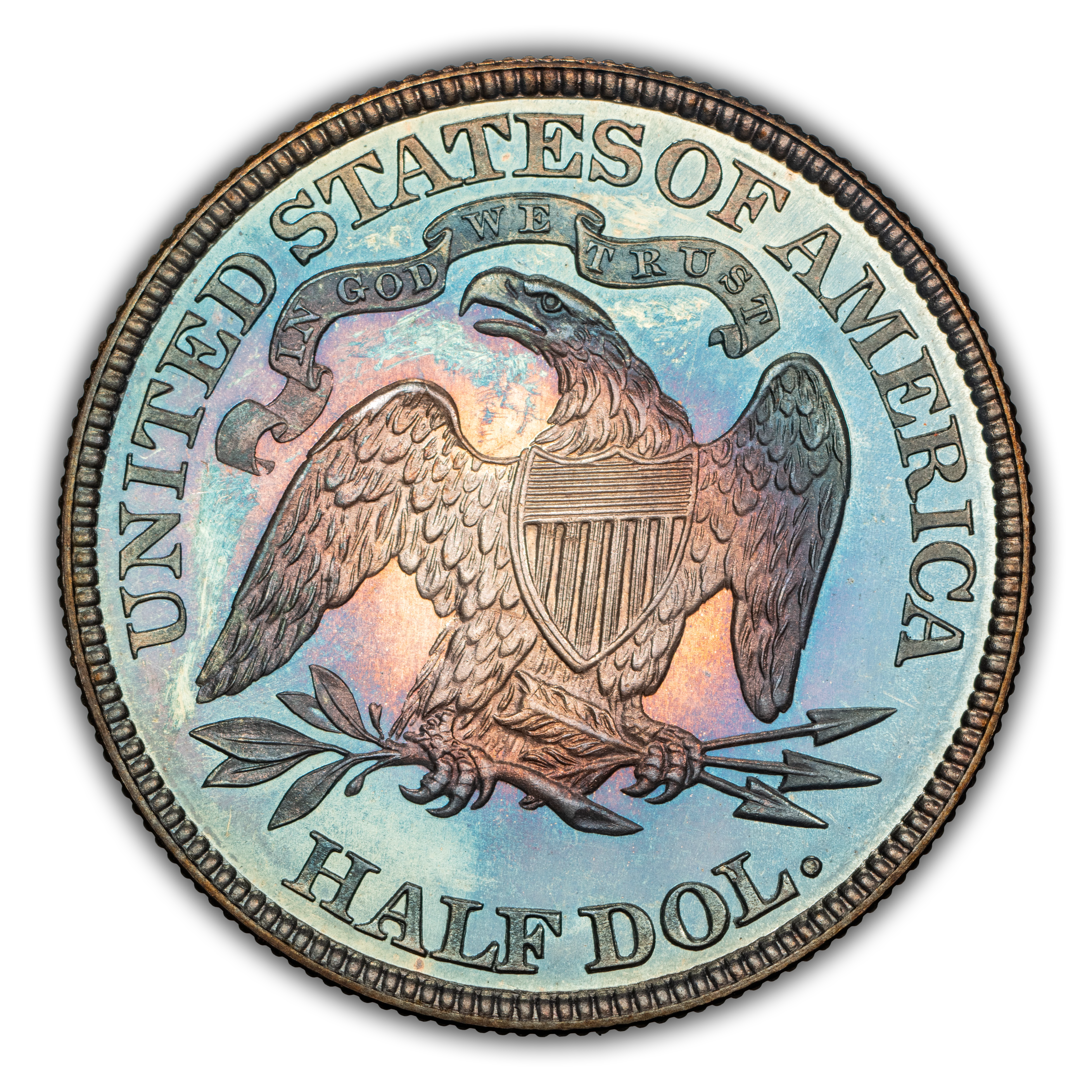 Reverse: The heraldic eagle is centered in the design with the words UNITED STATES OF AMERICA and HALF DOL. around the periphery. A ribbon above the eagle's head bears the motto IN GOD WE TRUST