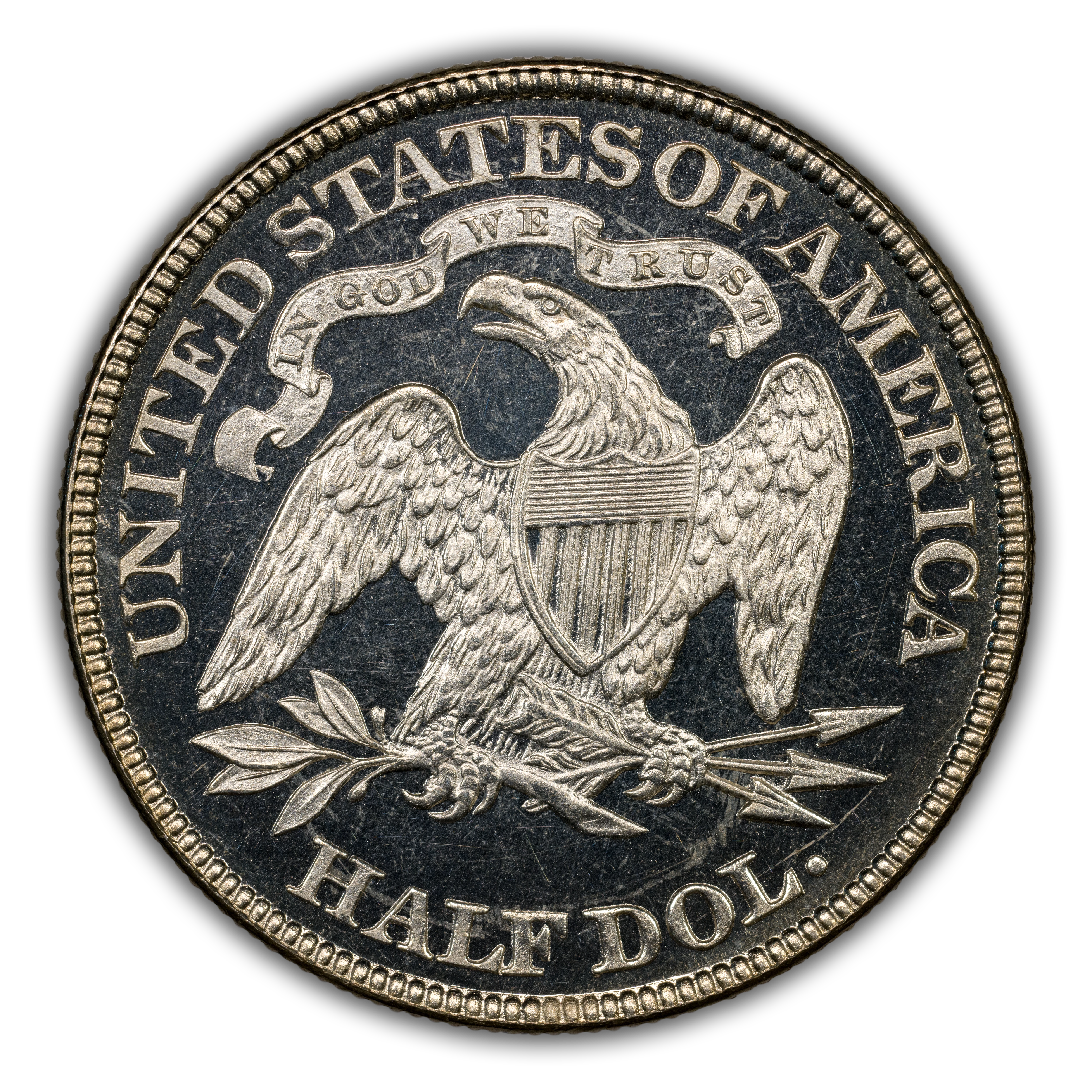 Reverse: The heraldic eagle is centered in the design with the words UNITED STATES OF AMERICA and HALF DOL. around the periphery. A ribbon above the eagle's head bears the motto IN GOD WE TRUST