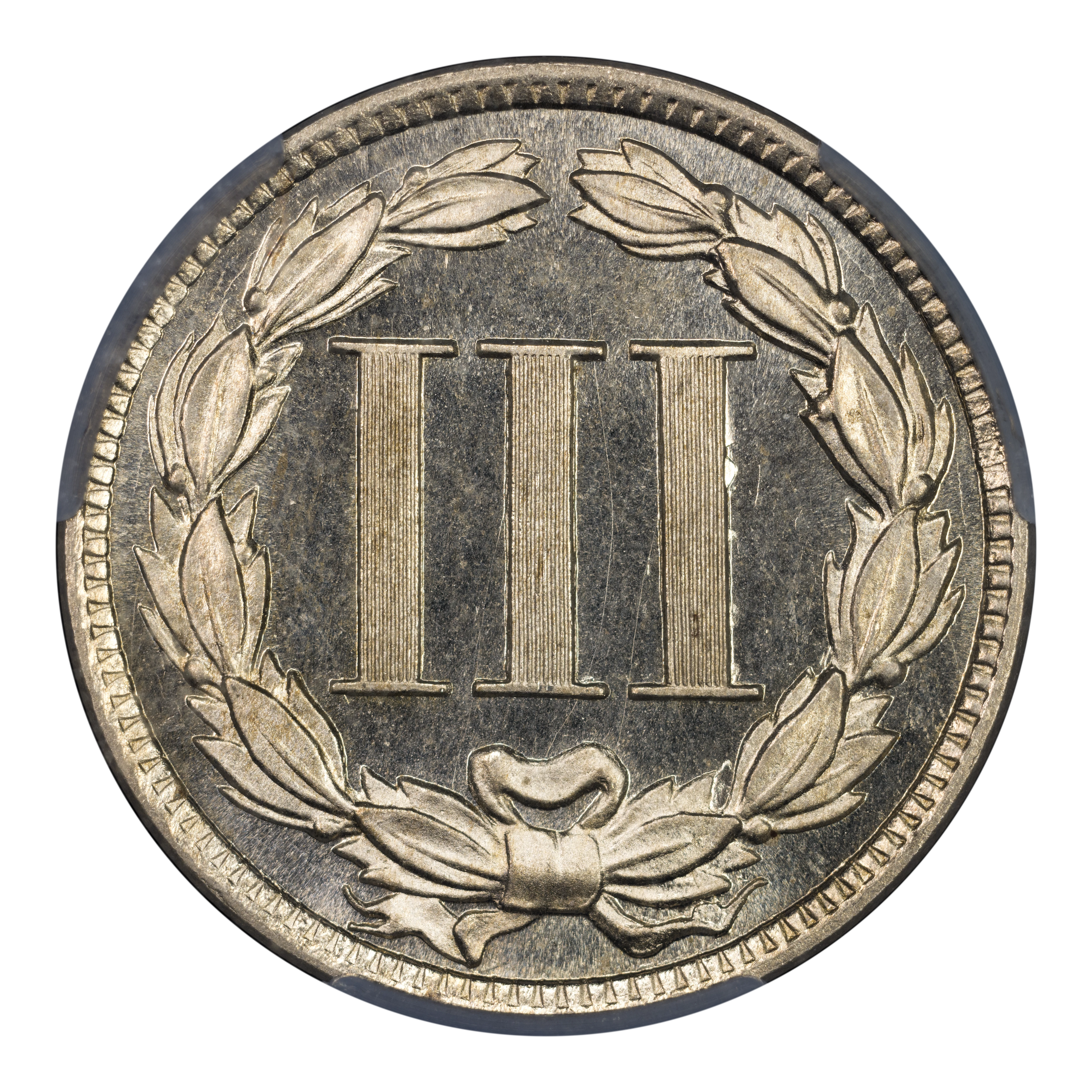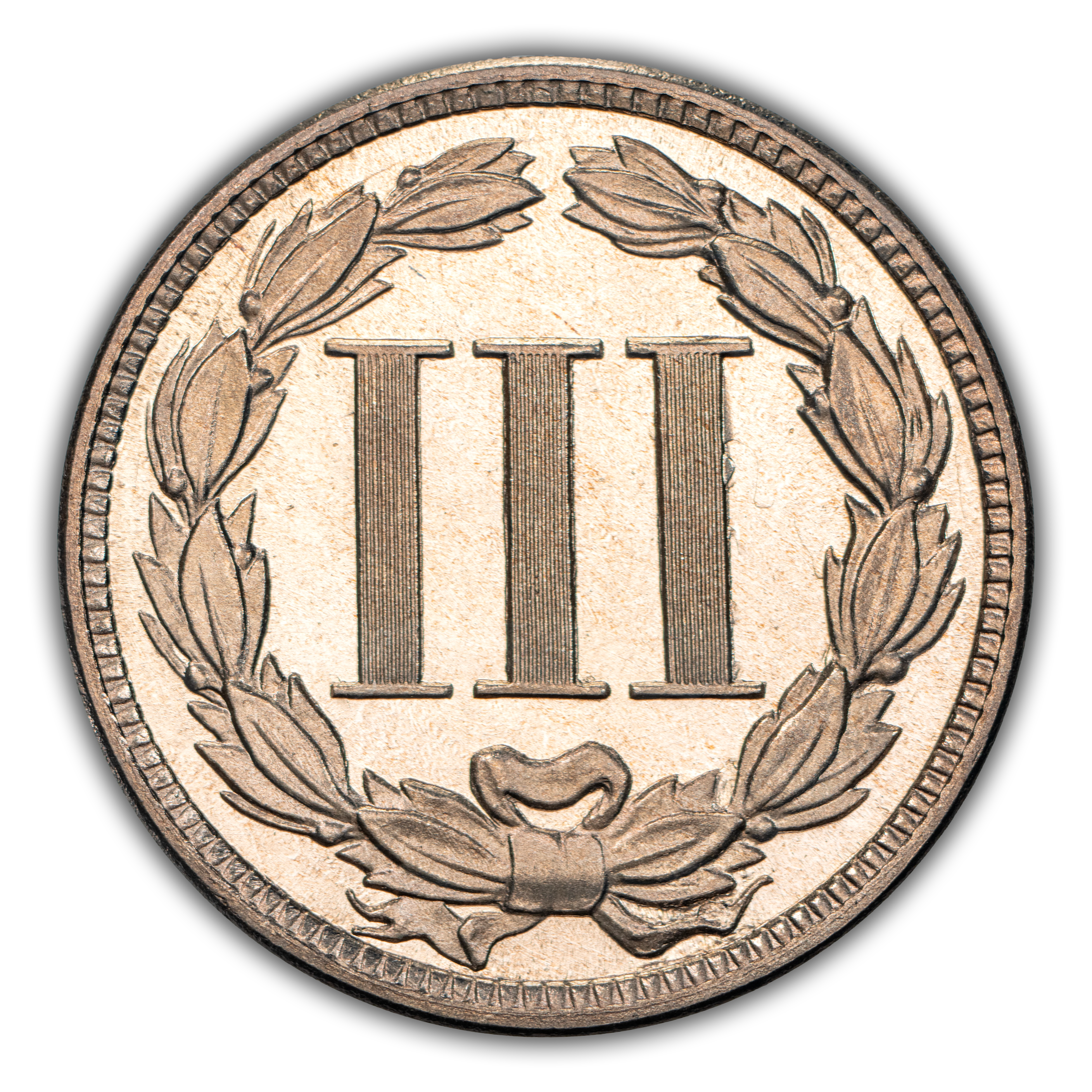 Reverse: The roman numeral III is centered in the design surrounded by a large wreath tied with a bow at the bottom. This design is one of few American coins without wording on one of the sides.